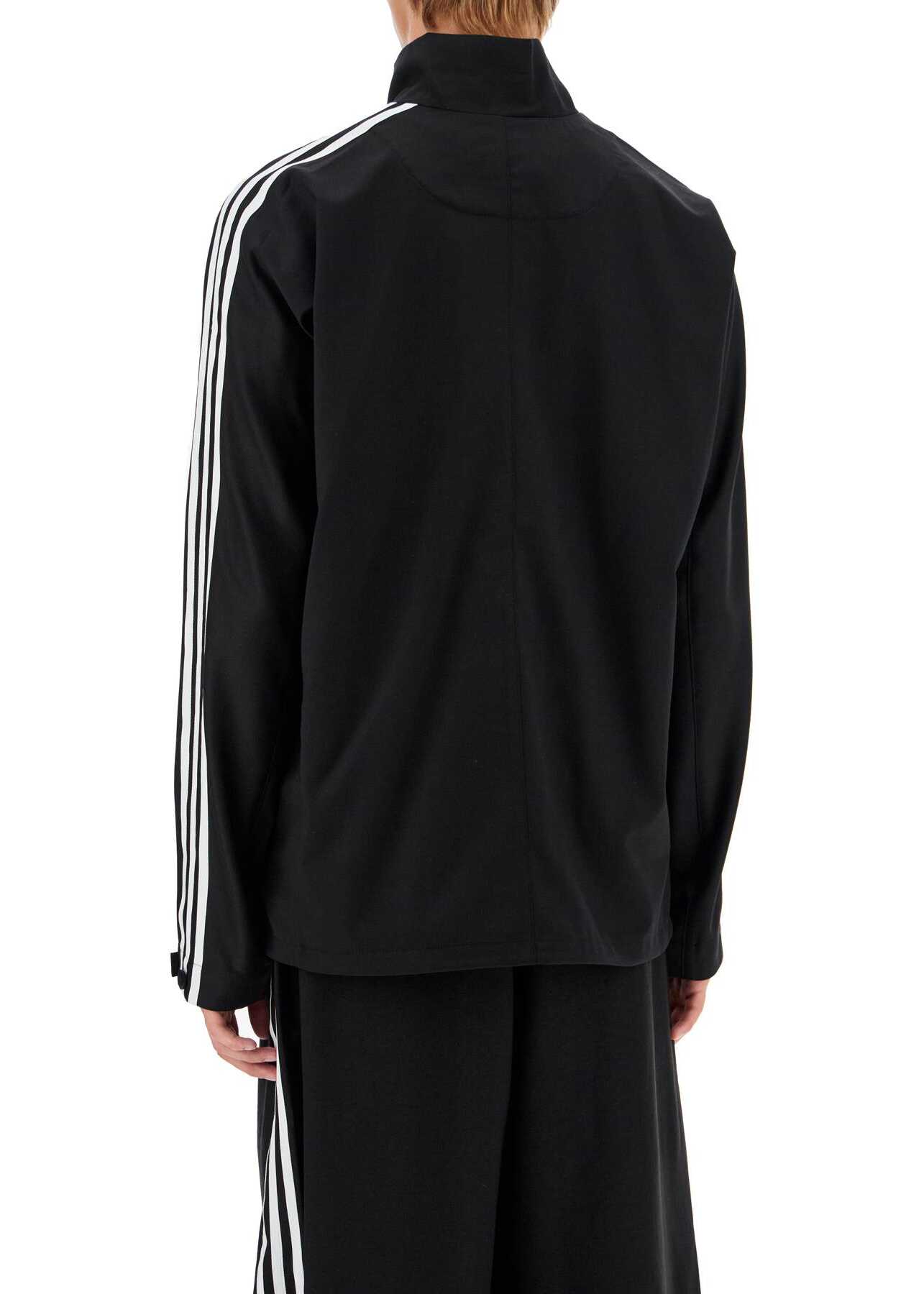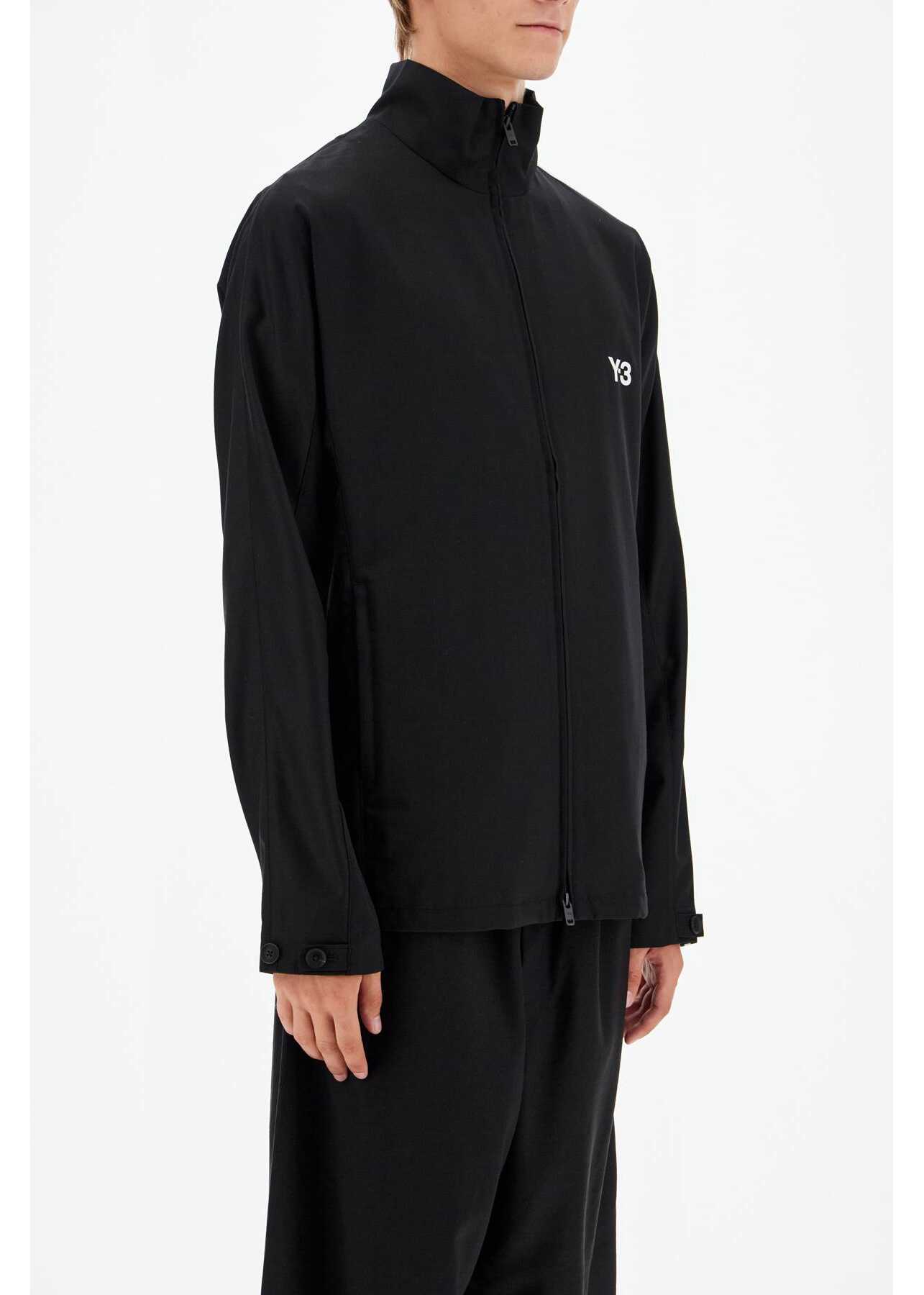 The Y-3 sport jacket is made of lightweight wool blend twill and features a printed logo on the chest and iconic 3-Stripes bands on the sleeves. It has a high collar with a two-way zip closure, side pockets with zips, and adjustable cuffs with tabs and buttons. The interior is unlined. The model is 187 cm tall and wears size M.