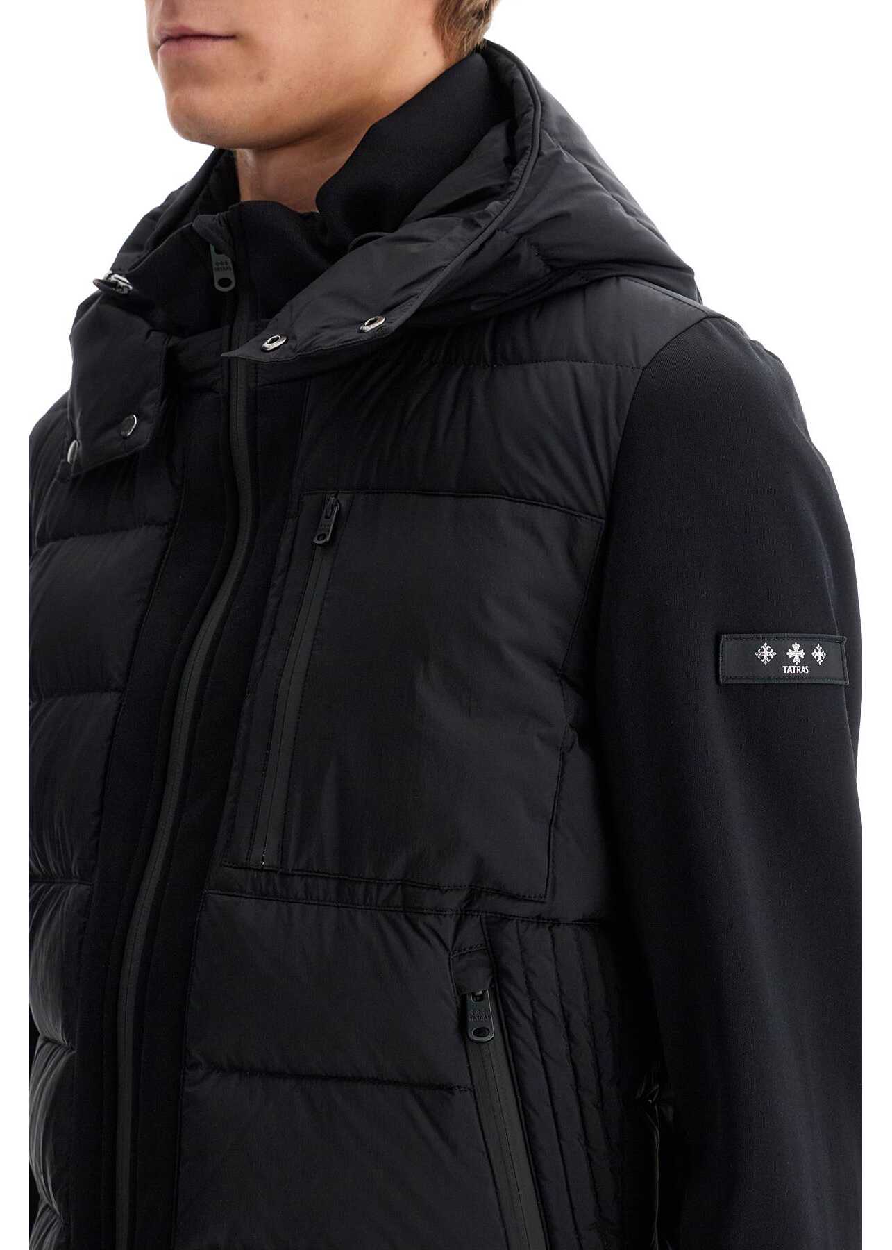 The Tatras hybrid design fitted down jacket is made of quilted nylon with technical jersey sleeves. It features a 90/10 feather and down filling, a cotton blend lining, a removable hood with drawstring, a double zip closure, oblique pockets with heat-sealed zippers, and adjustable cuffs with Velcro straps. The model is 187 cm tall and wears size 3 Tatras.