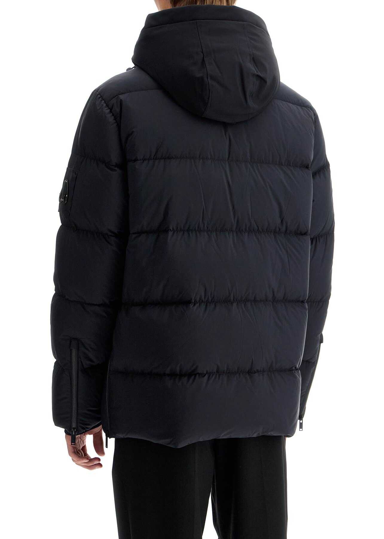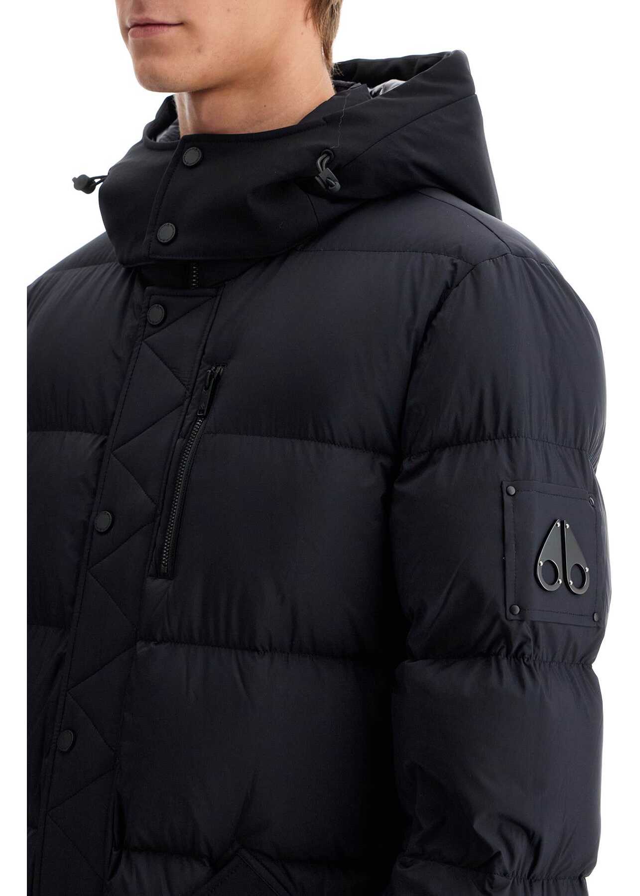The Moose Knuckles Everest 3Q down jacket is made of weather-resistant nylon and filled with 90/10 duck down and feathers. It features a stand-up collar, a removable hood with drawstring, and a snap button closure under the chin. The jacket also has a two-way zip and snap button closure, a chest pocket with zip, two flap pockets, zippered cuffs, and additional jersey inner cuffs. The design is finished with a metal logo on the left sleeve, a small