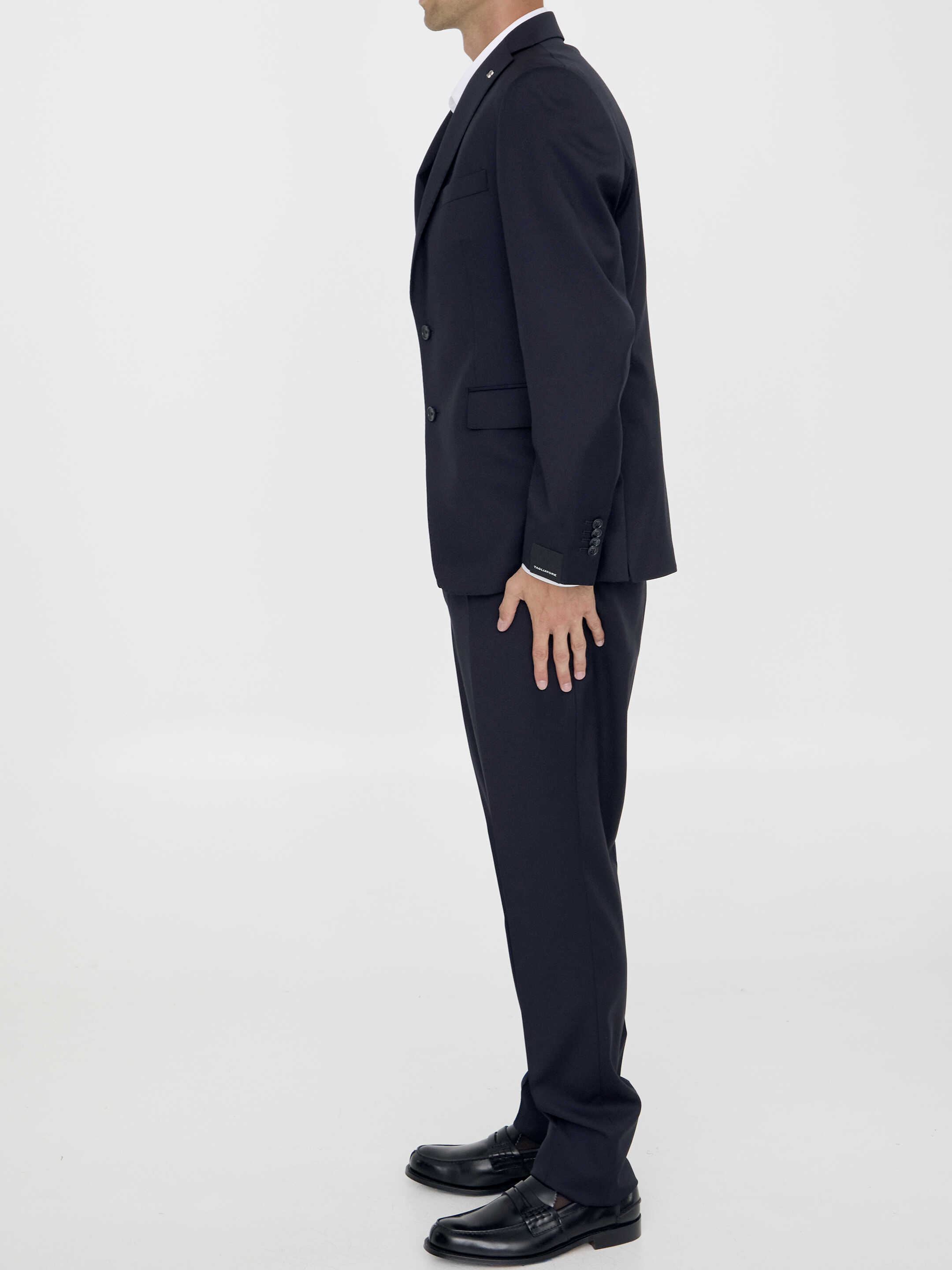 Two-piece suit in black virgin wool with a slightly shiny effect. Single-breasted jacket with peaked lapels and brooch on lapel, front button closure, two front flap pockets, a welt pocket on chest and buttoned cuffs. Straight-leg trousers with zip and button closure, two side welt pockets, two rear buttoned welt pockets and belt loops. Regular fit.