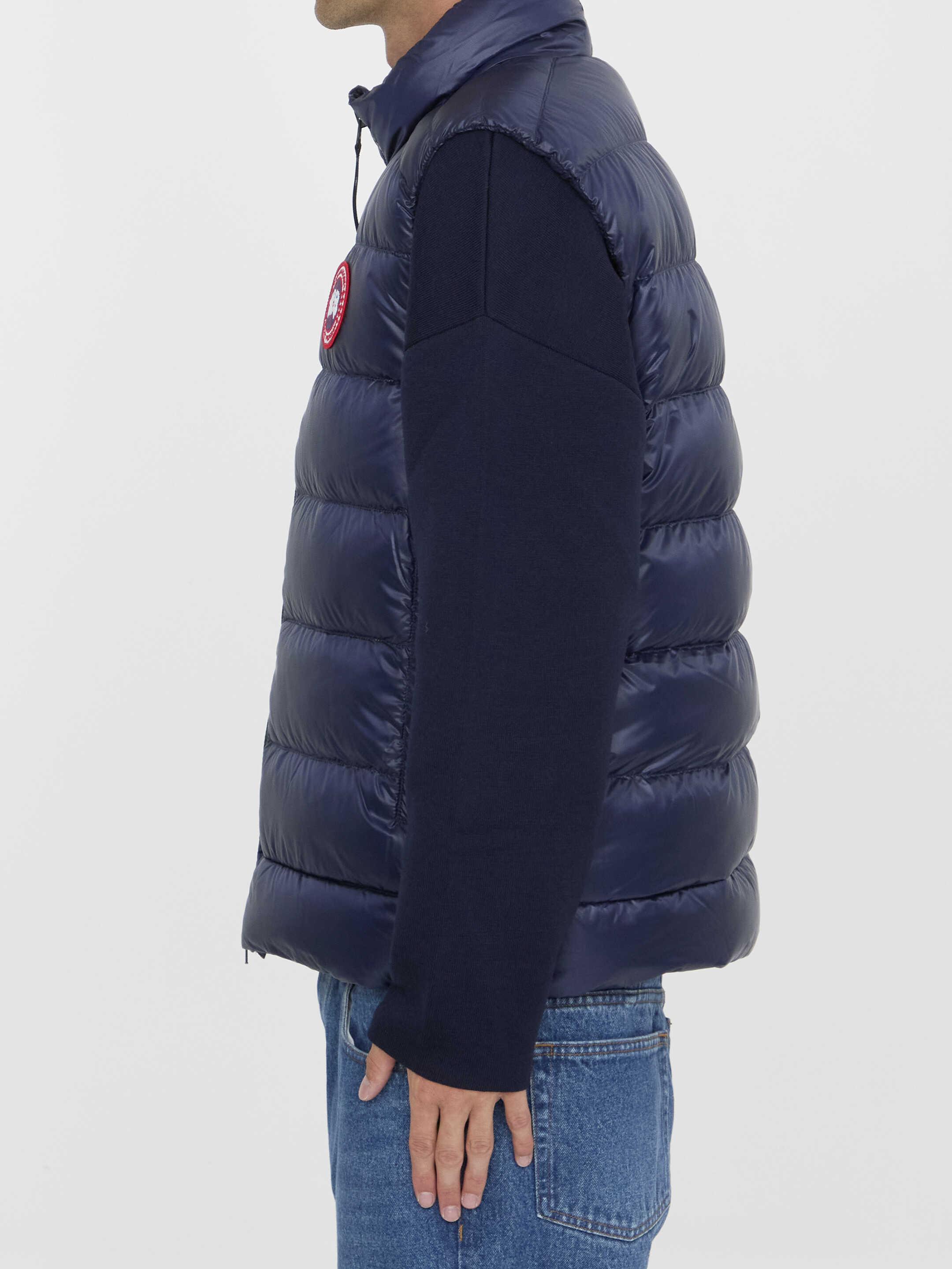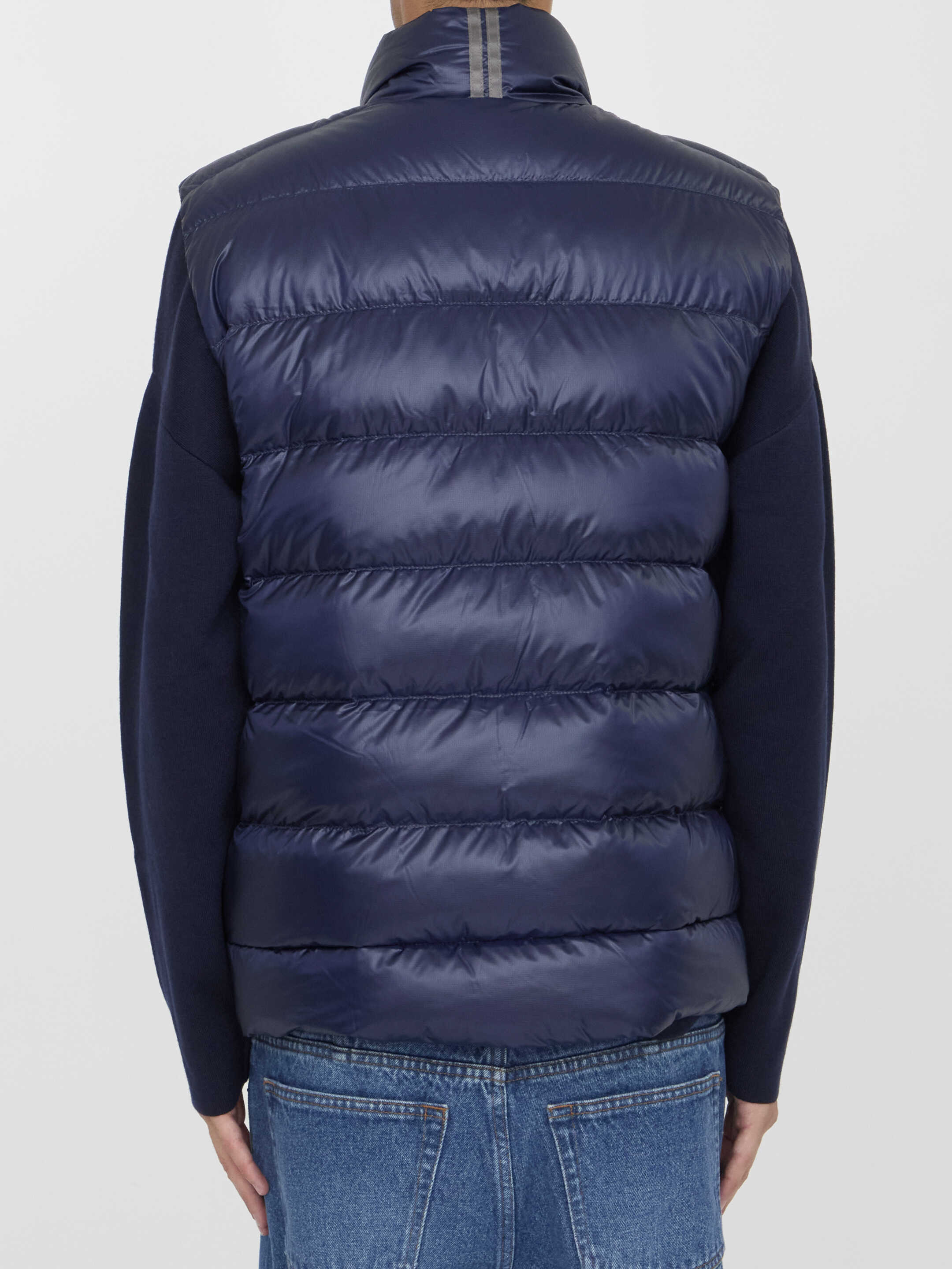Crofton packable vest in blue recycled nylon ripstop with ultralight down filling. It features front two-way zip closure, two side zip pockets and patch on chest. Waterproof and windproof. Regular fit.