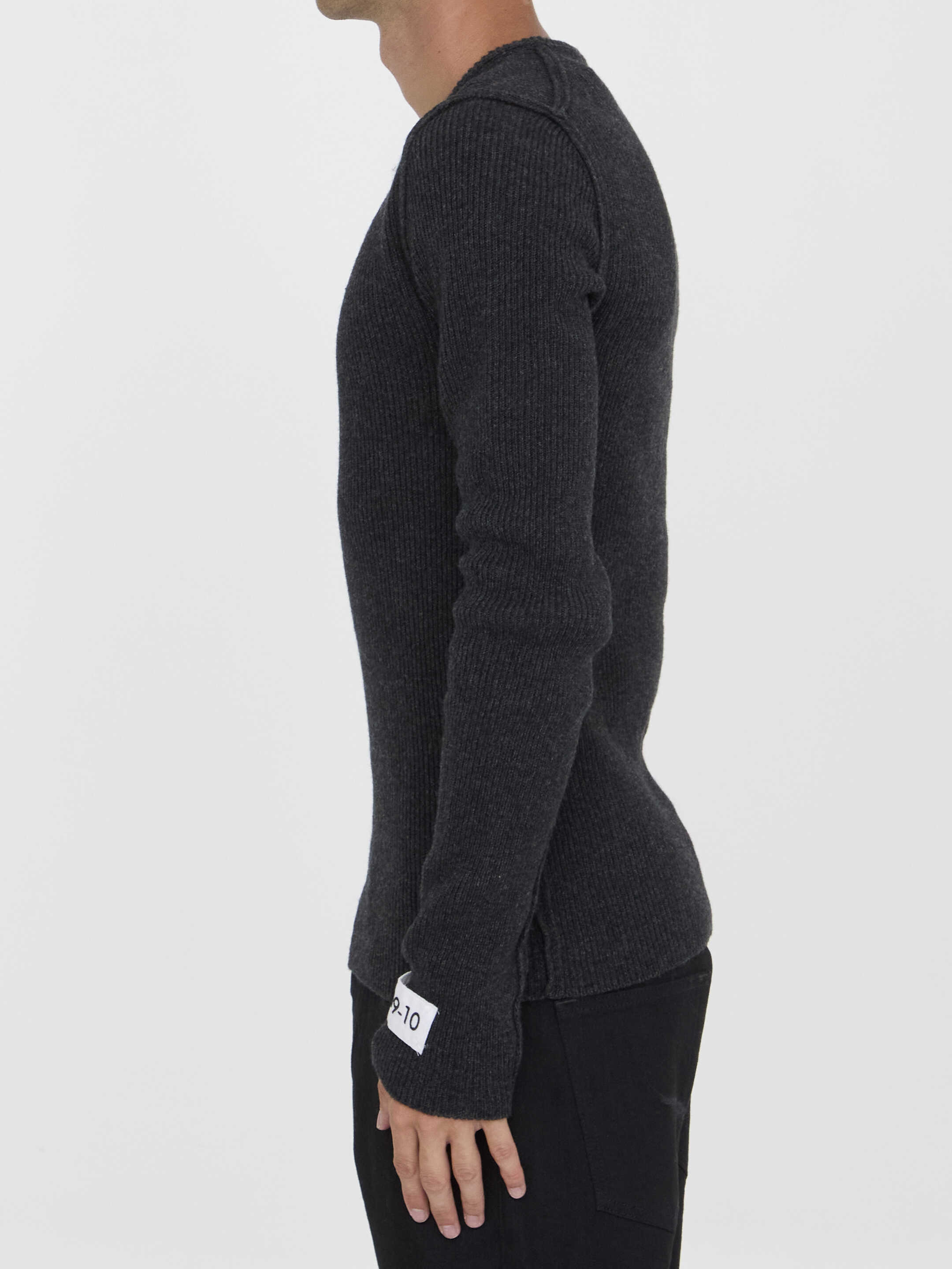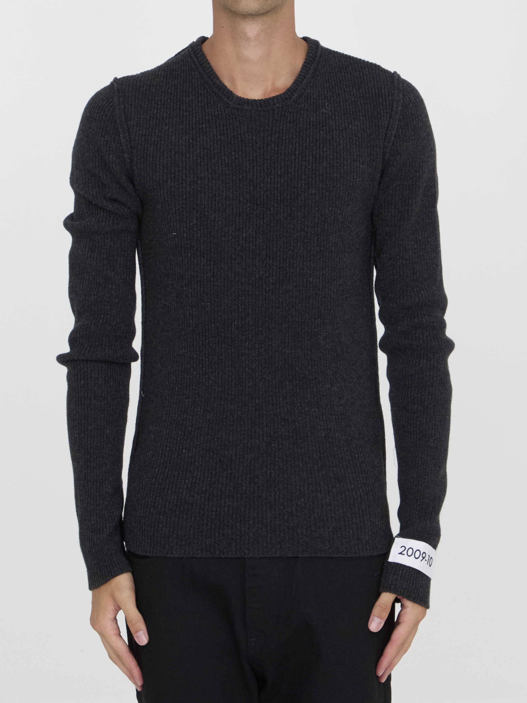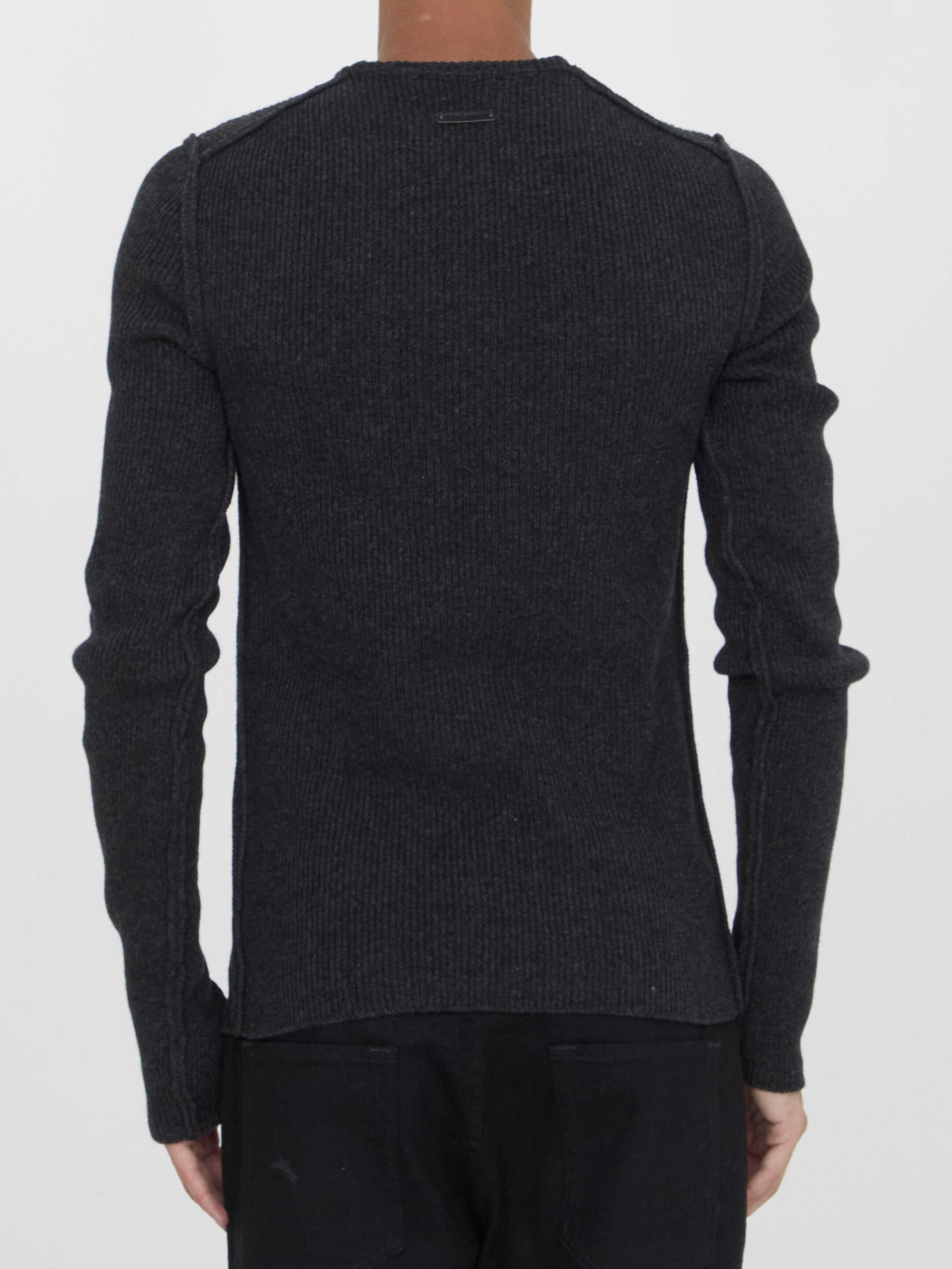 Long-sleeved crewneck jumper in grey wool blend. It features external seams and a patch on the sleeve.