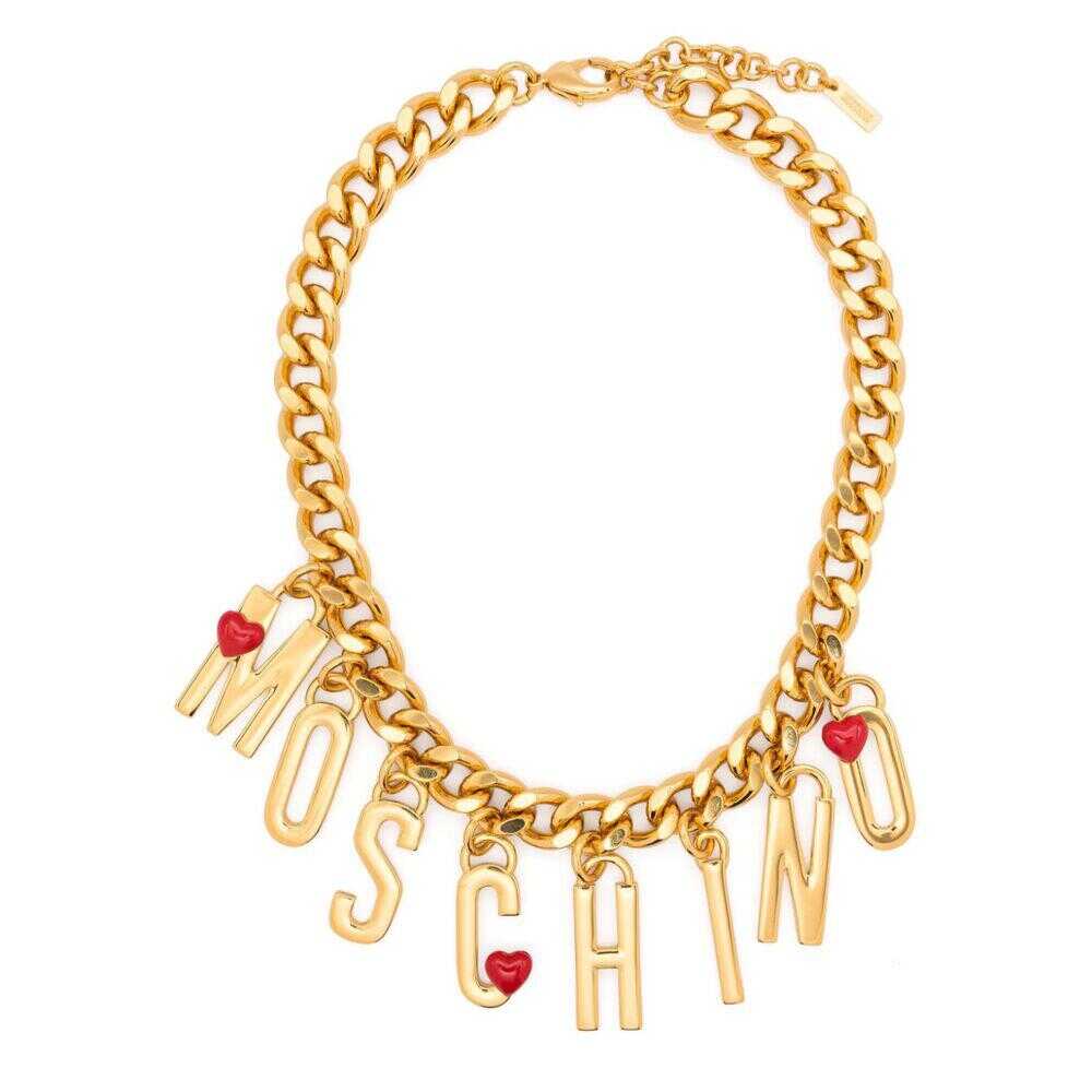 Gold-tone logo lettering-charm heart motif logo plaque chunky curb chain lobster claw fastening glossy finish curb chain