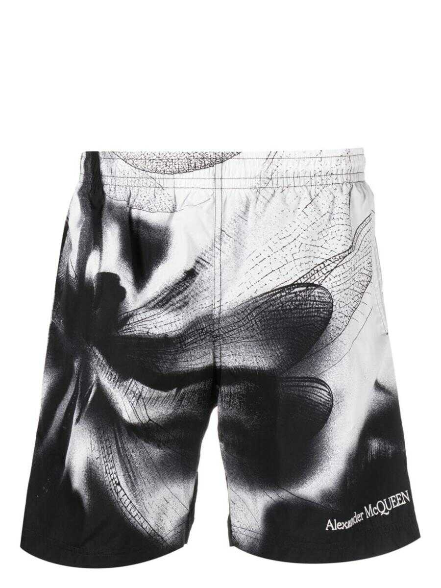 black/white Dragonfly print embroidered logo at the leg elasticated waistband with internal drawstring two side slit pockets straight leg thigh-length mesh lining Be mindful to try on swimwear over your own garments.