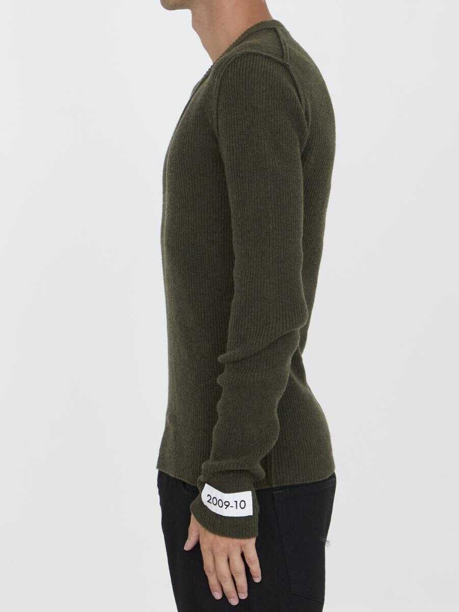 Green wool ribbed jumper with a deep V-neckline. It features external stitching and a patch on the sleeve.