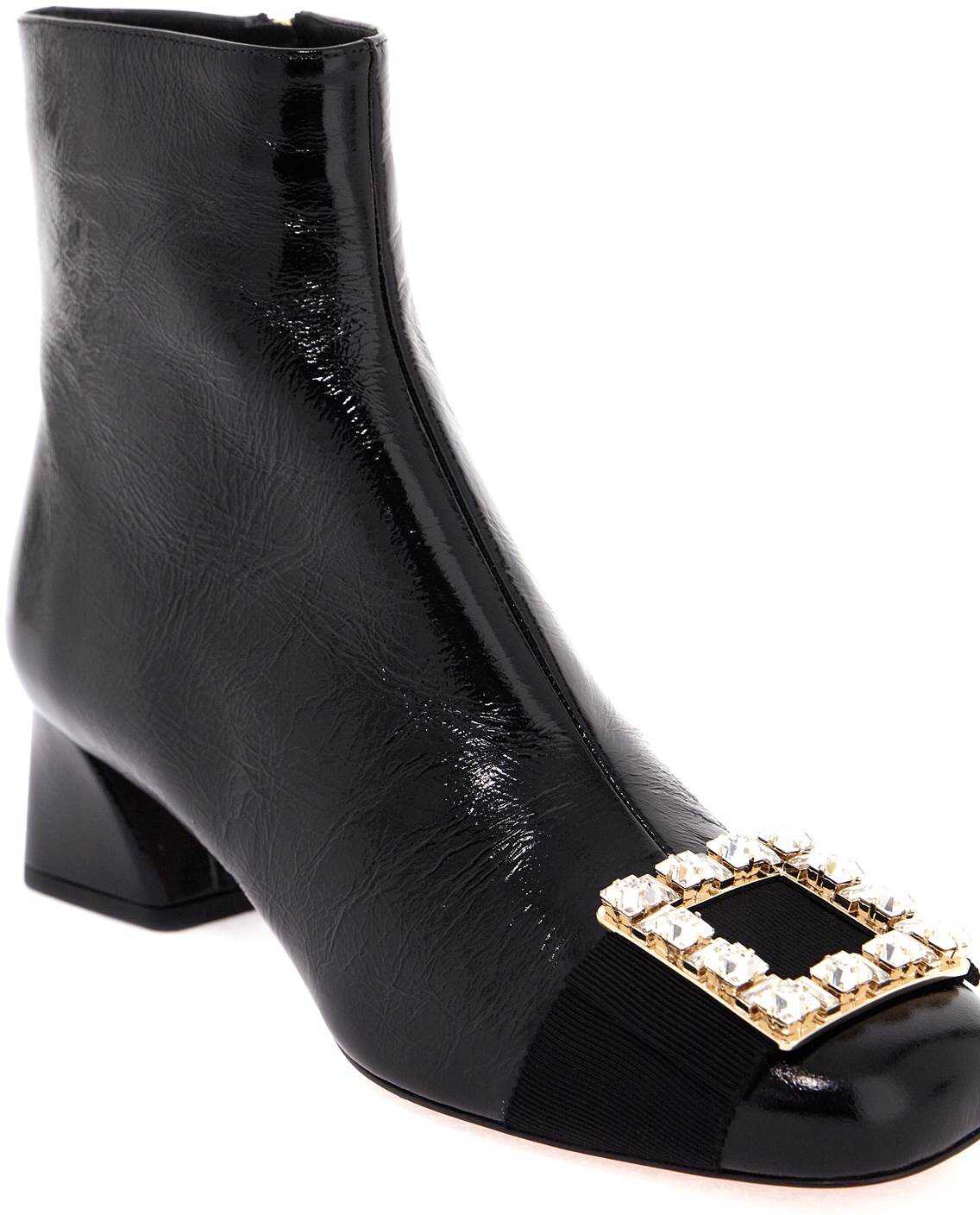 The Trè s Vivier ankle boots by Roger Vivier are made of patent leather with a crinkled effect and adorned with a crystal buckle on the toe. They feature a side zip closure, a geometric chunky heel, a leather interior, and a leather sole.