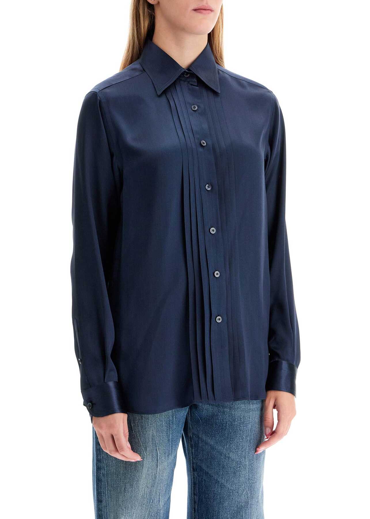 This Tom Ford shirt is made of fluid pure silk charmeuse and features a front button closure enriched with a pleated pattern. It has an Italian collar, rounded cuffs with a single button, and a shaped hem with side slits. The fit is relaxed with a straight cut. The model is 177 cm tall and wears an IT size 40.