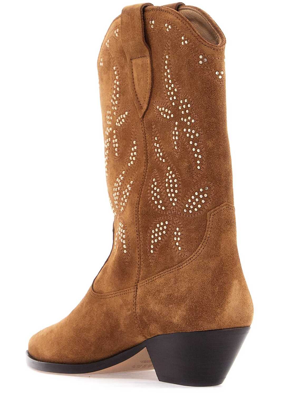 The Duerto Texan boots by Isabel Marant are made of suede leather with double decorative stitching and silver micro studs. They feature a pointed toe, side loops, and an oblique heel in leather. The interior is lined with leather and the sole is also made of leather.
