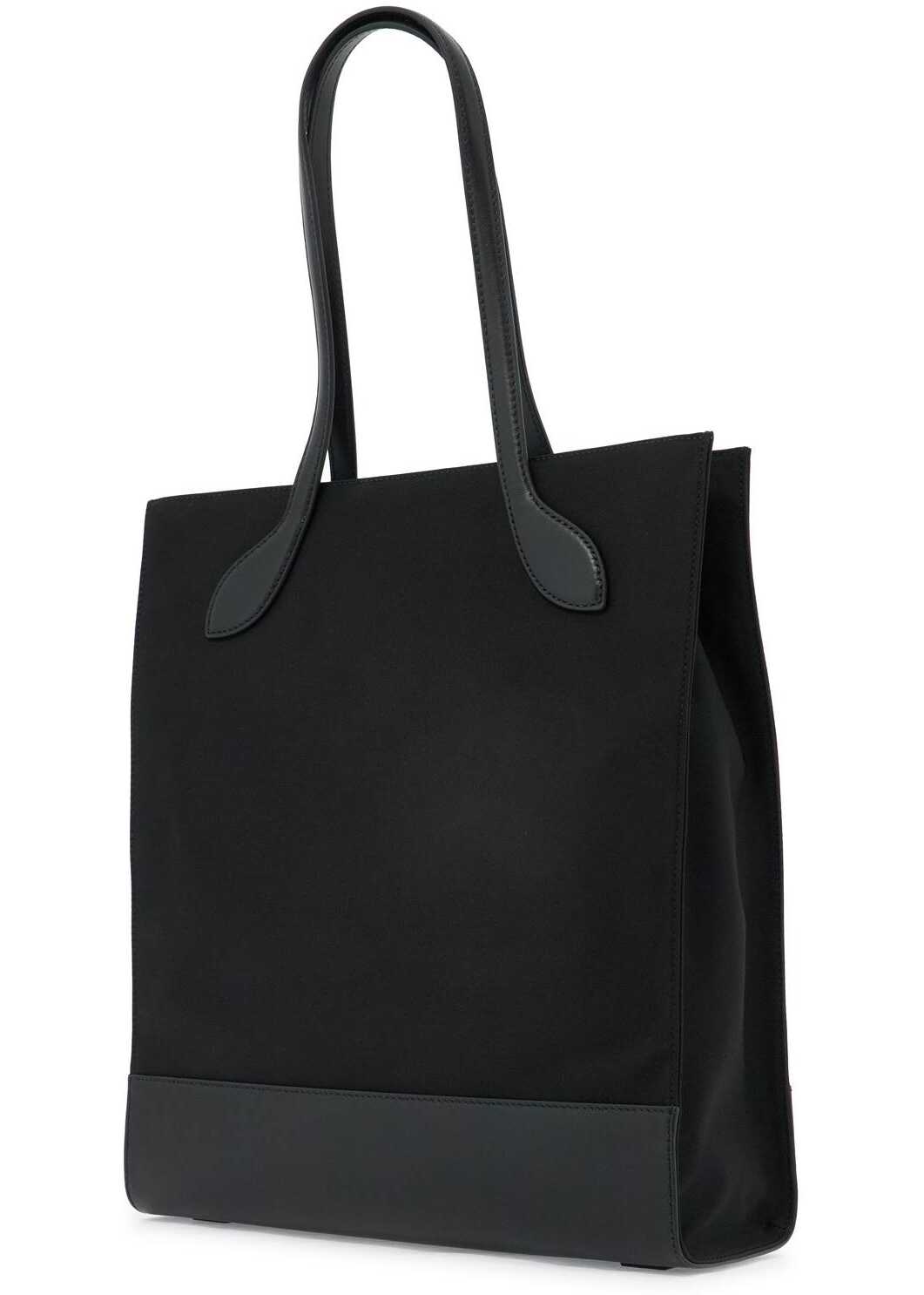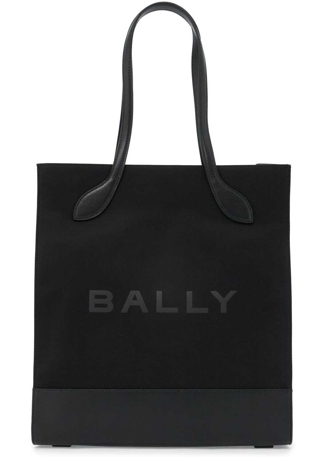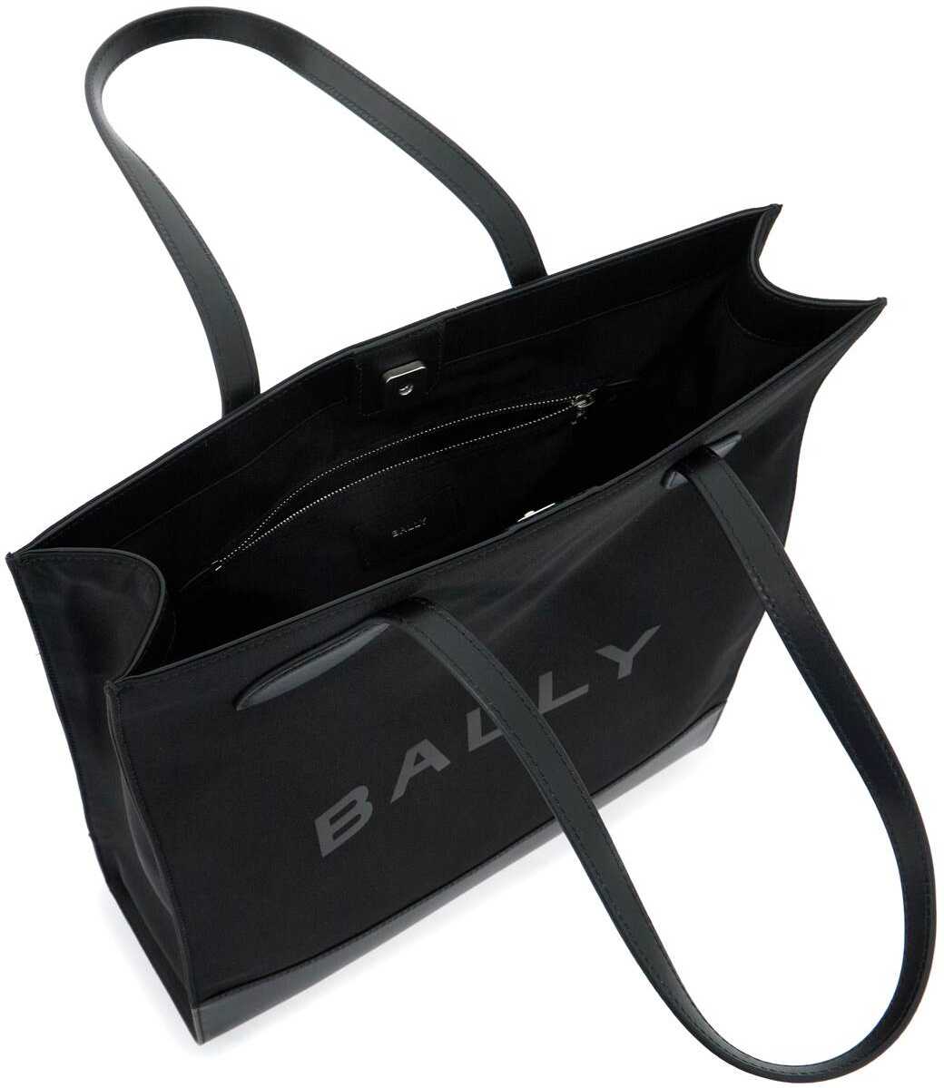 The Bally N/S tote bag is made of nylon with leather base and handles, featuring a tonal printed logo lettering. It has a magnetic closure and a lined interior with two open pockets and one zip pocket.