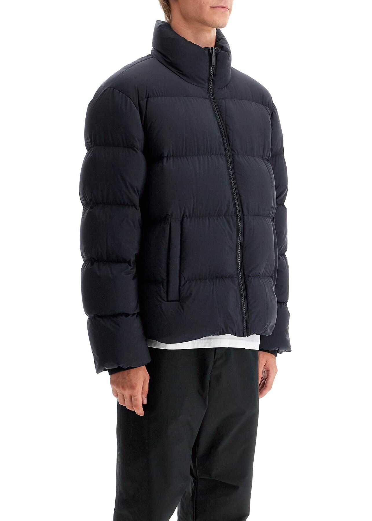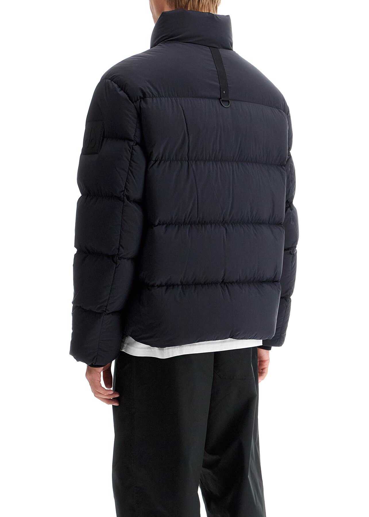 Reversible down jacket by Moose Knuckles with one side in matte nylon featuring side pockets with snap button closure and a rubber logo patch on the left sleeve, and the other side in glossy nylon with contrasting lettering logo print, two open pockets and two zippered pockets, and removable straps in branded ribbon. Regular fit. The model is 187 cm tall and wears size L.