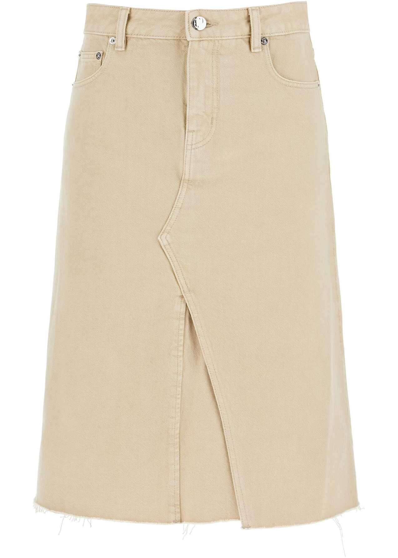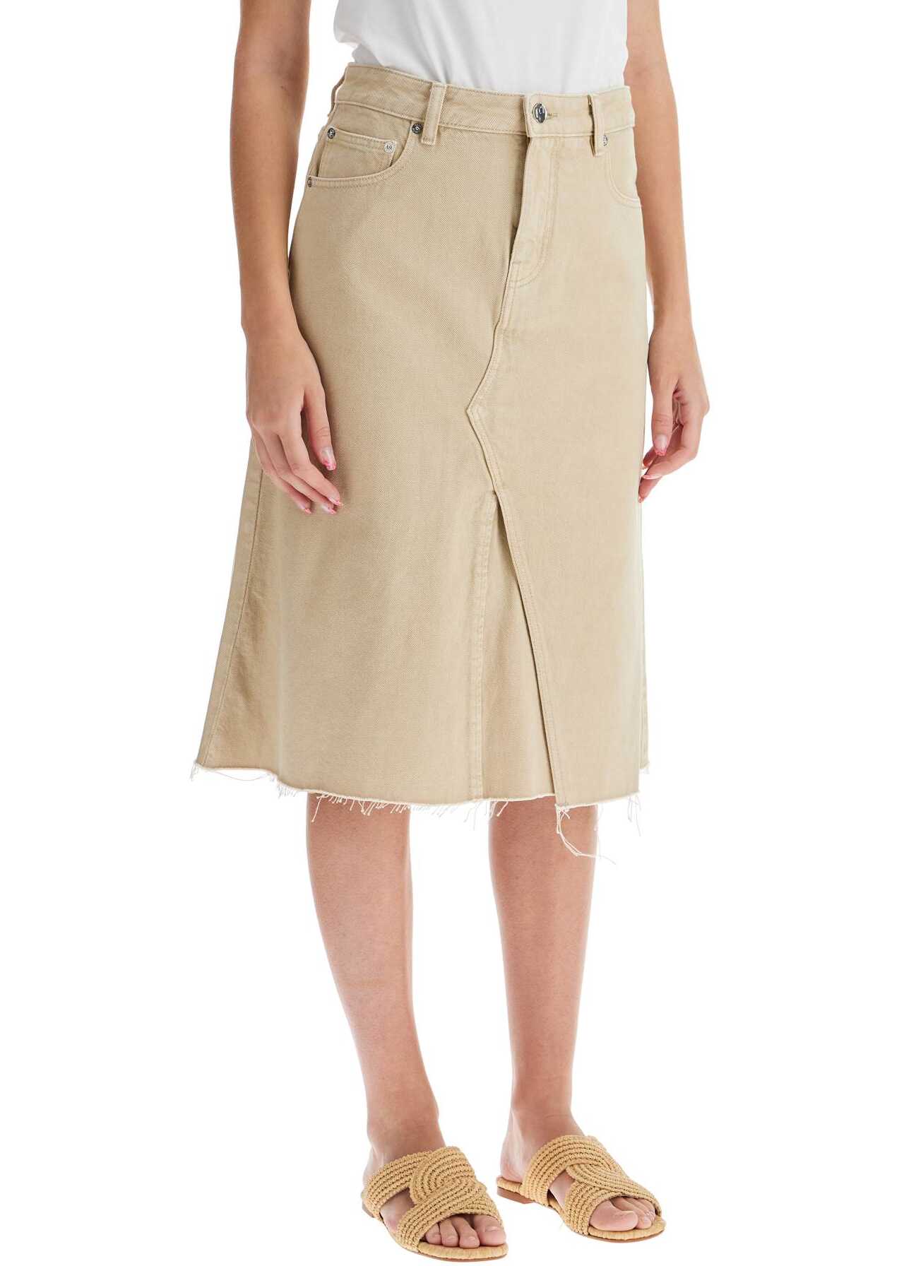 This midi skirt by Tory Burch is made of pure cotton overdyed denim, with a trapeze cut featuring an overlapping design. It has five pockets, a branded button closure and hidden zip, belt loops, and a frayed raw hem. The model is 177 cm tall and wears a US size 2.