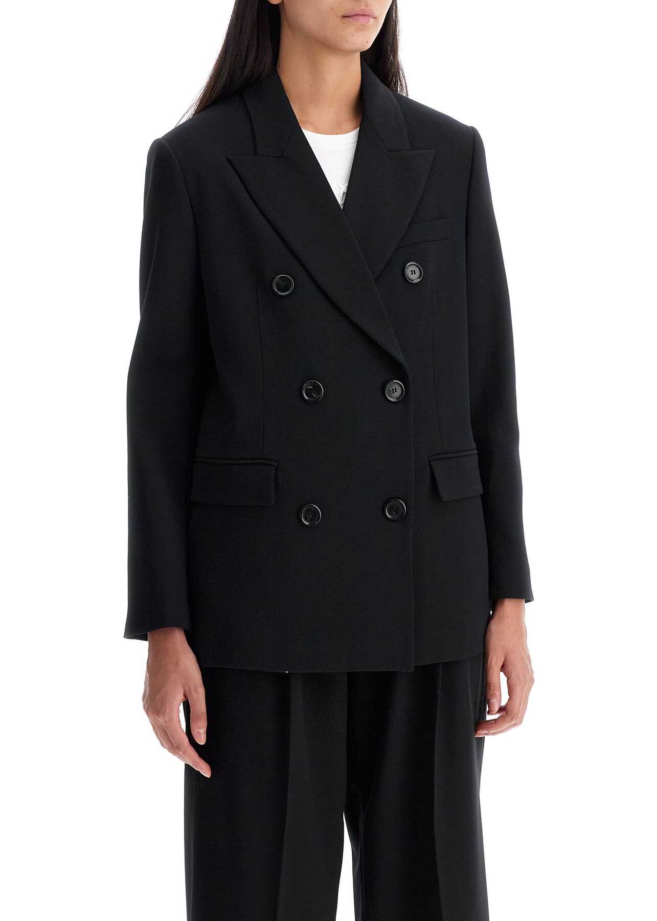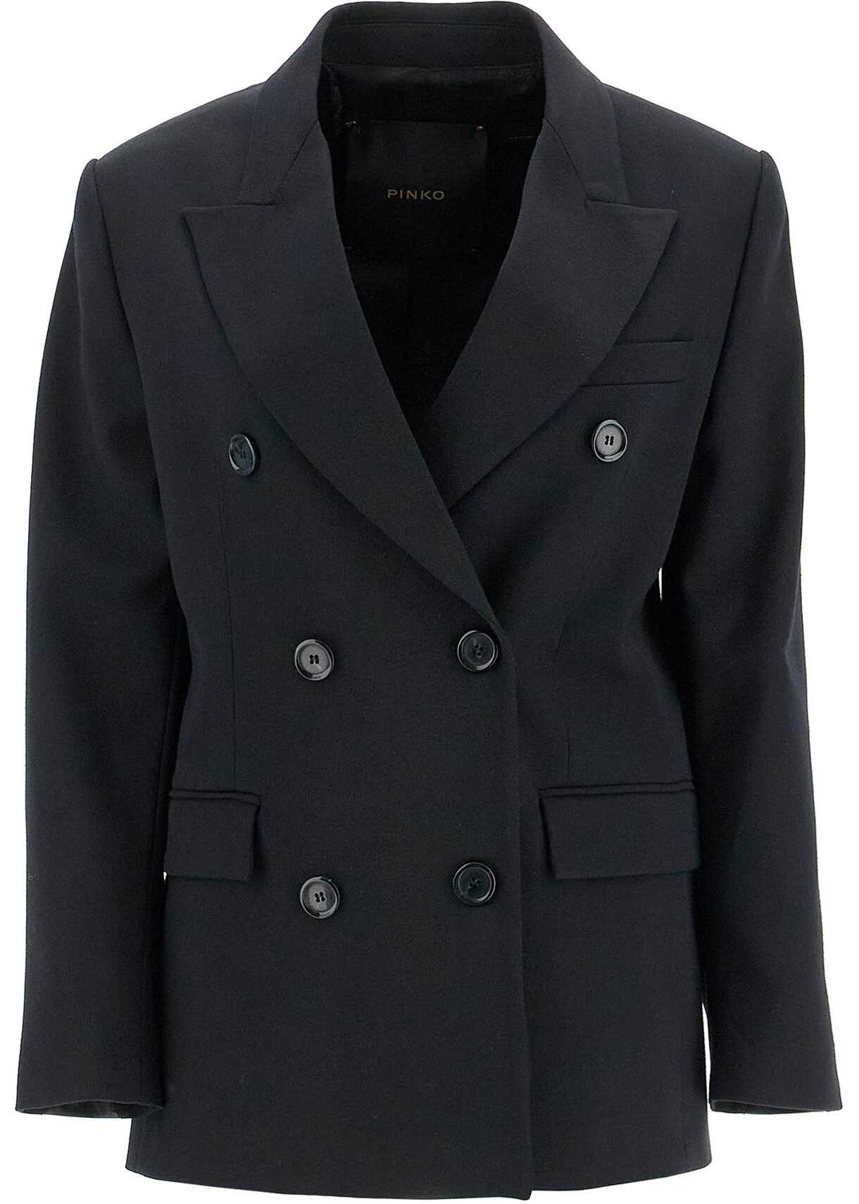 This Pinko double-breasted blazer is made of stretch wool twill with a notched lapel, chest pocket, and front flap pockets. The interior is fully lined and has a regular fit. The model is 177 cm tall and wears an IT size 38.
