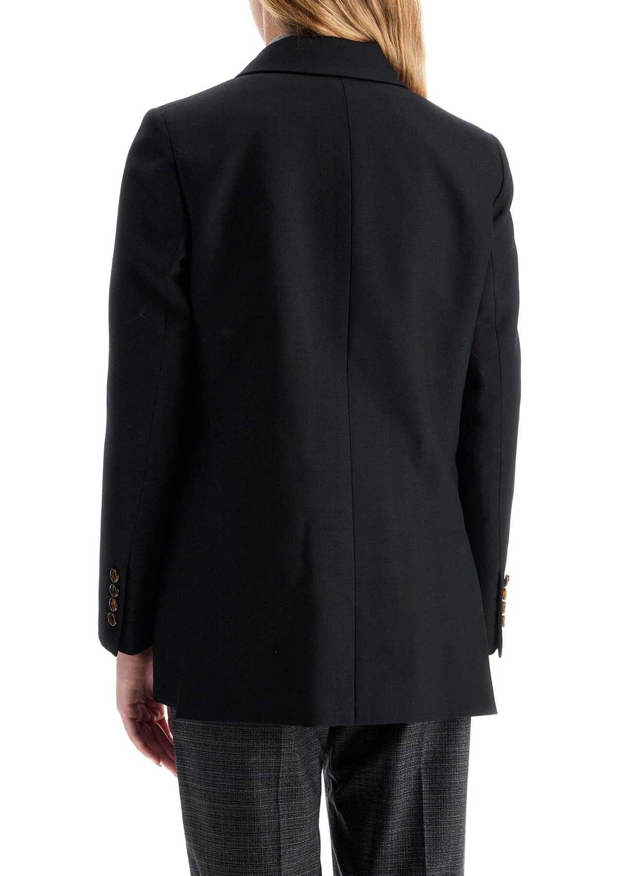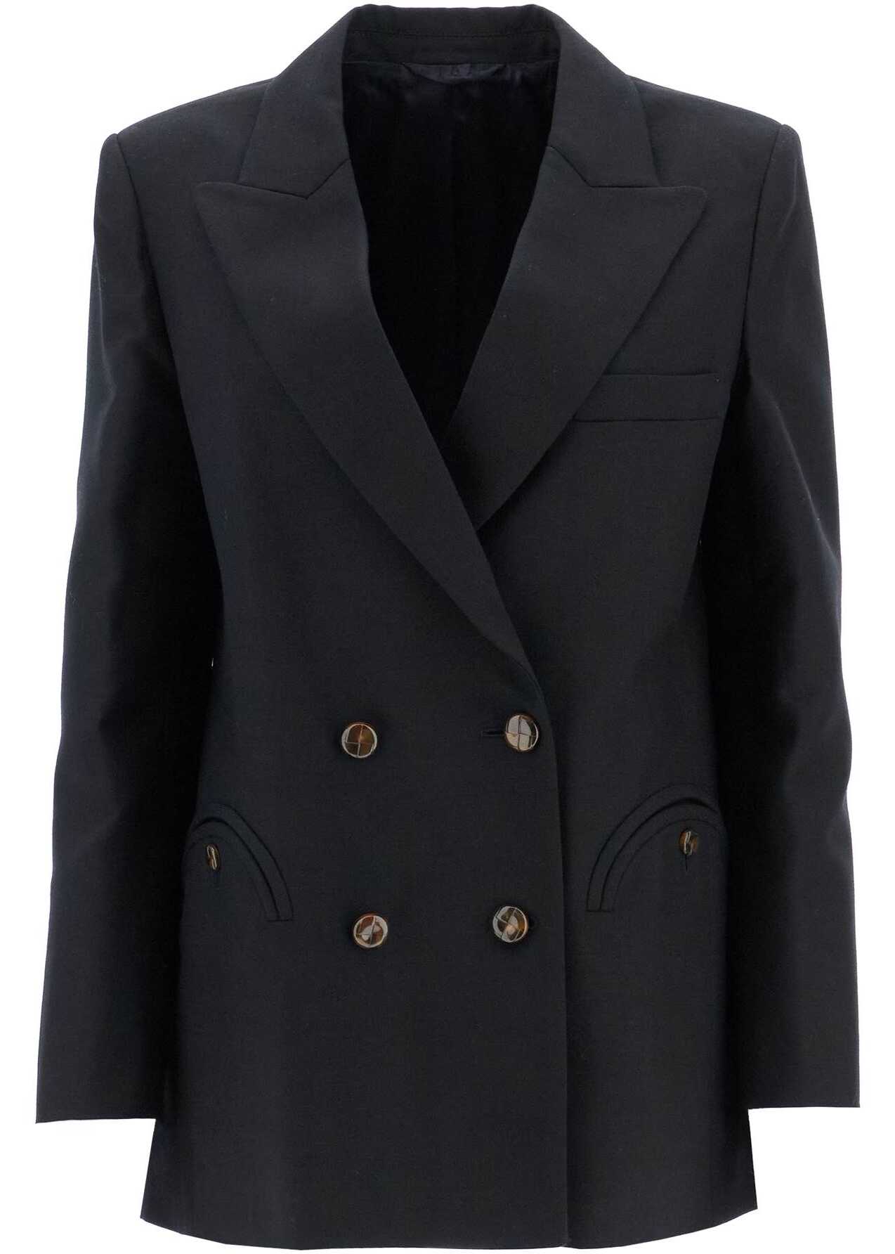 Blazé Milano blazer made from light wool cavalry twill, with double-breasted design characterized by gold-tone metal embossed-button closure. It features peak lapel, a chest welt pocket, Smiley pockets with buttons, buttoned cuffs and back-side slits. Lined in monogram viscose and provided with internal pockets. Relaxed fit with straight cut and slightly padded shoulders. The model is 177 cm tall and wears size 0 Blazé Milano.