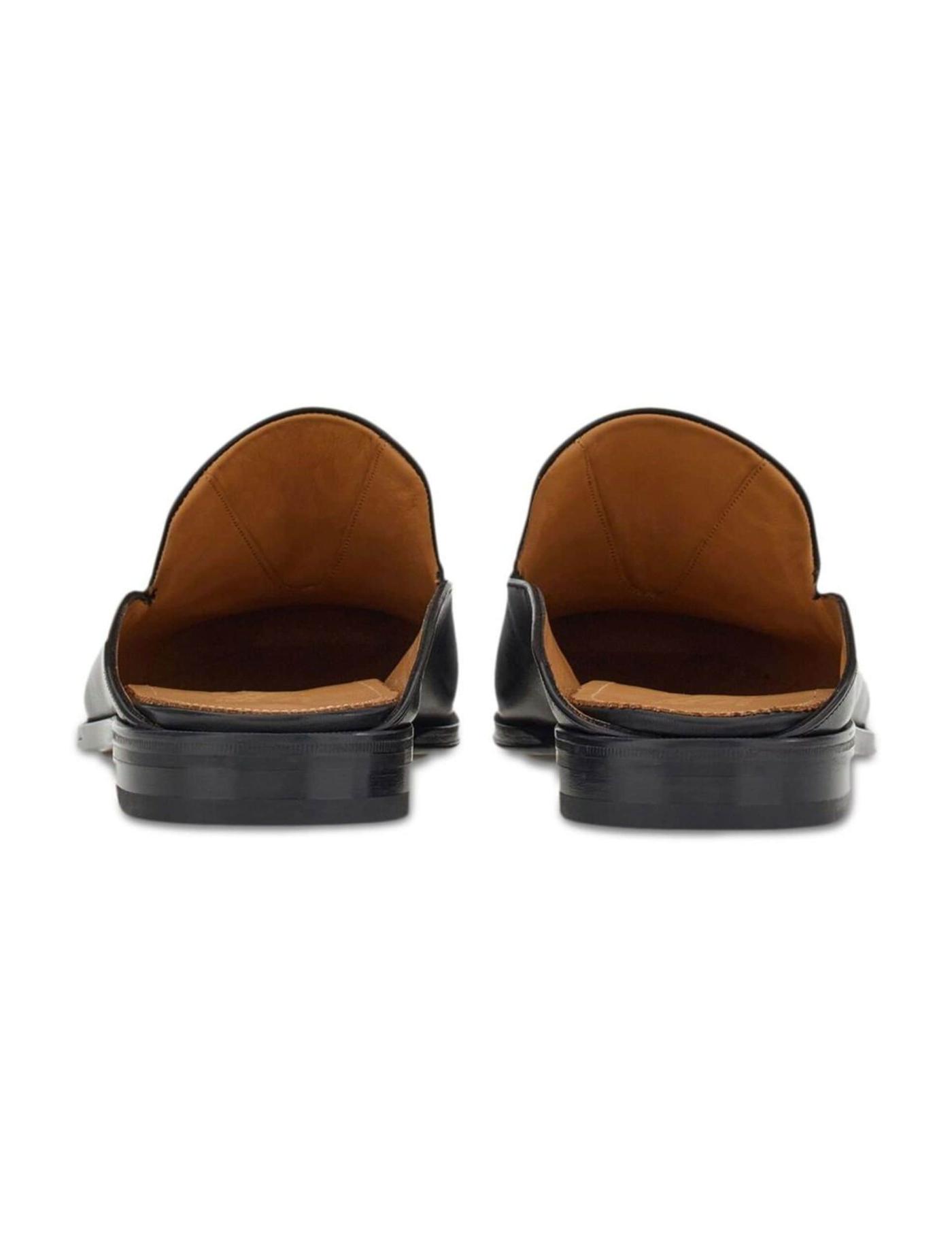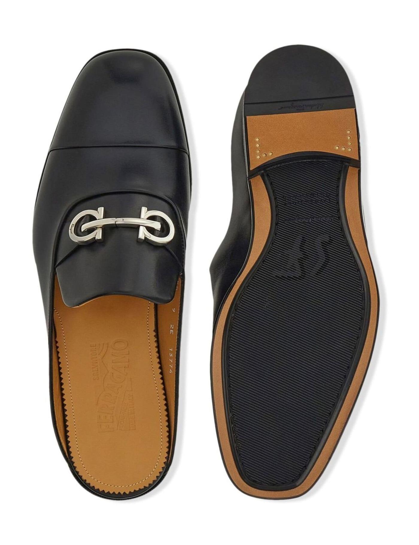Ferragamo combines style, function and innovation in the creation of these black backless leather loafers. Crafted following a construction method known as 'Originali', the sole has been applied with a series of operations carried out almost entirely by hand.