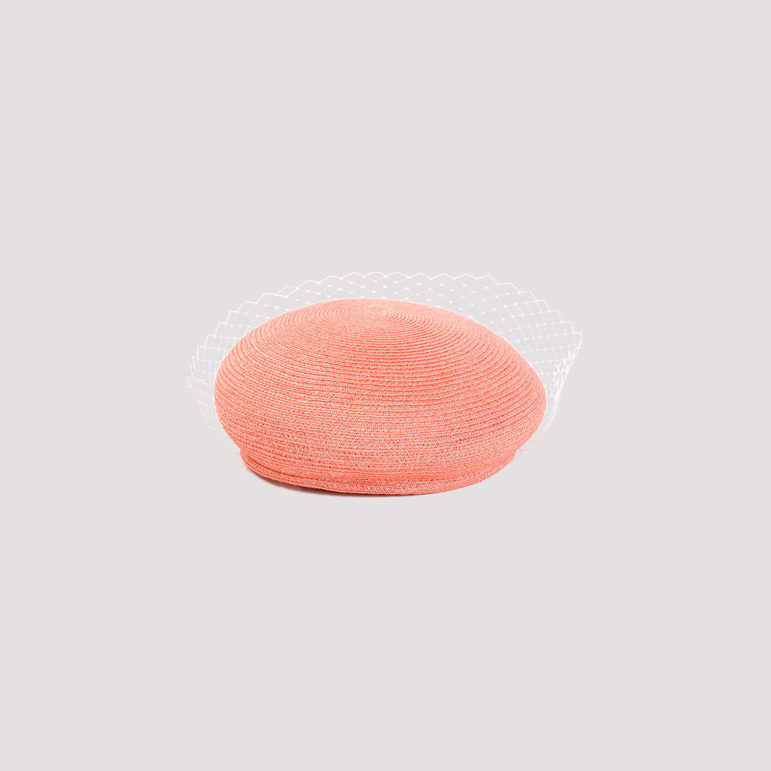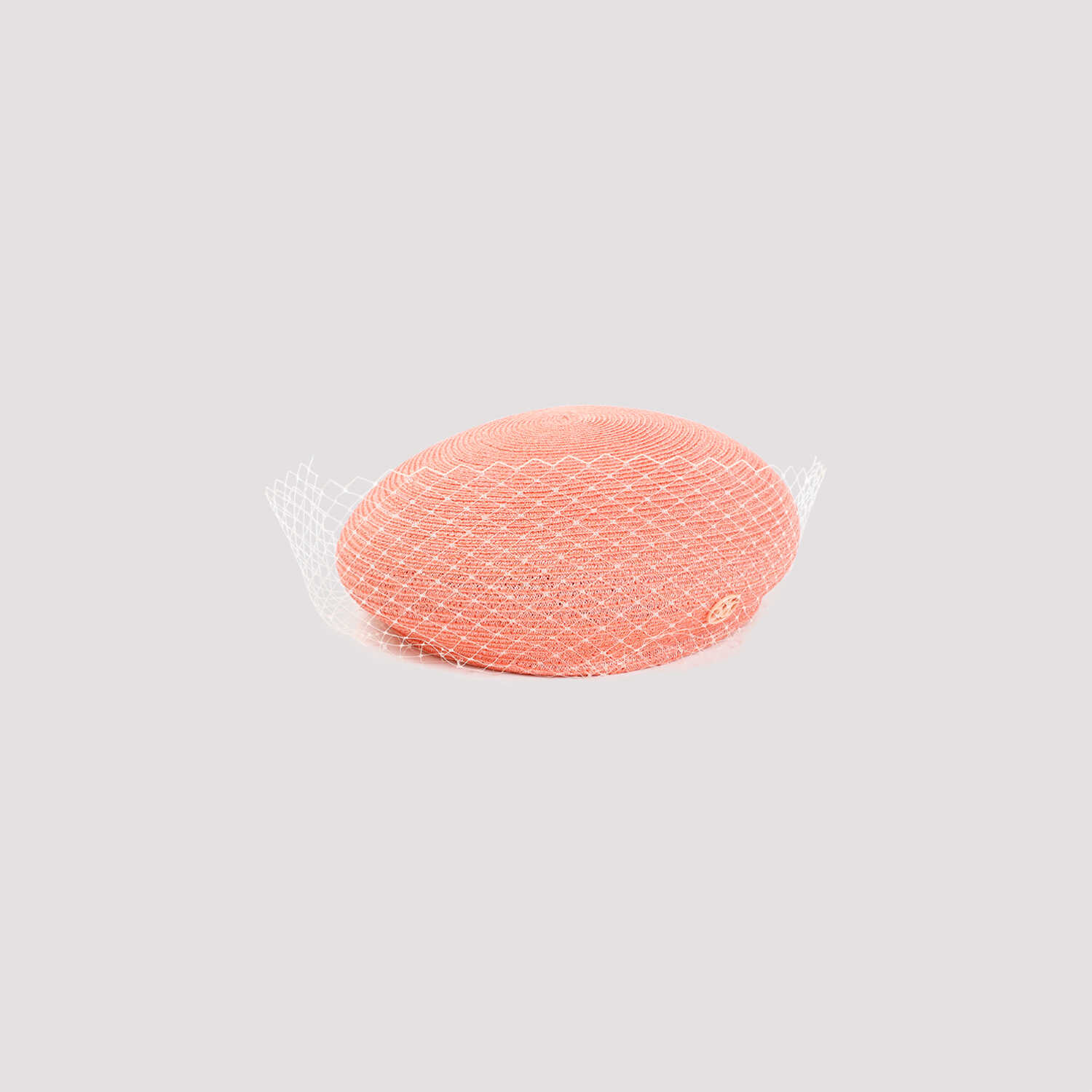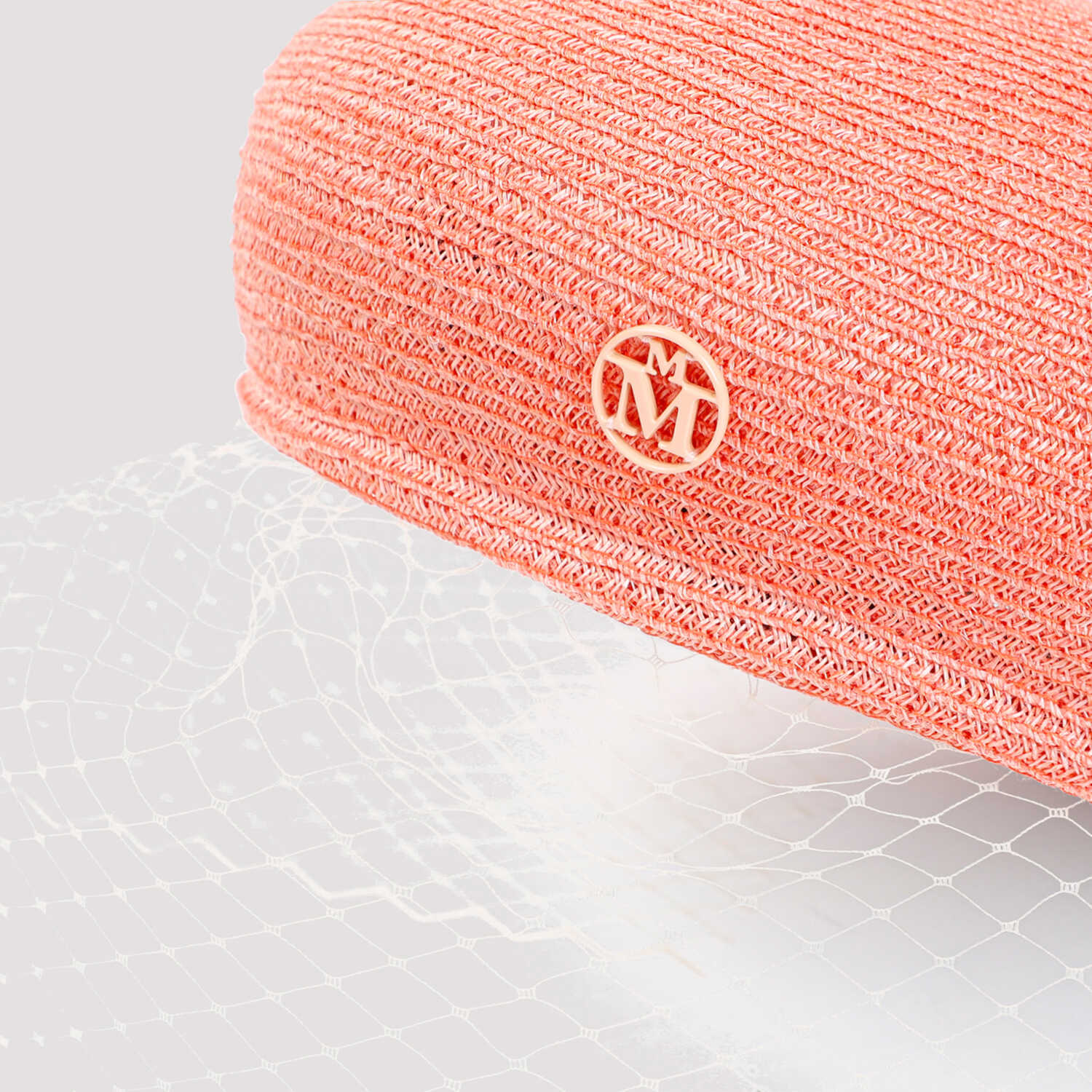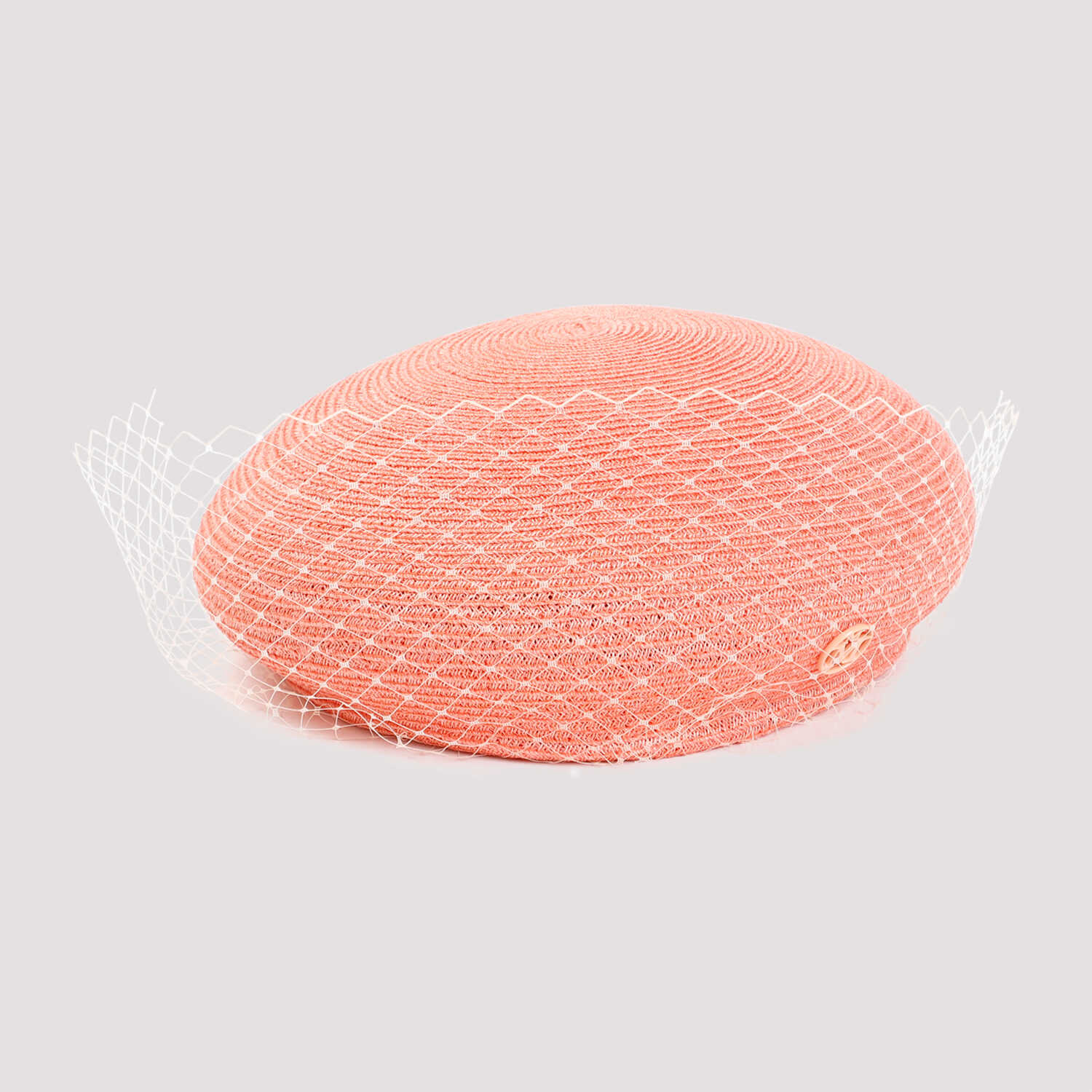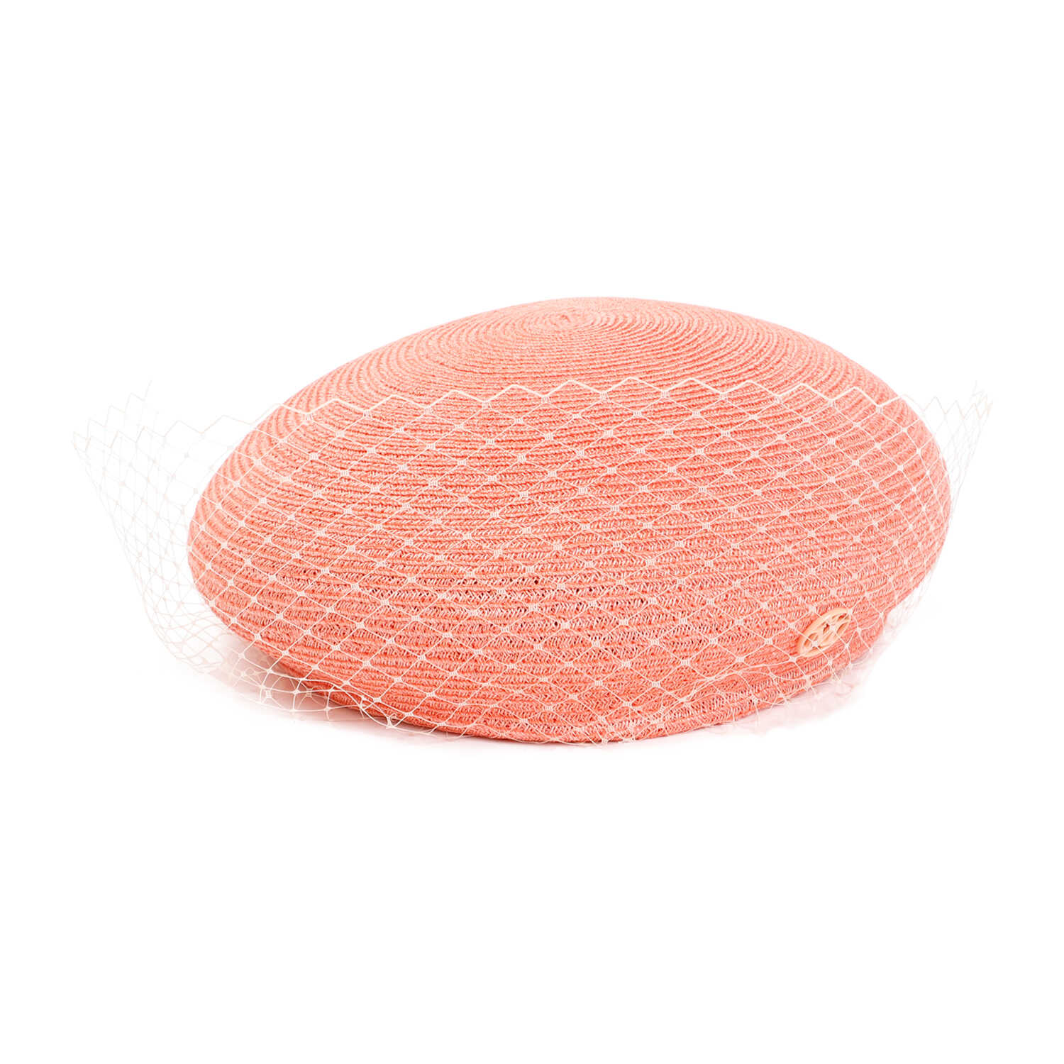 Maison Michel New Bonnie Peach Hemp Hat. Crafted in knitted peach hemp, beret design, logo plaque on the side, white mesh veil.