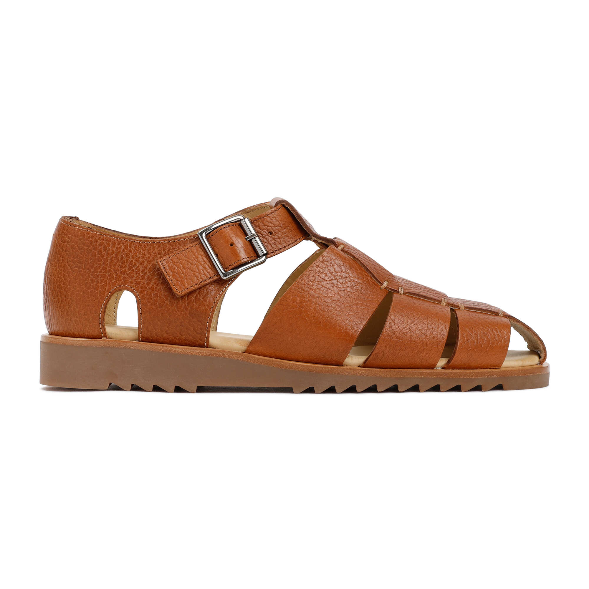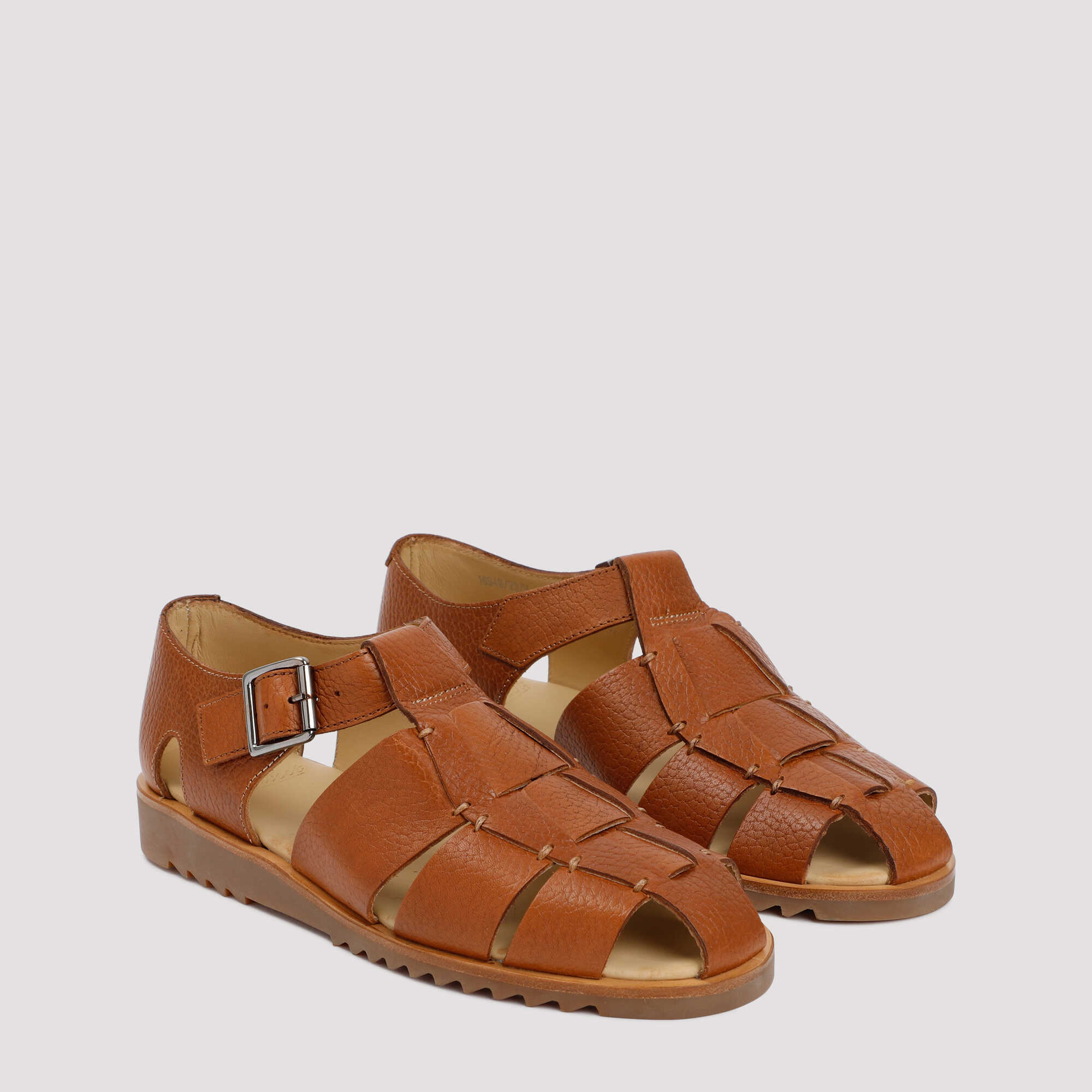 Paraboot Brown Leather Pacific Sandals. Upper crafted in pure brown grained leather. Fisherman construction, adjustable belted ankle strap, logoed insole, rubber outsole, leather lining.