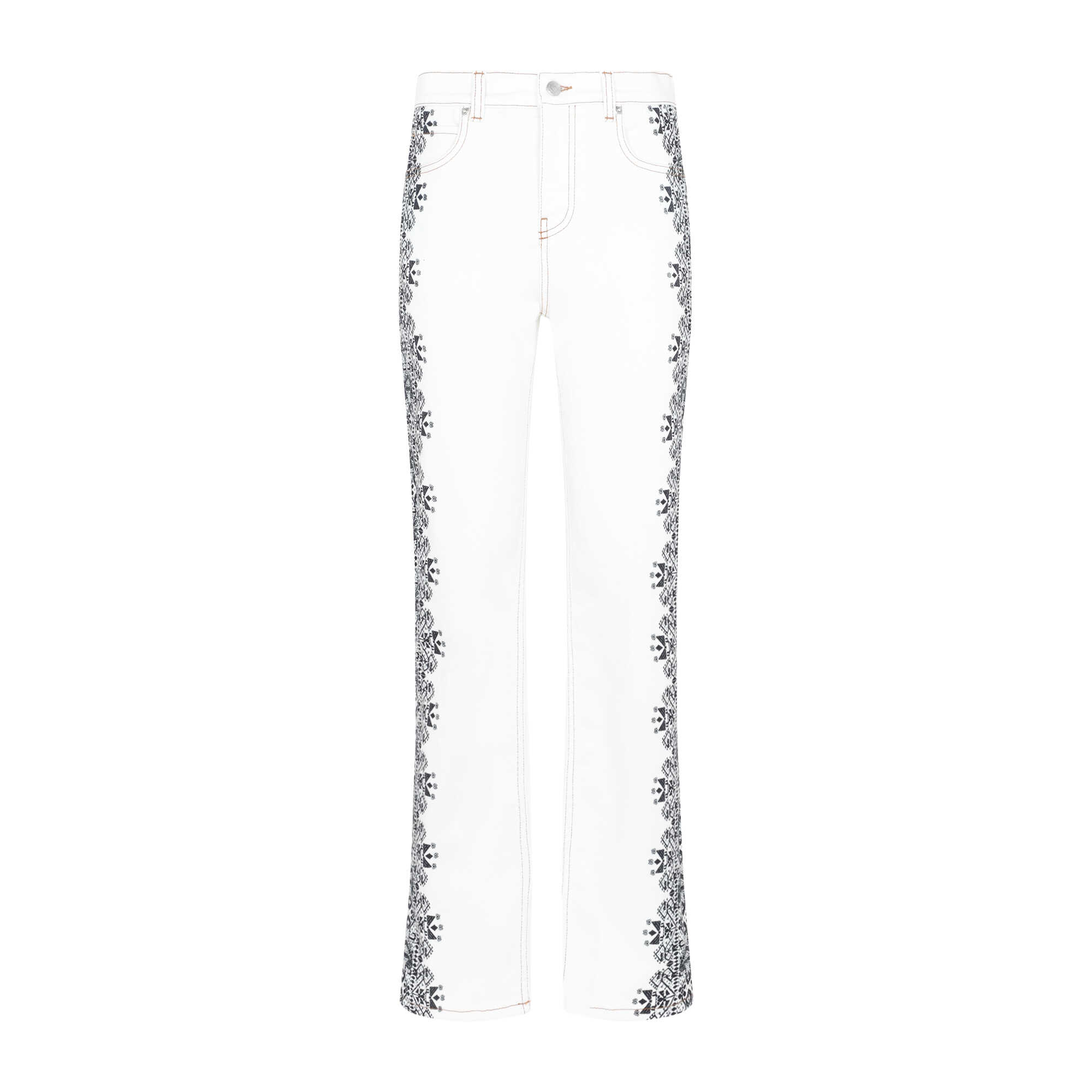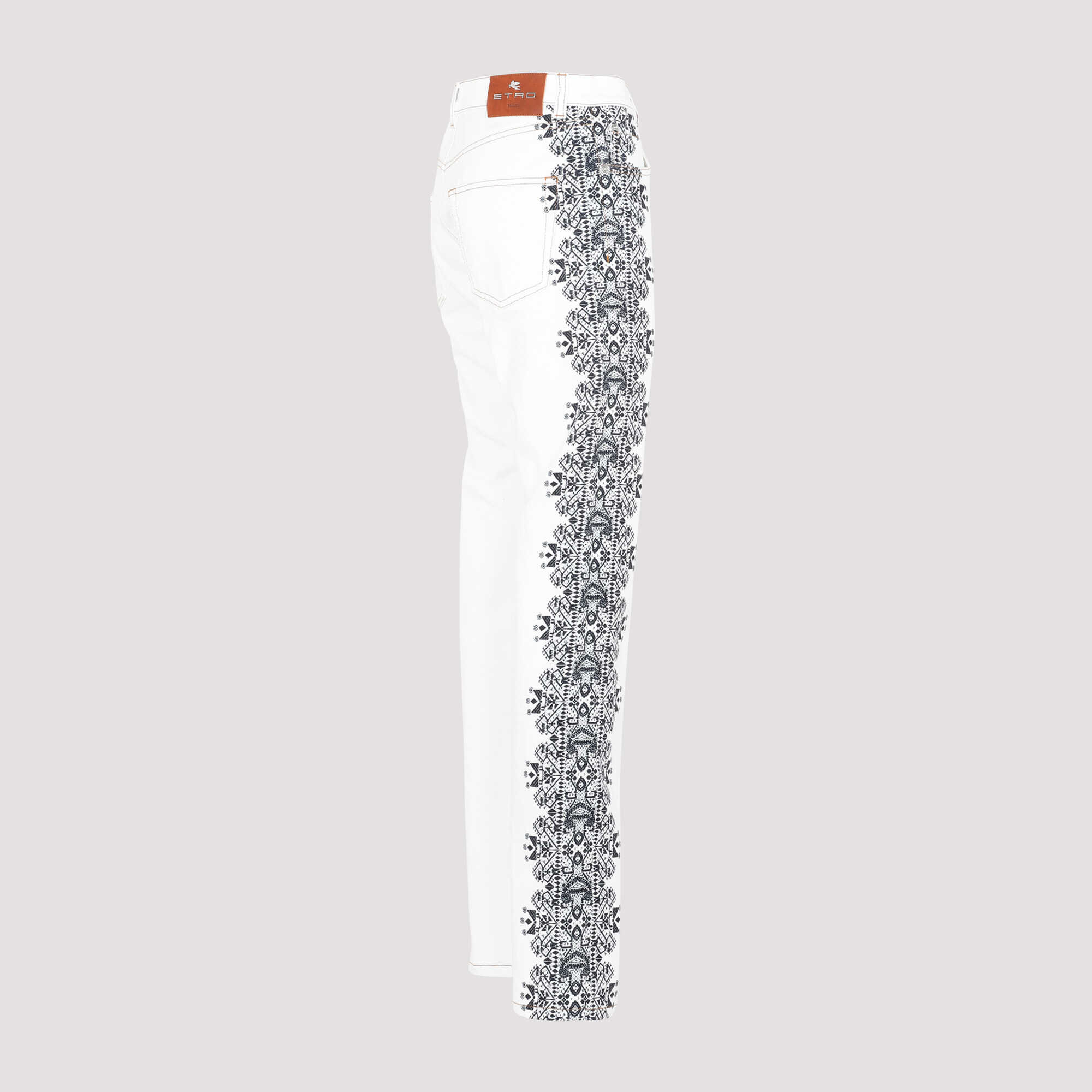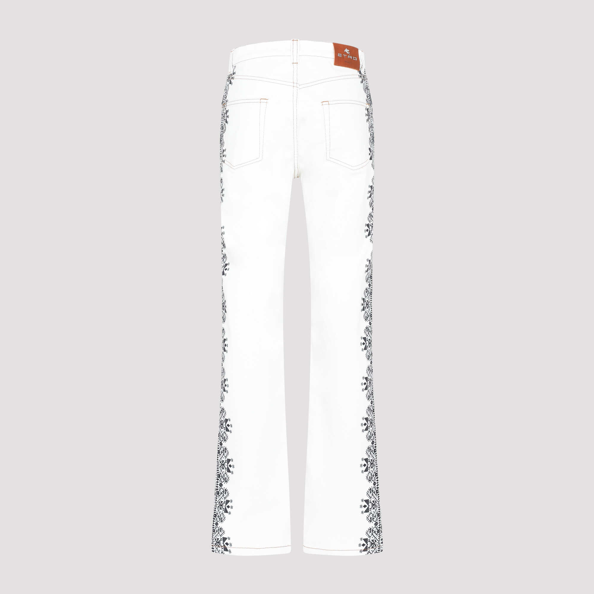 Etro White Cotton Esme Jeans. Crafted in pure white cotton denim with contrasting print on the sides. Front concealed fastening with visible button, belt loops, five-pocket construction, Etro logo tab on the back, straight hem.
