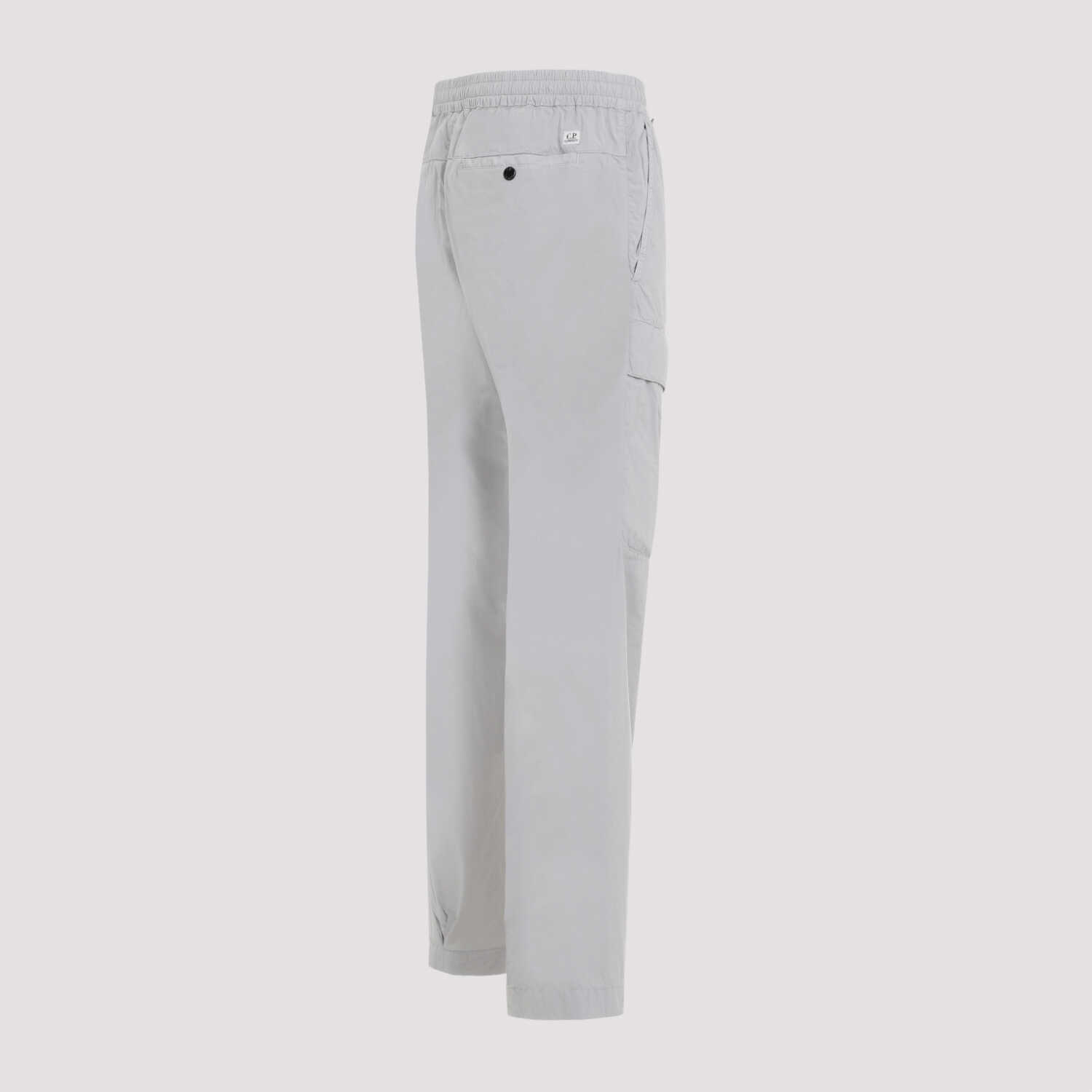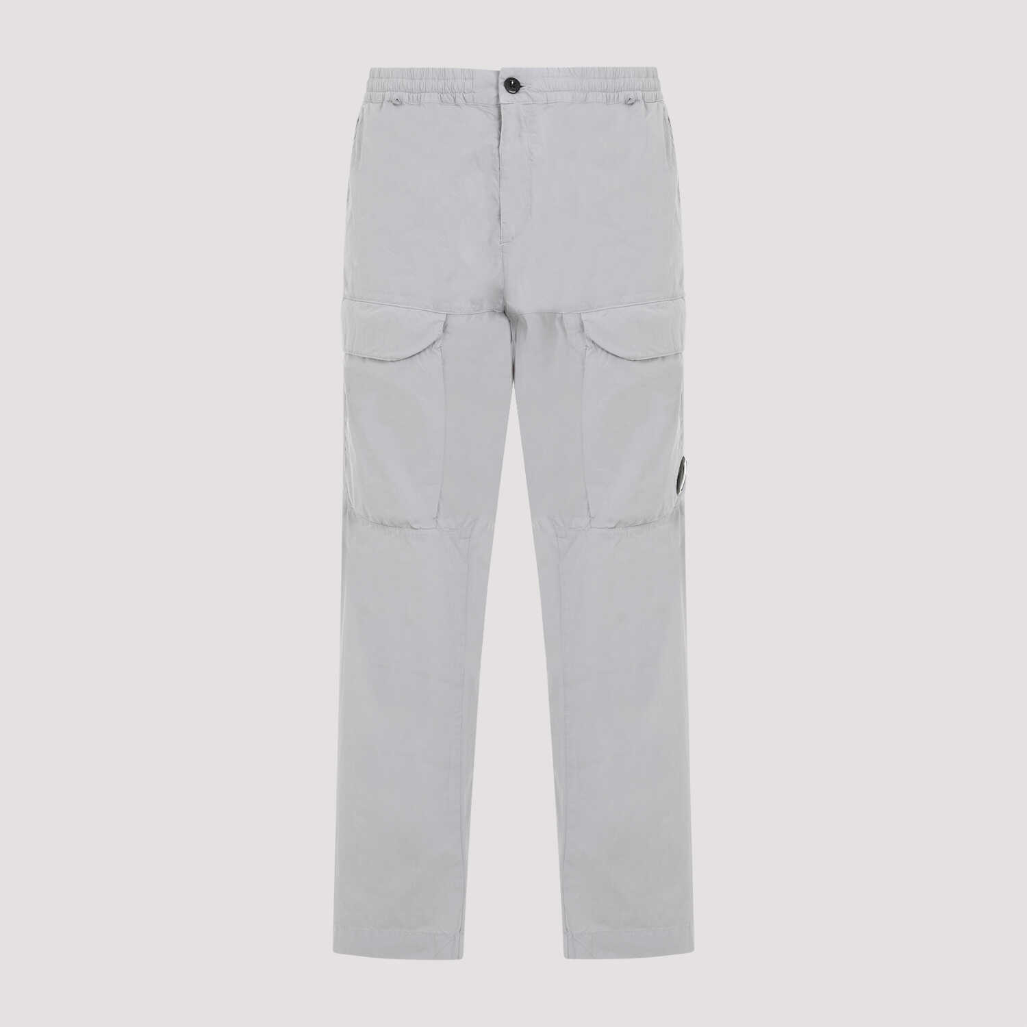 Cp Company Loose Grey Cotton Cargo Pants. Grey cotton blend, front button and zip closure, elastic waistband, slant pockets, cargo pockets on the front with signature Lens on the left one, back welt pockets, straight hem.