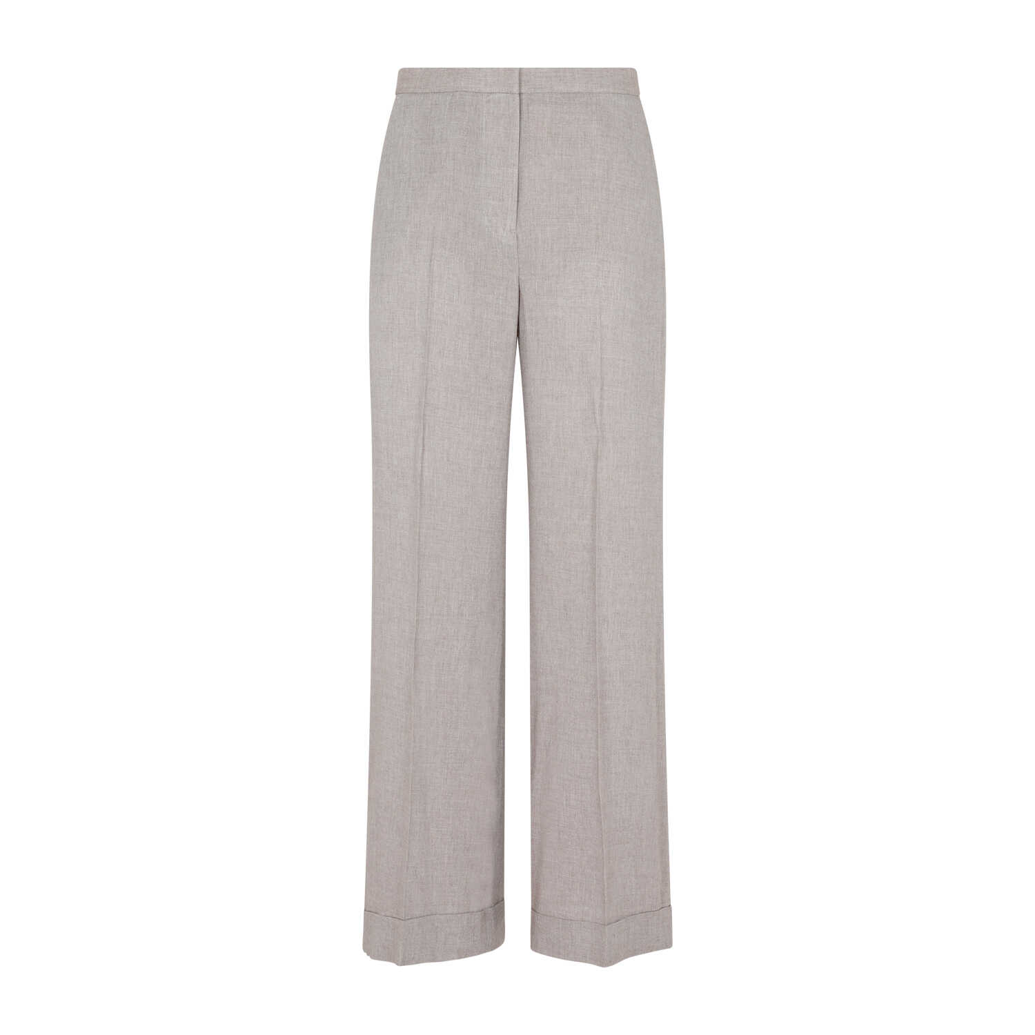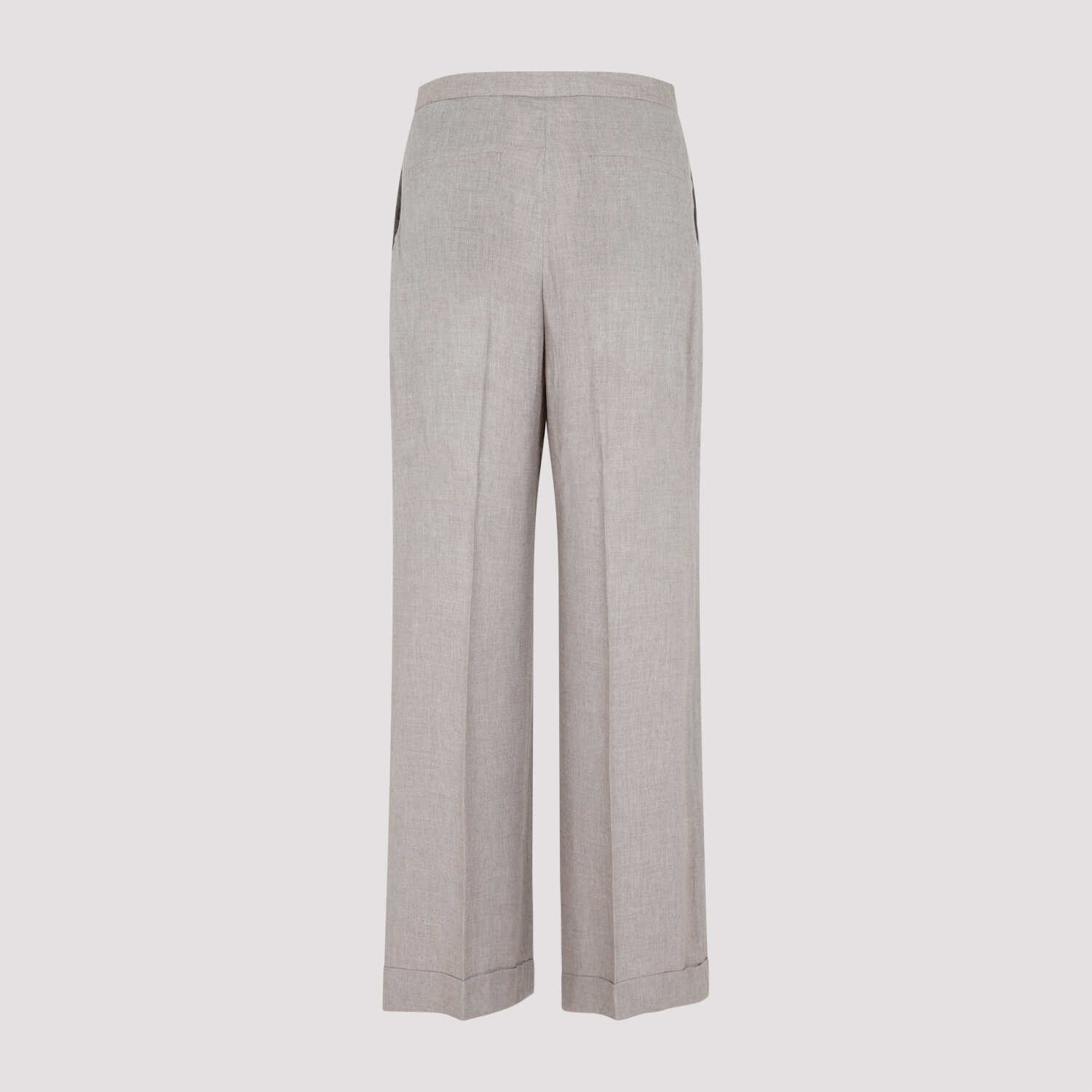 Toteme Light Brown Wide Fluid Trousers. Crafted in a light brown melange viscose and cashmere blend. Front concealed fastening, trouser crease, side slant pockets, two back welt pockets, wide leg, folded straight hem.