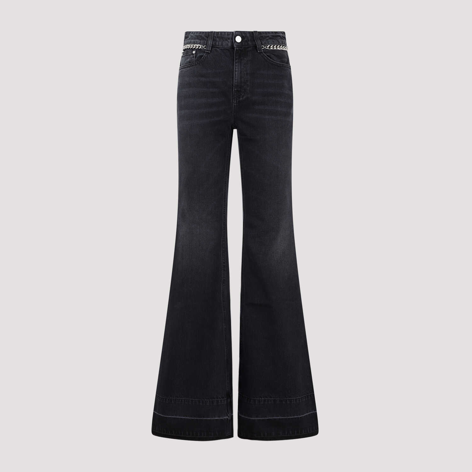 Stella McCartney Falabella Chain Flare Black Cotton Jeans. Crafted in pure black cotton, 5-pocket model, Falabella Chain on the waist, button and zip closure, bell-bottomed, silver-tone hardware.