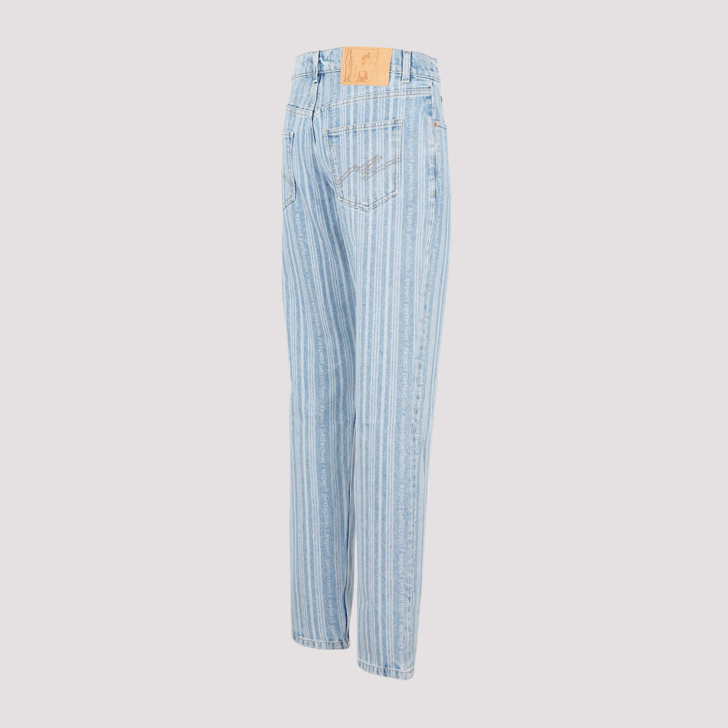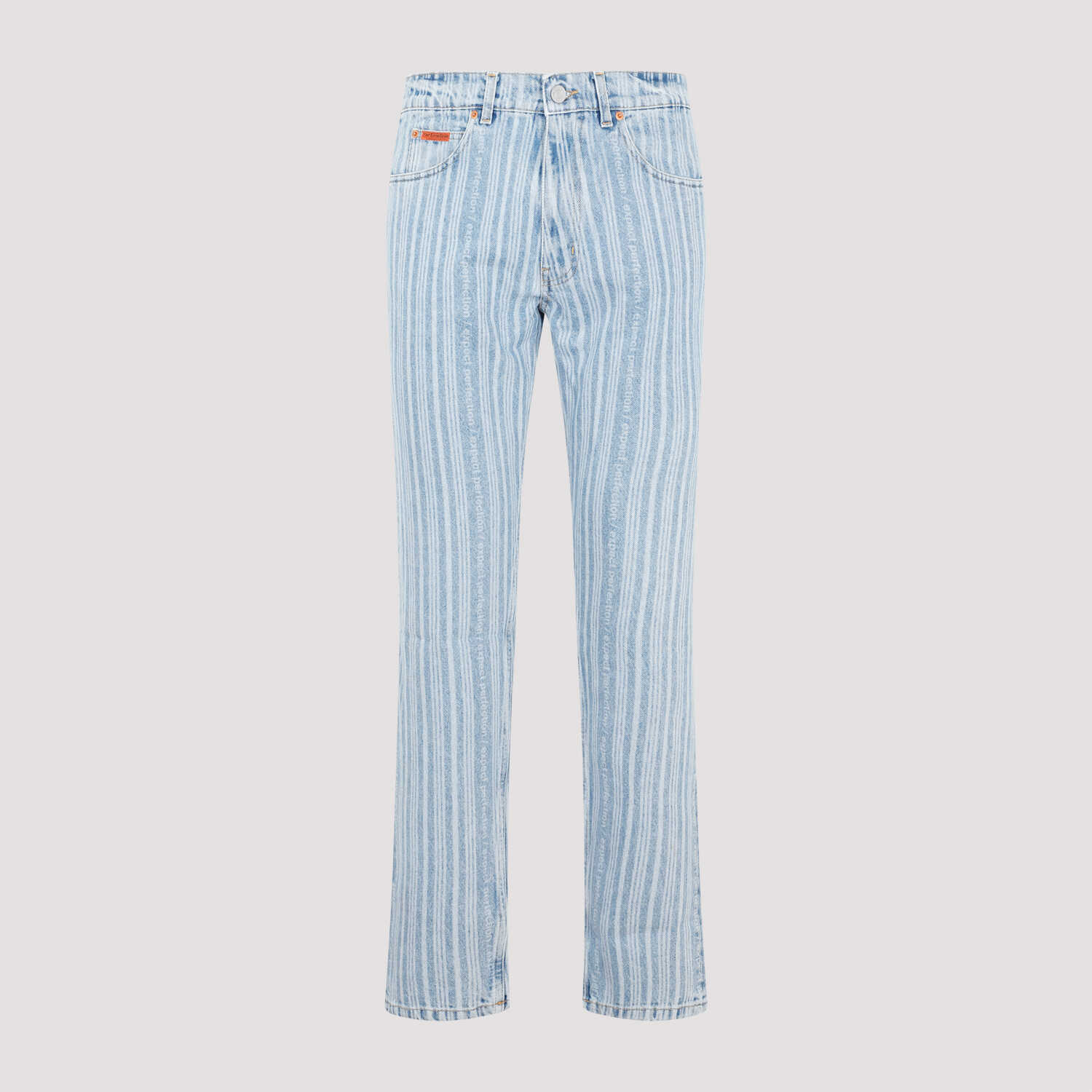 Martine Rose Blue Pinstripe Straight Leg Cotton Jeans. Pure blue pinstripe cotton, 5-pockets, orange logoed label on front, button and zip closure, belt loops, straight leg.