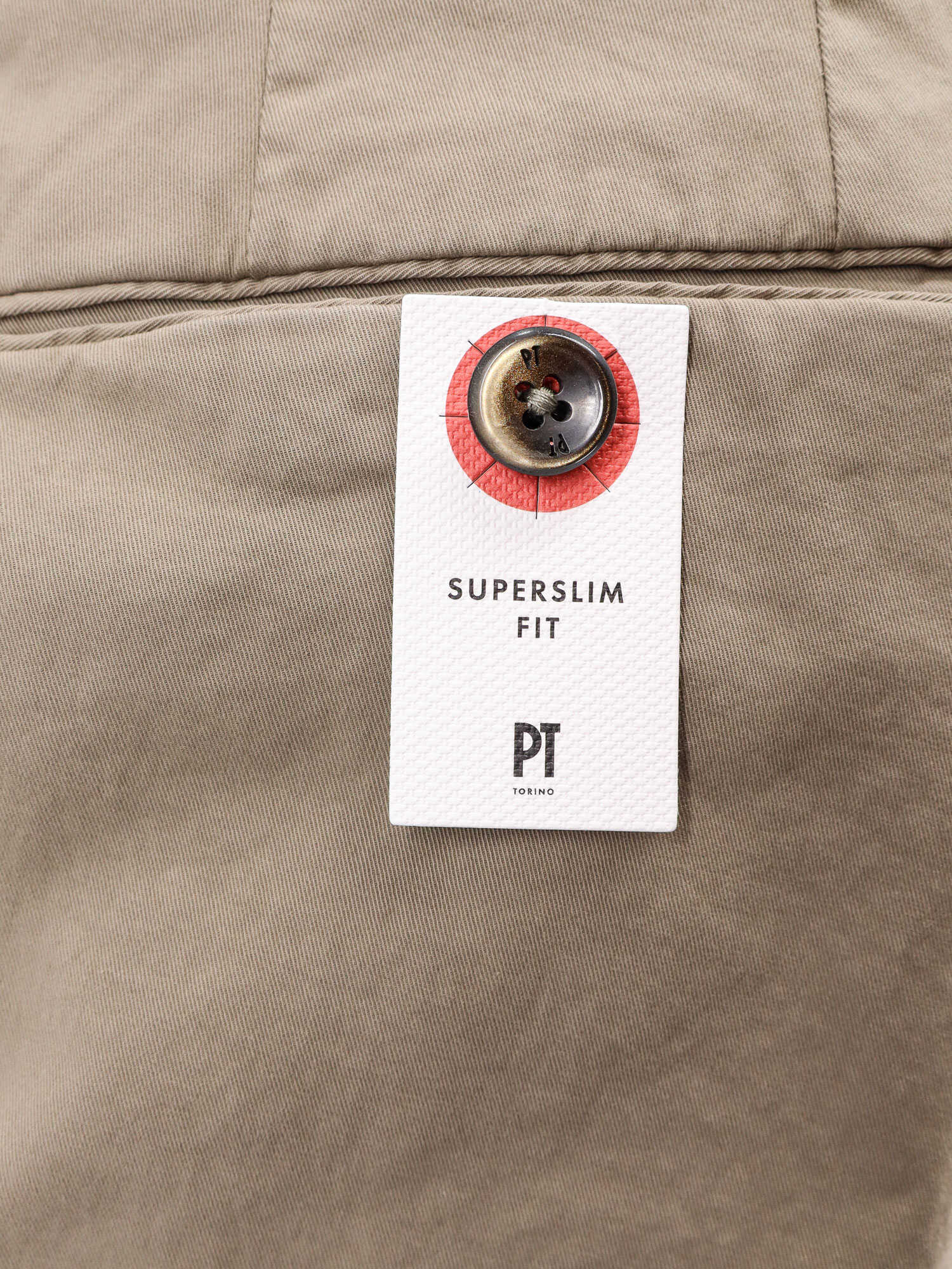 Button and zip closure, Lateral slant pockets, Back welt pockets with button, Super slim fit, 98% cotton 2% elastane