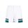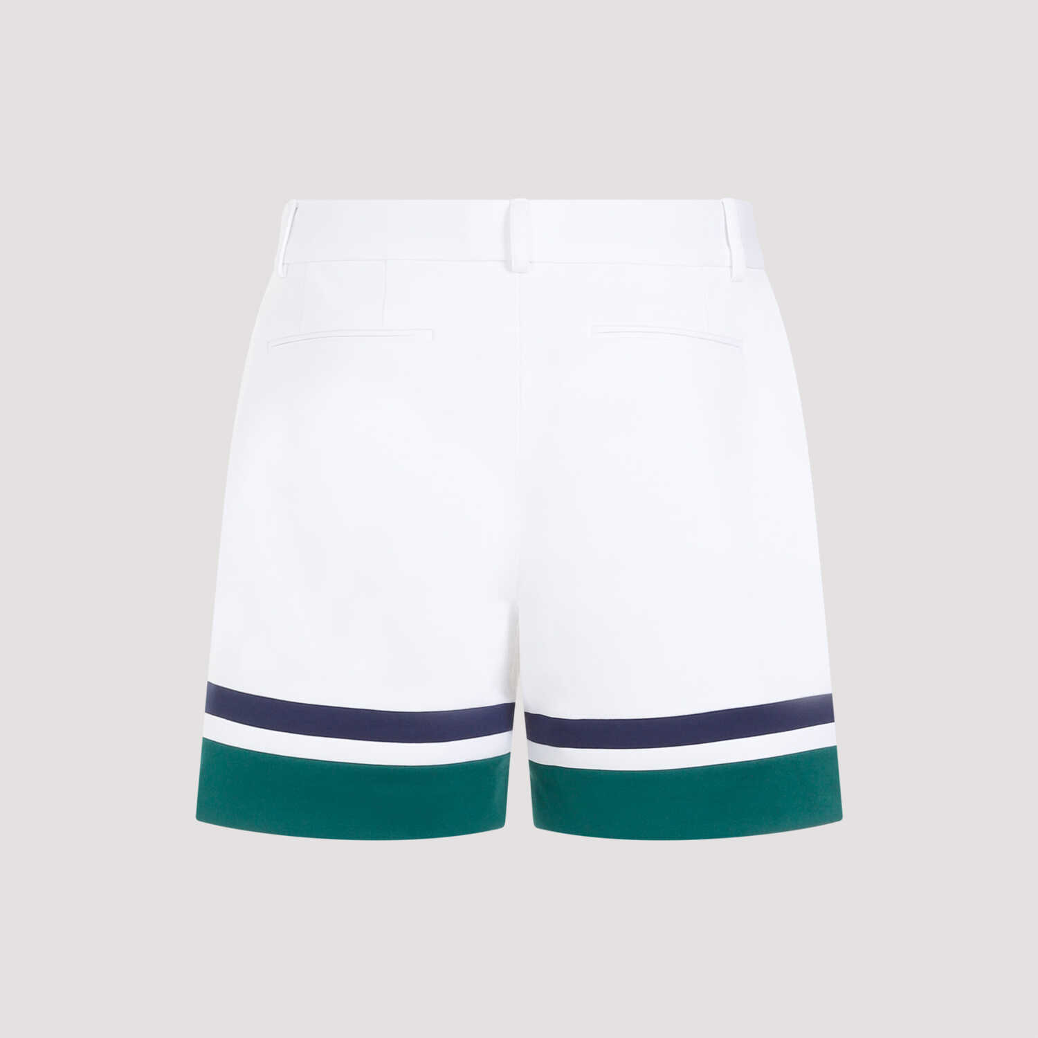 Casablanca White Midnight Sail Tailoring Shorts. Crafted in polyester and cotton blend. Front zipped and buttoned fastening, belt loops, side pockets, back slit pockets, side patch logo, green and blue stripes on the bottom, straight hem.