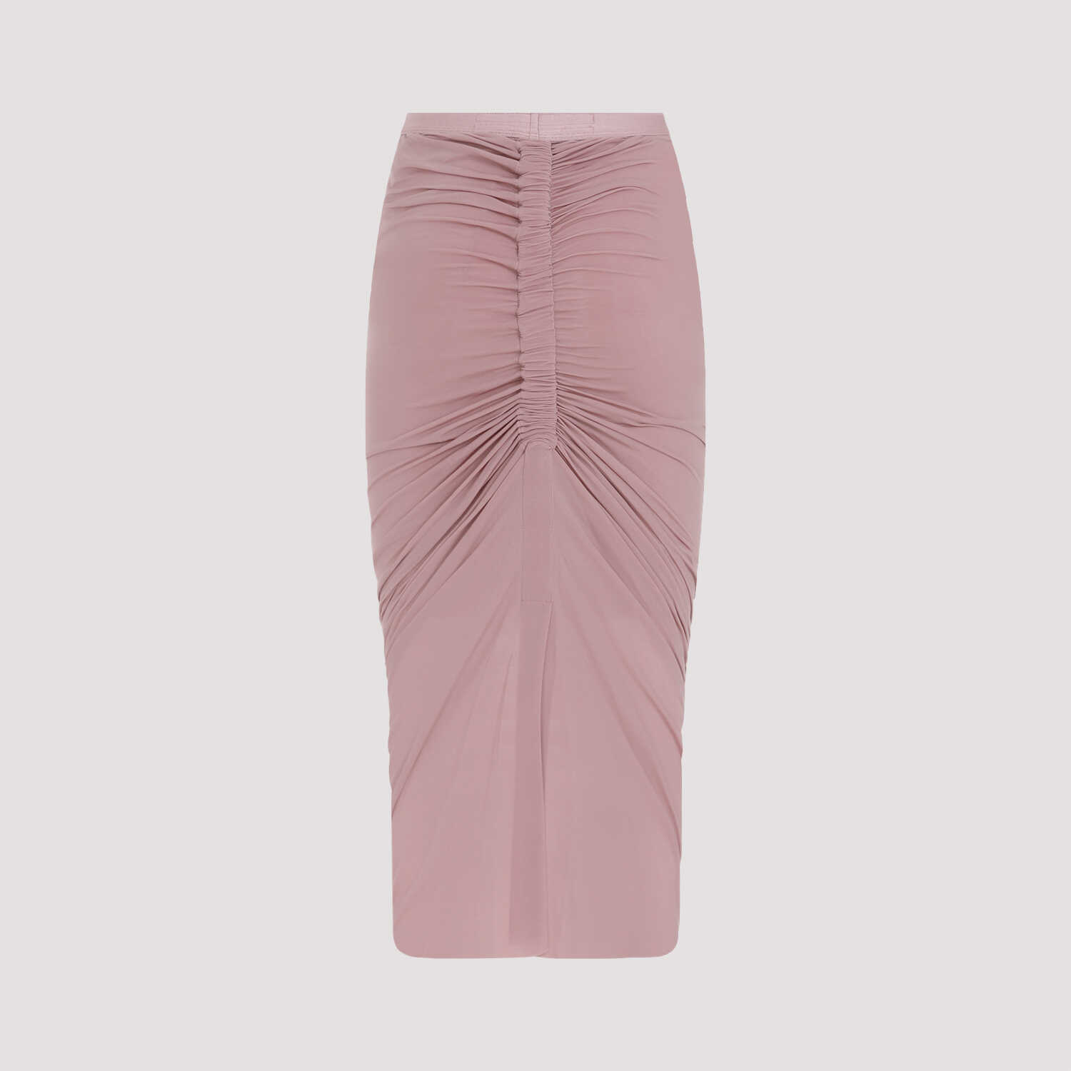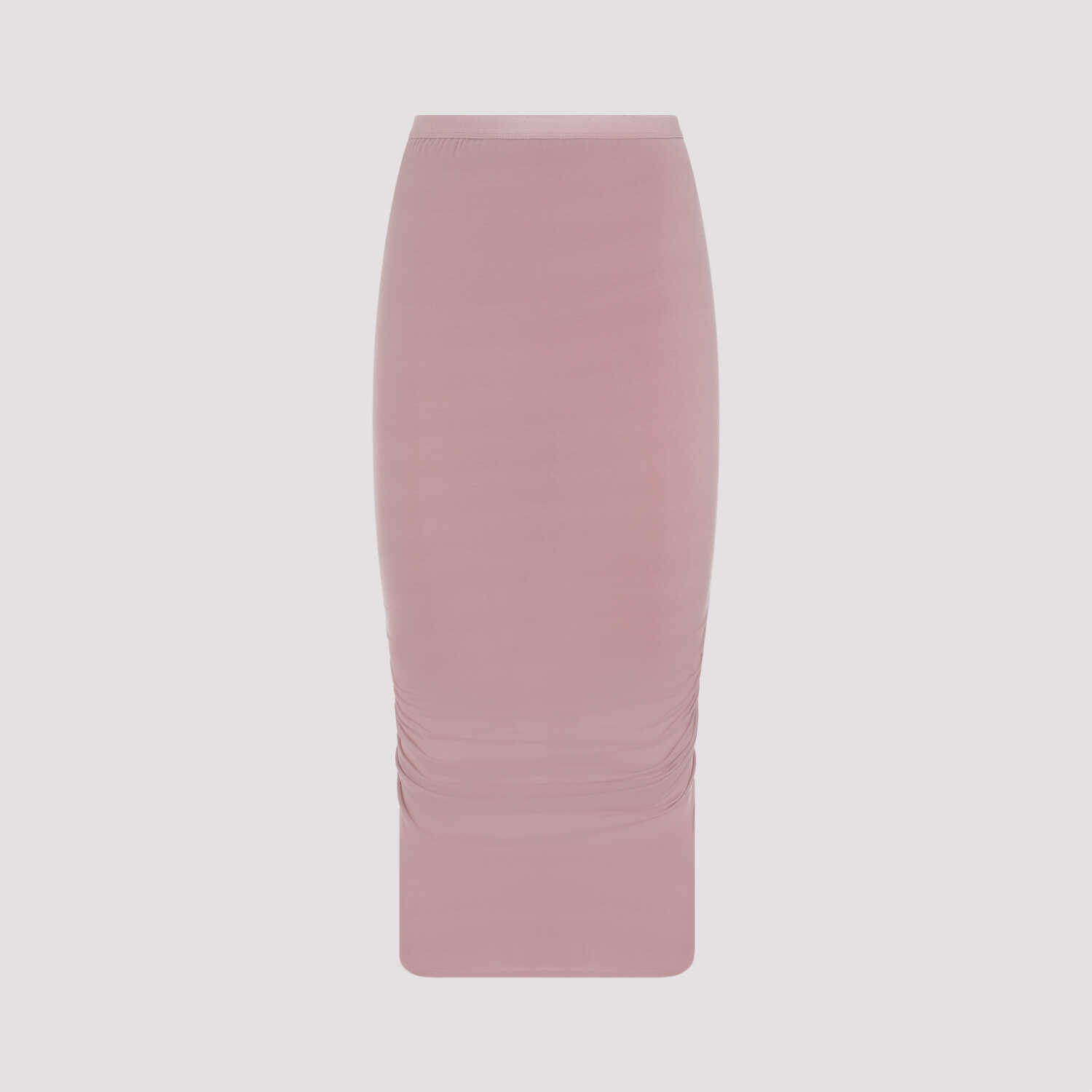 Rick Owens Shirmp Dusty Pink Cupro Skirt. Dusty pink stretch cupro, pencil skirt design, tonal elastic waistband, back crimped detail, asymmetrical hem.