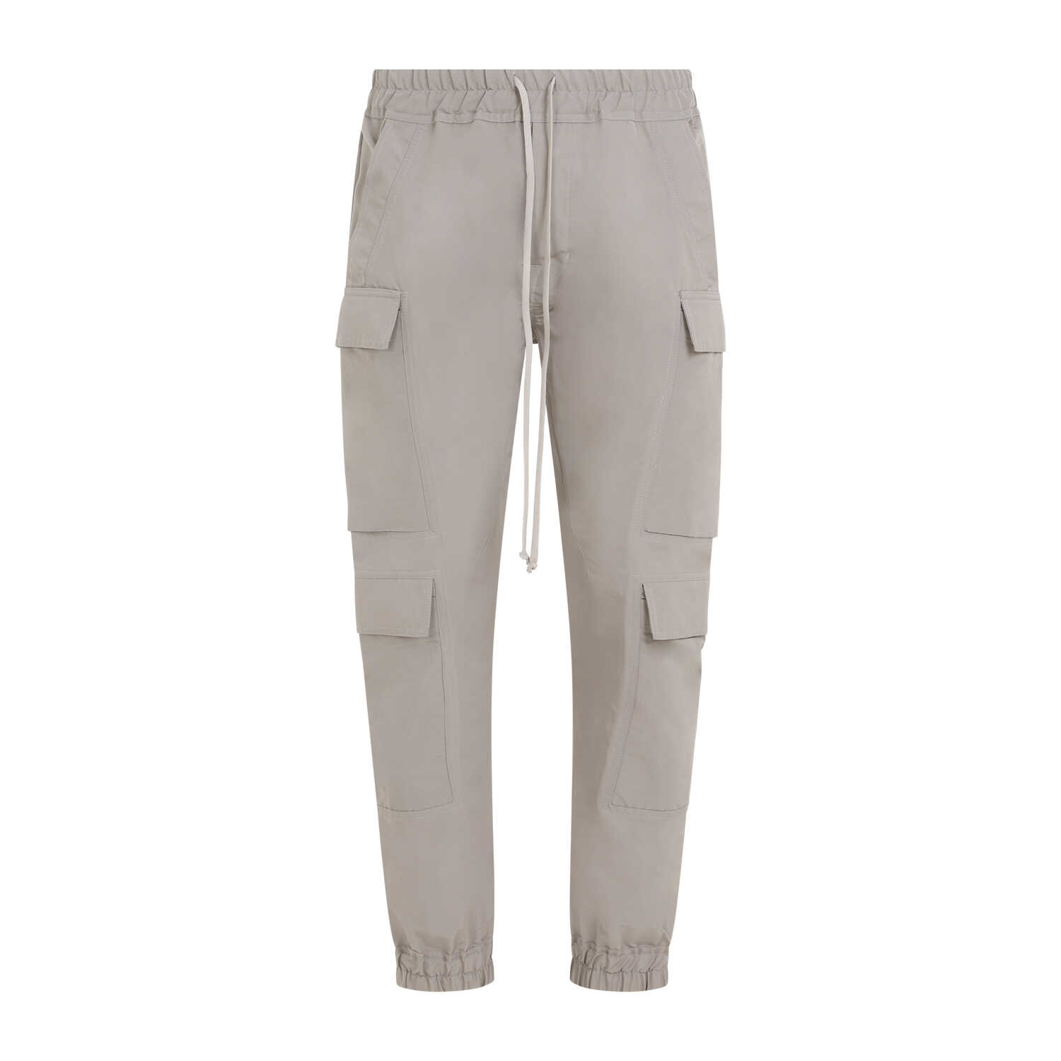 Rick Owens Mastodon Grey Polyester Cargo Pants. Pearl grey tech fabric, elastic waistband and drawstring, side pockets, cargo pockets on the legs, flap pockets on the back, elastic hems.