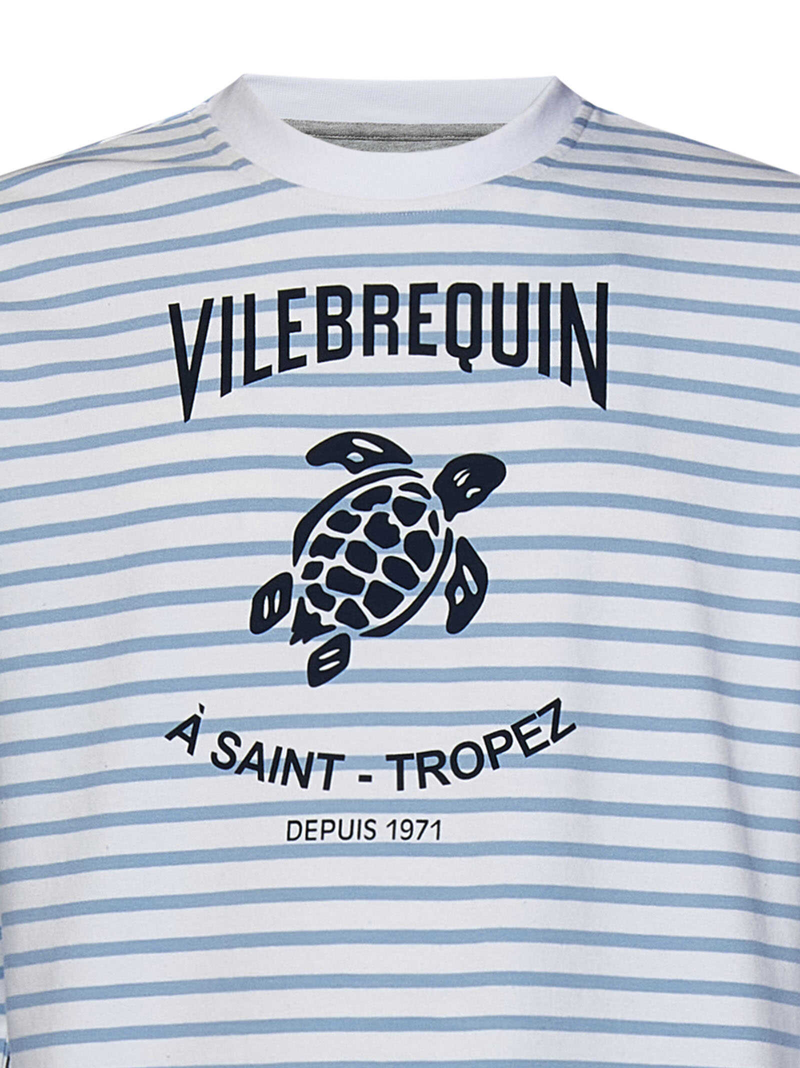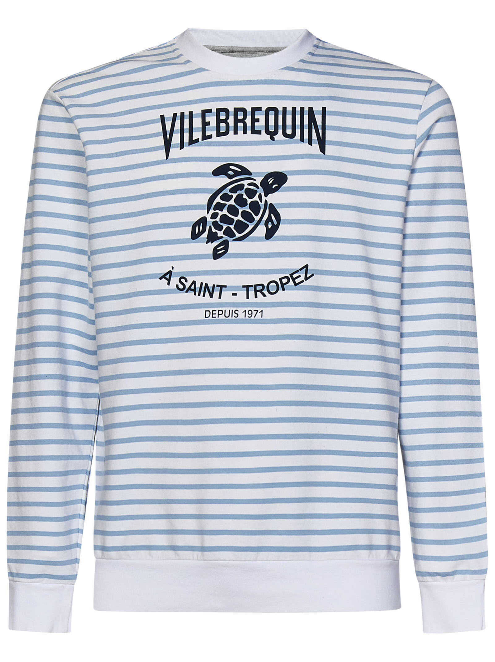 Striped white and light blue stretch cotton crewneck sweatshirt with logo print.