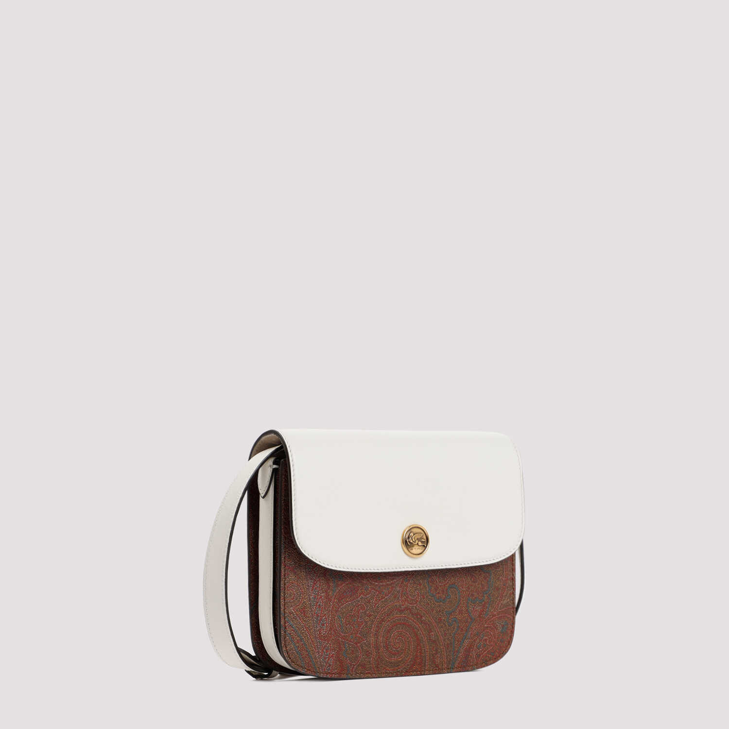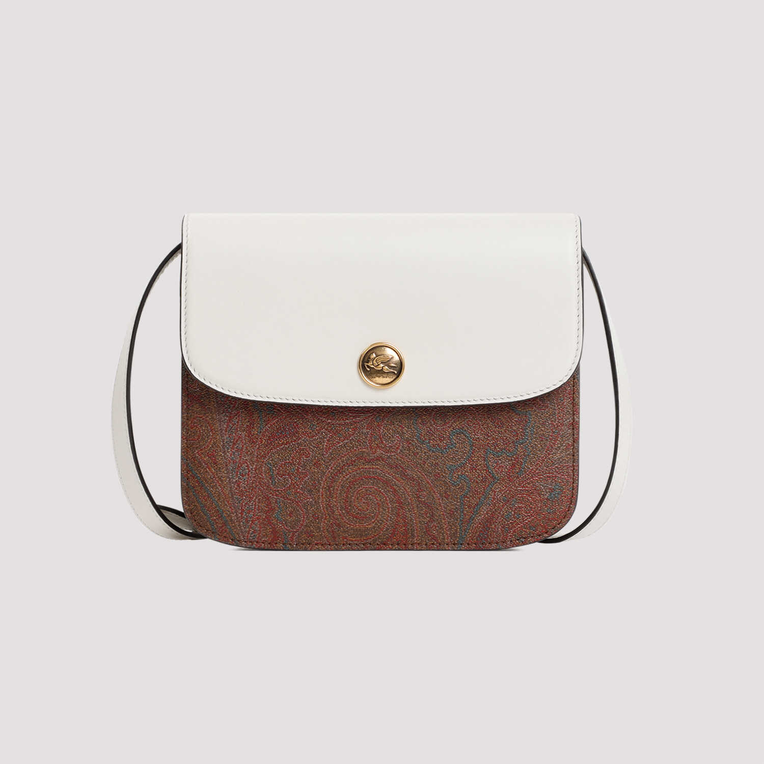 Etro Crossbody Small Essential Bag. Paisley signature fabric and white contrasting leather flap fastening and button with ETRO and Pegaso logo. Leather shoulder strap, golden-tone hardware, fully lined.