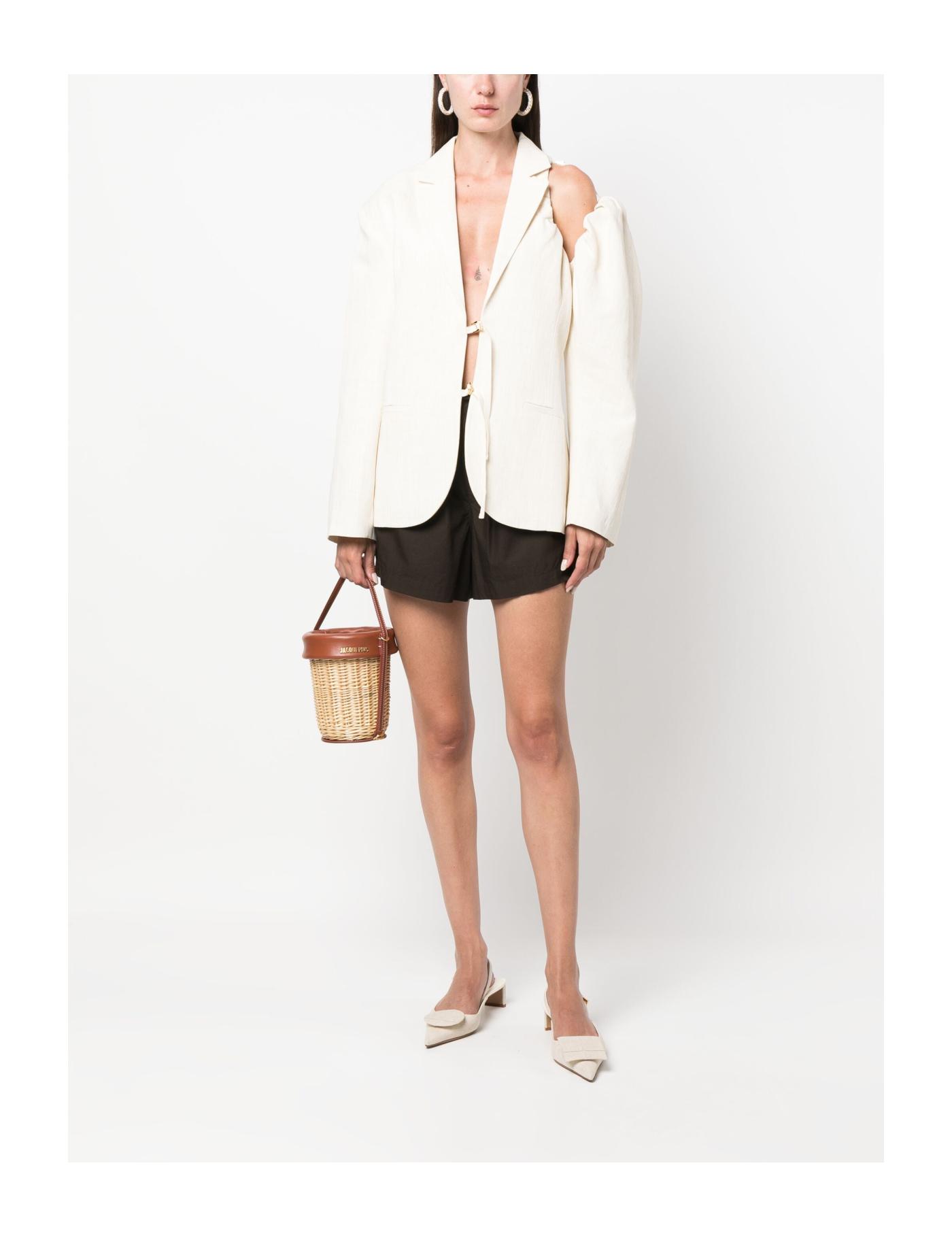 Jacquemus offers a laidback take on the classic blazer. This linen-blend garment has one exposed shoulder with a puffed sleeve and adjustable attached strap, as well as metal D-ring fastenings in place of traditional buttons.