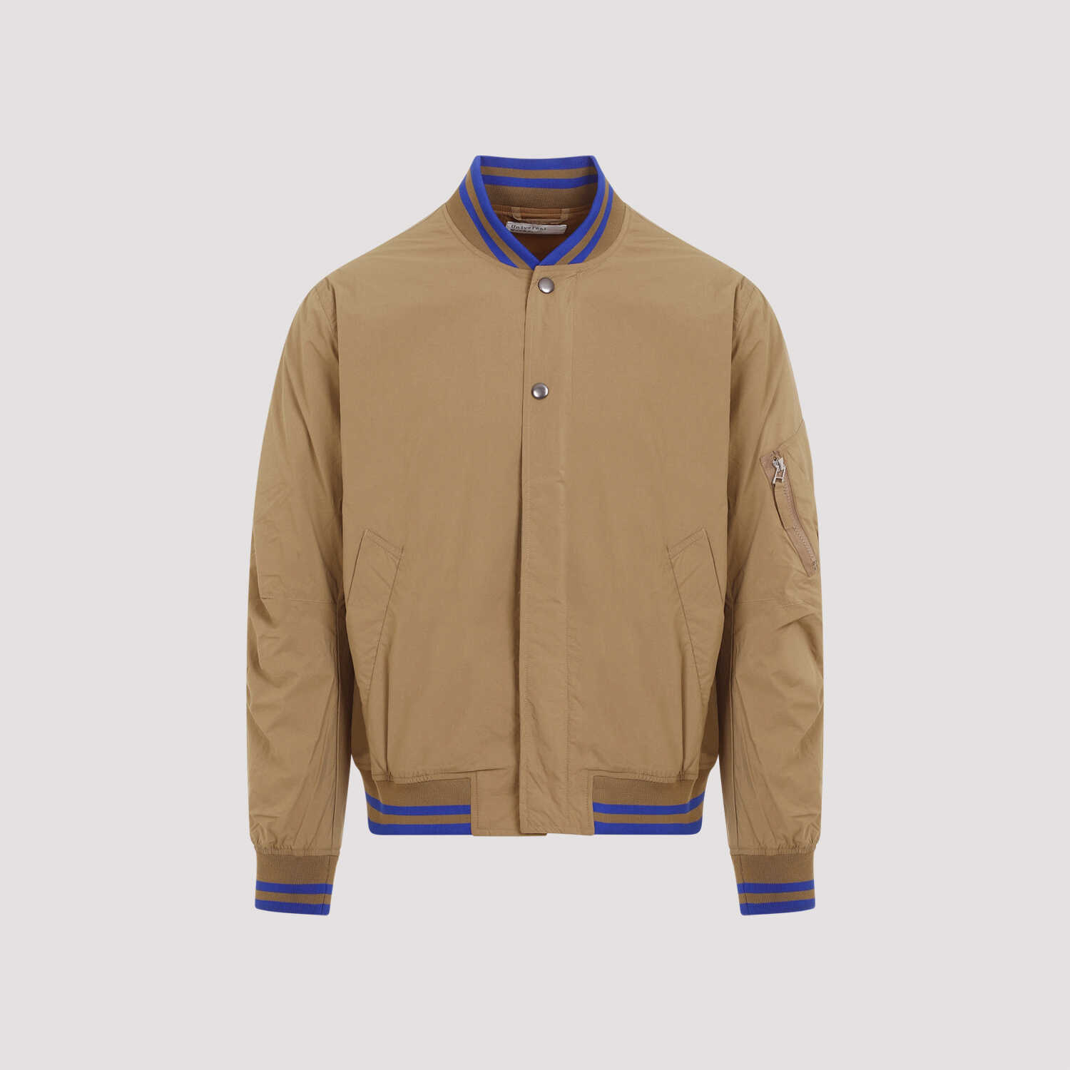 Universal Works NS Sand Recycled Polyamide Bomber Jacket. Crafted in sand recycled tech fabric, bomber jacket design, button and concealed zip closure, two front pockets, one zipper pocket on the left sleeve, ribbed with blue stripes edges.