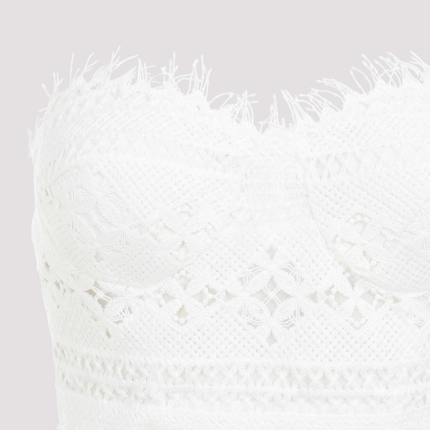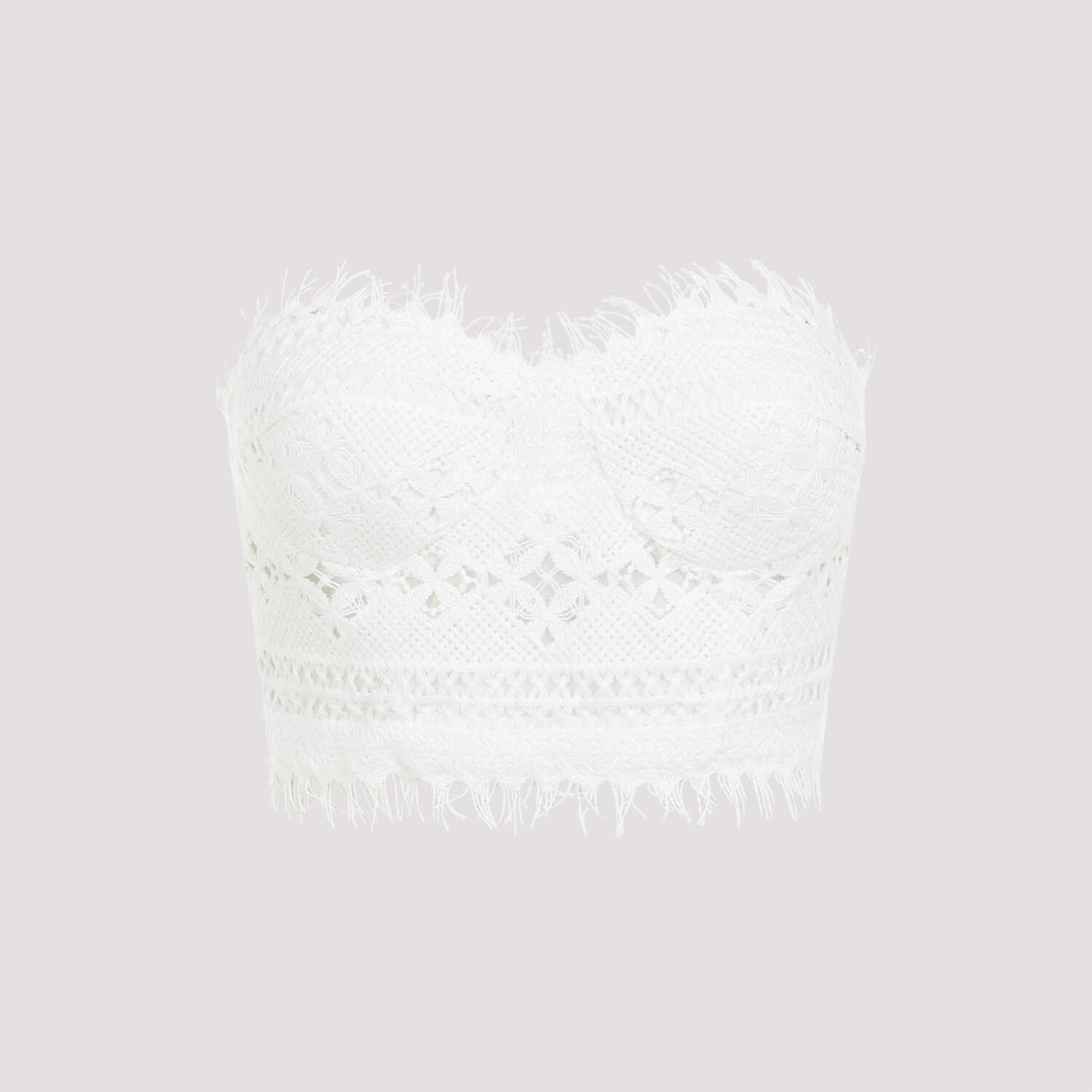 Ermanno Scervino White Top. Crafted in polyester fabric, strapless, bustier design, tonal stitching, back concealing hook fastening, fringed details on the top and on the bottom, lace details all-over.