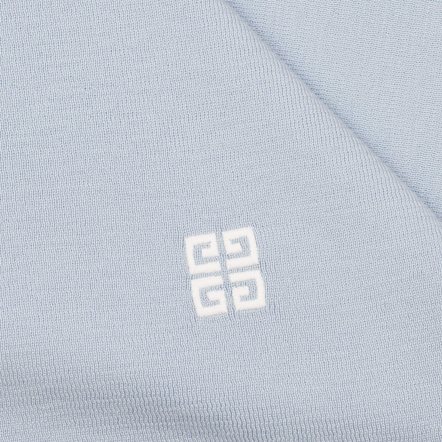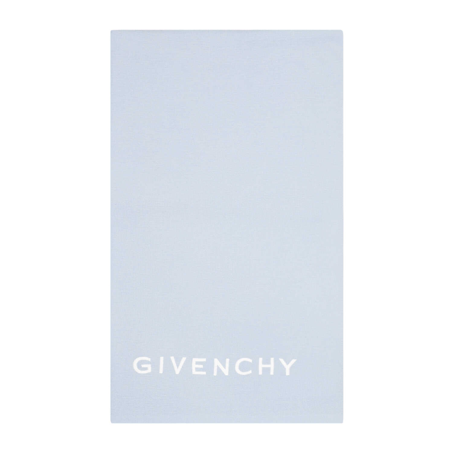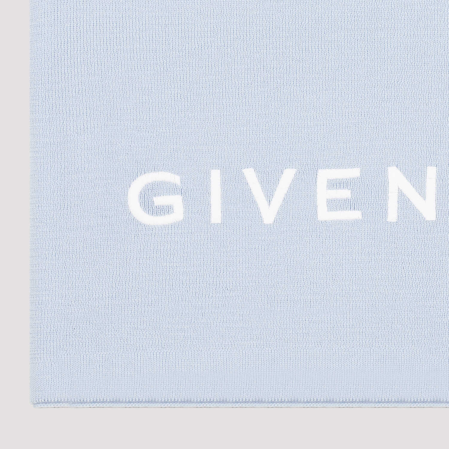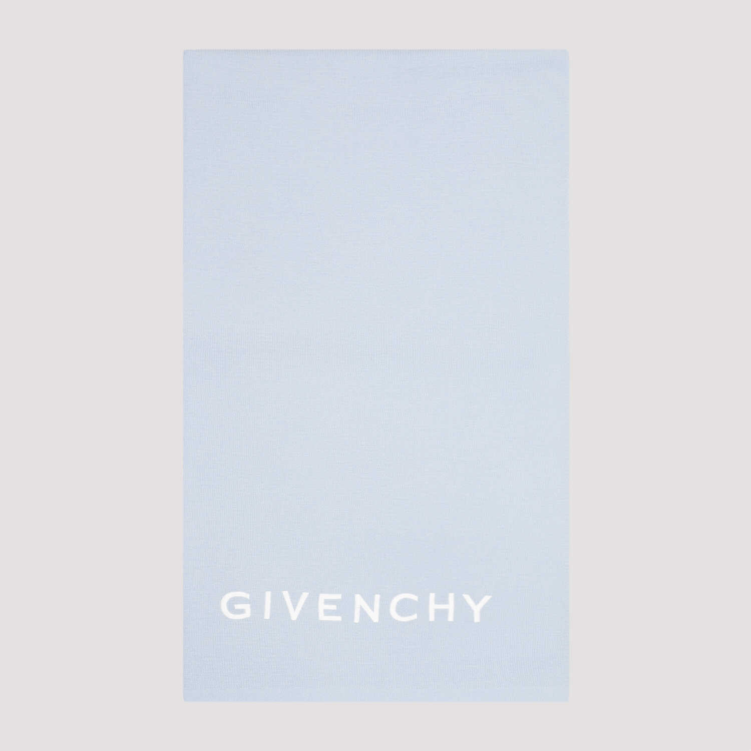 Givenchy Light Blue Wool Scarf. Crafted in pure light blue wool, contrasting white logo Givenchy embroidered on the front, contrasting white logo 4G embroidered on the back, straight hem.