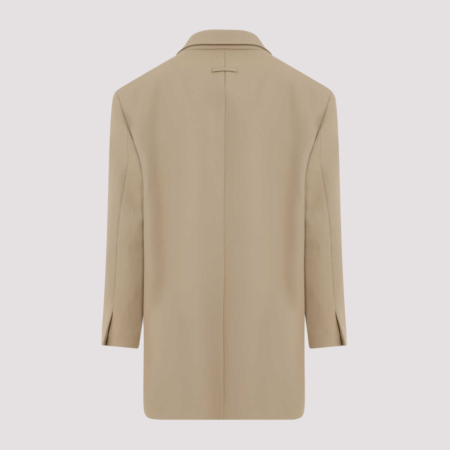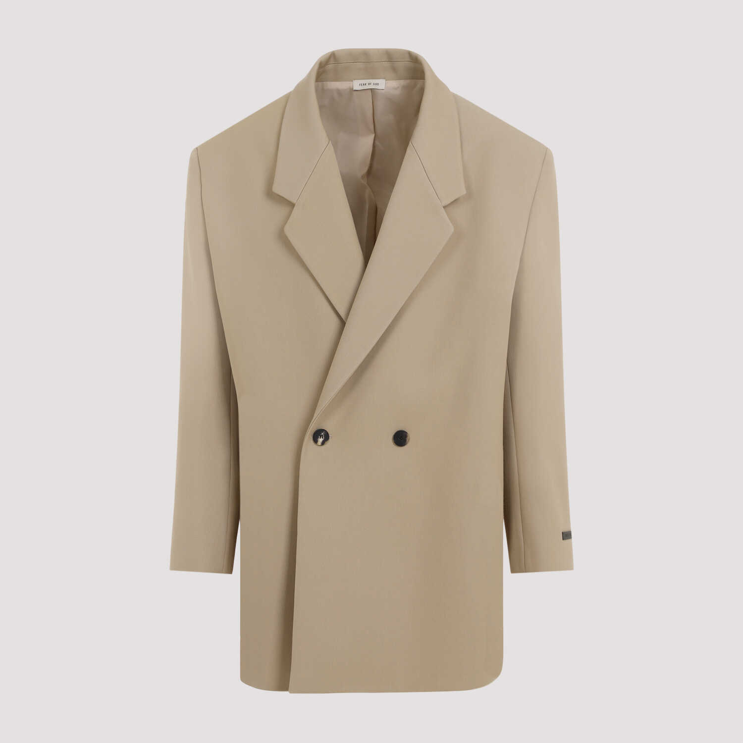 Fear of God California Beige Wool Blazer. Beige wool and cotton, pointed lapels, double-breasted with button closure, reinforced shoulders, long sleeves, mini-vent on the cuffs, straight hem, lined.