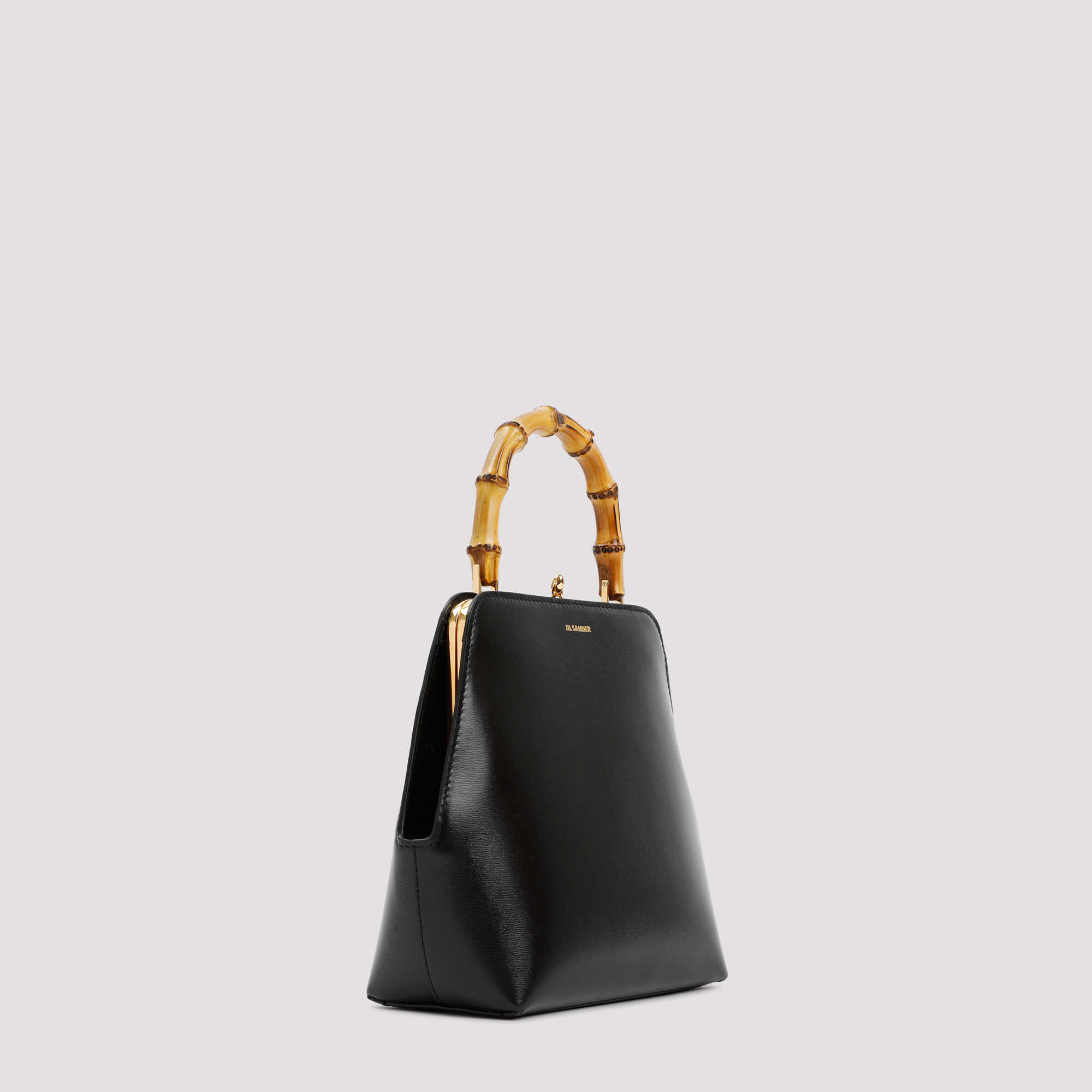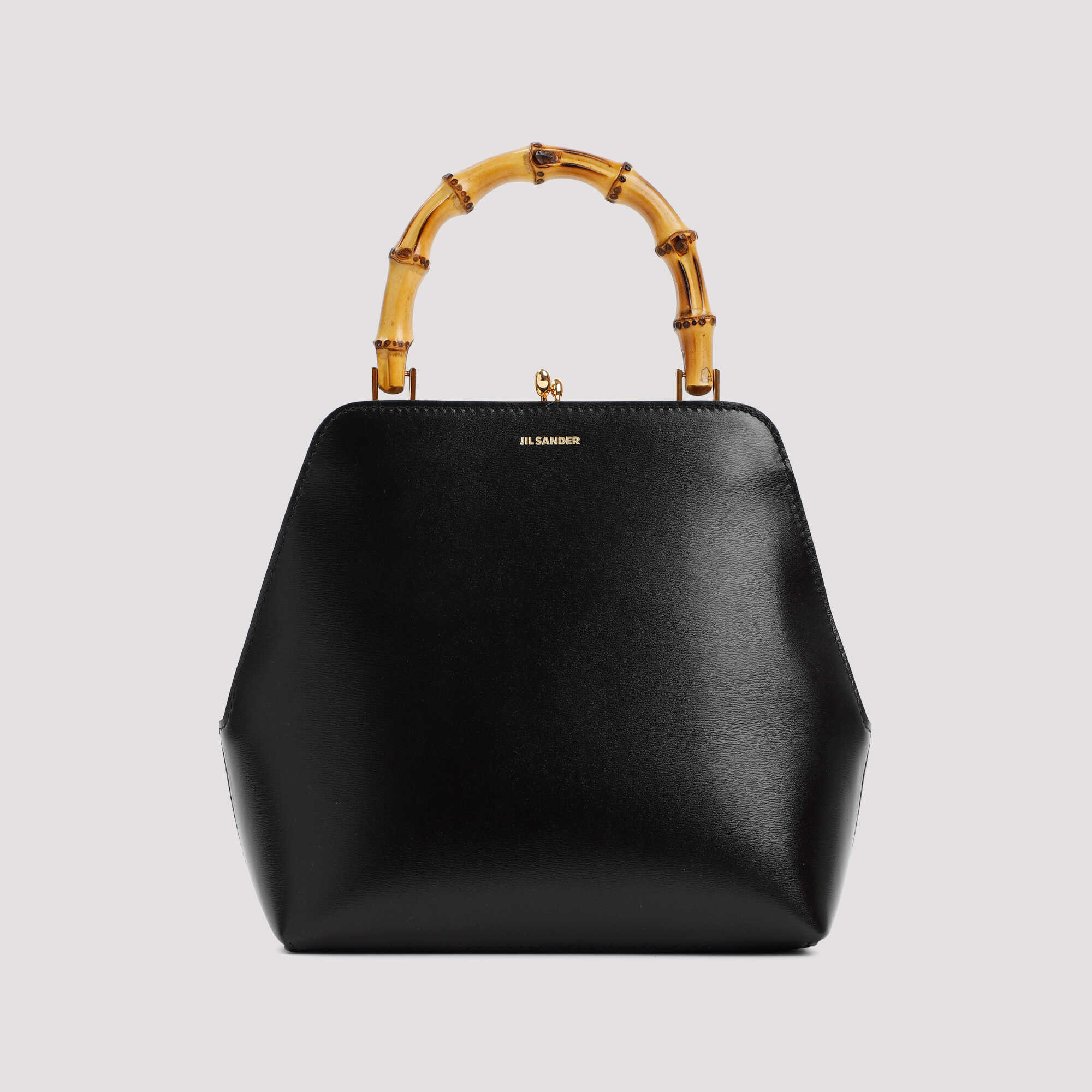 Jil Sander Black Goji Square SM Bamboo Bag. Crafted in pure black calf leather. Top pure bamboo handle, metal frame structure, top goji berry-inspired clutch fastening, Jil Sander logo embossed on the front, inner zip pocket, gold-toned metal hardware, leather lining.