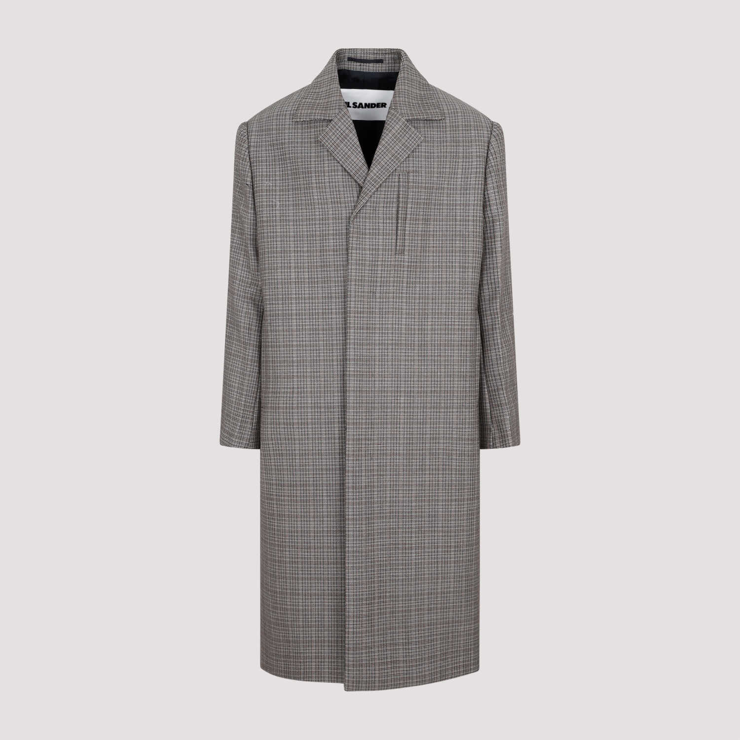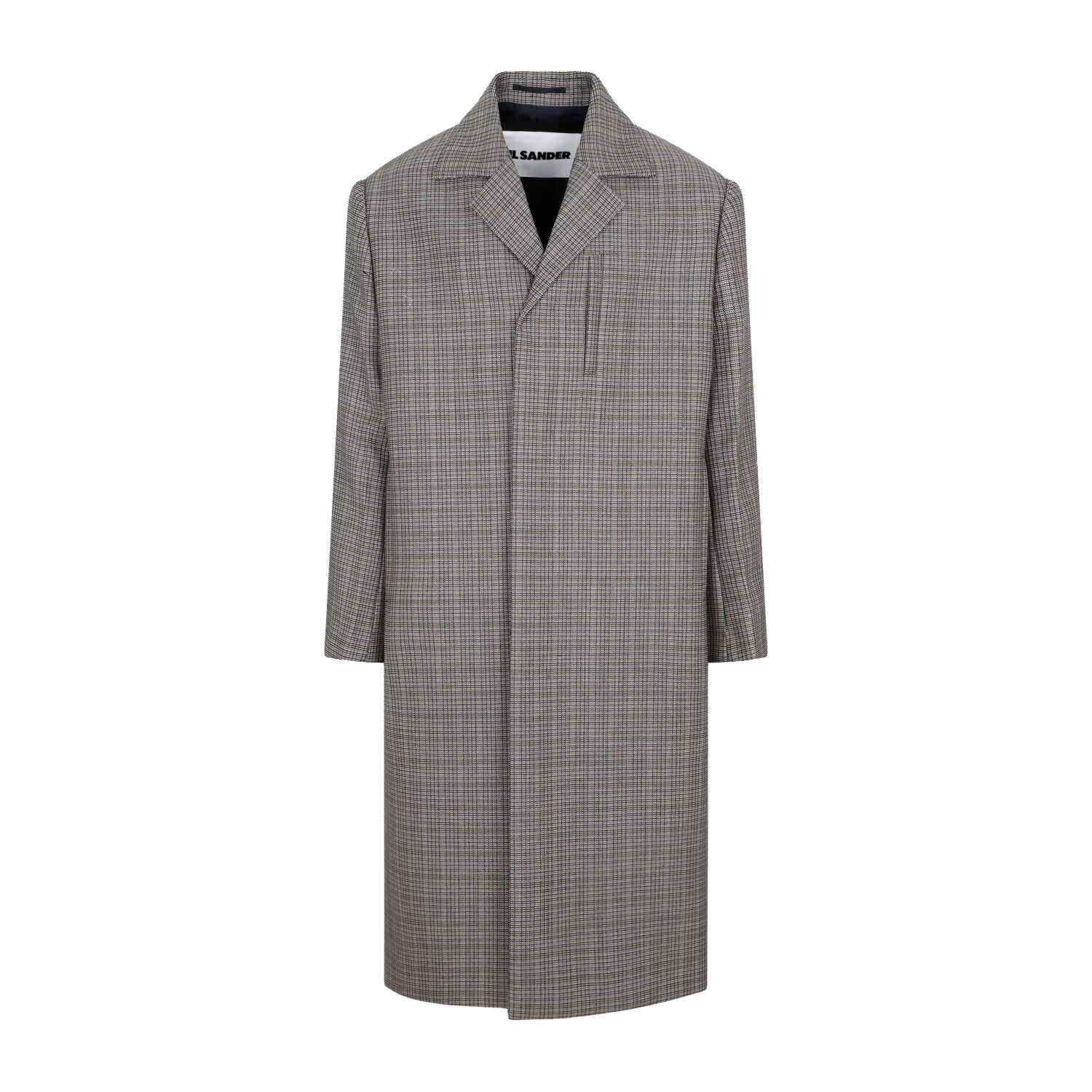 Jil Sander Military Speckle Virgin Wool Coat. Crafted in a pure check virgin wool, structured shoulders, classic revers, double breasted, front concealed fastening, vertical welt pocket on the breast, straight hem, lined.