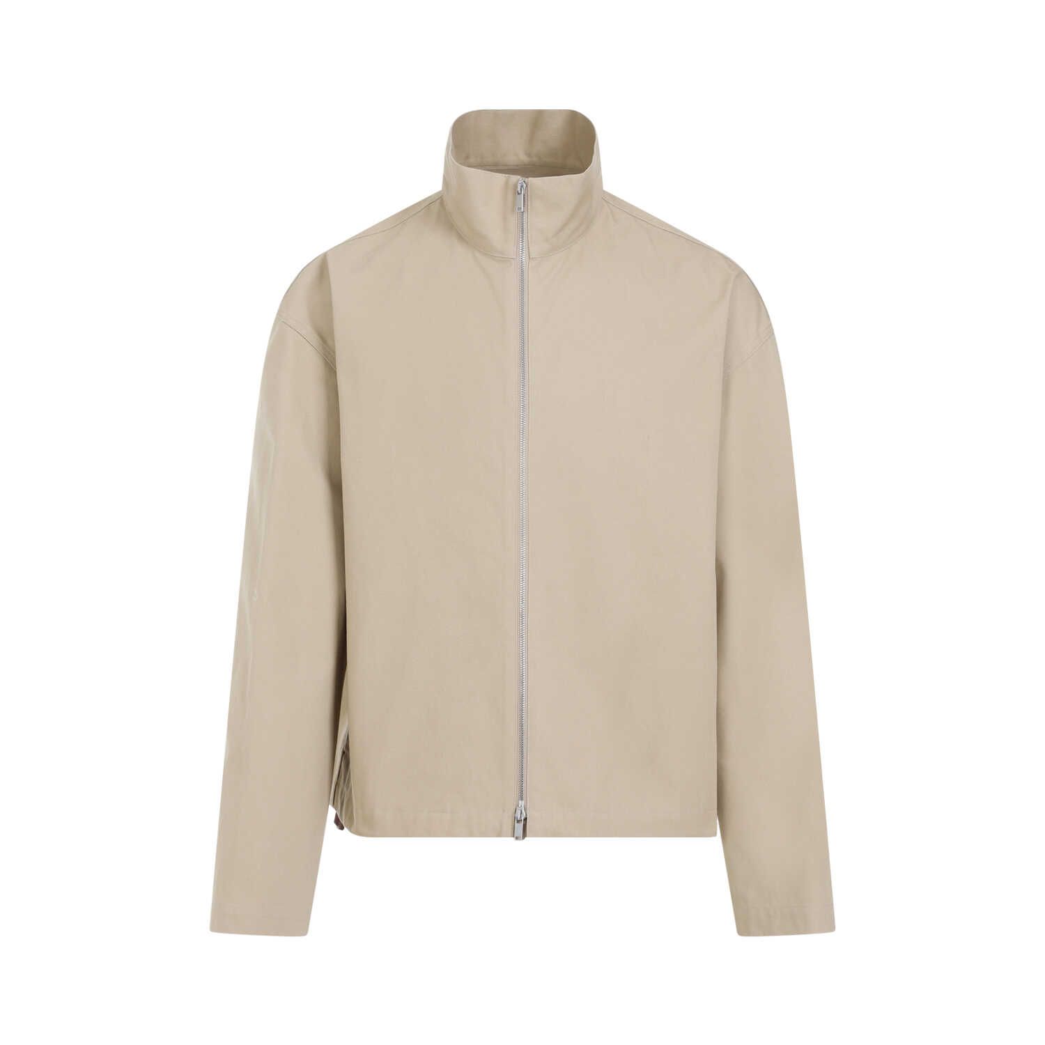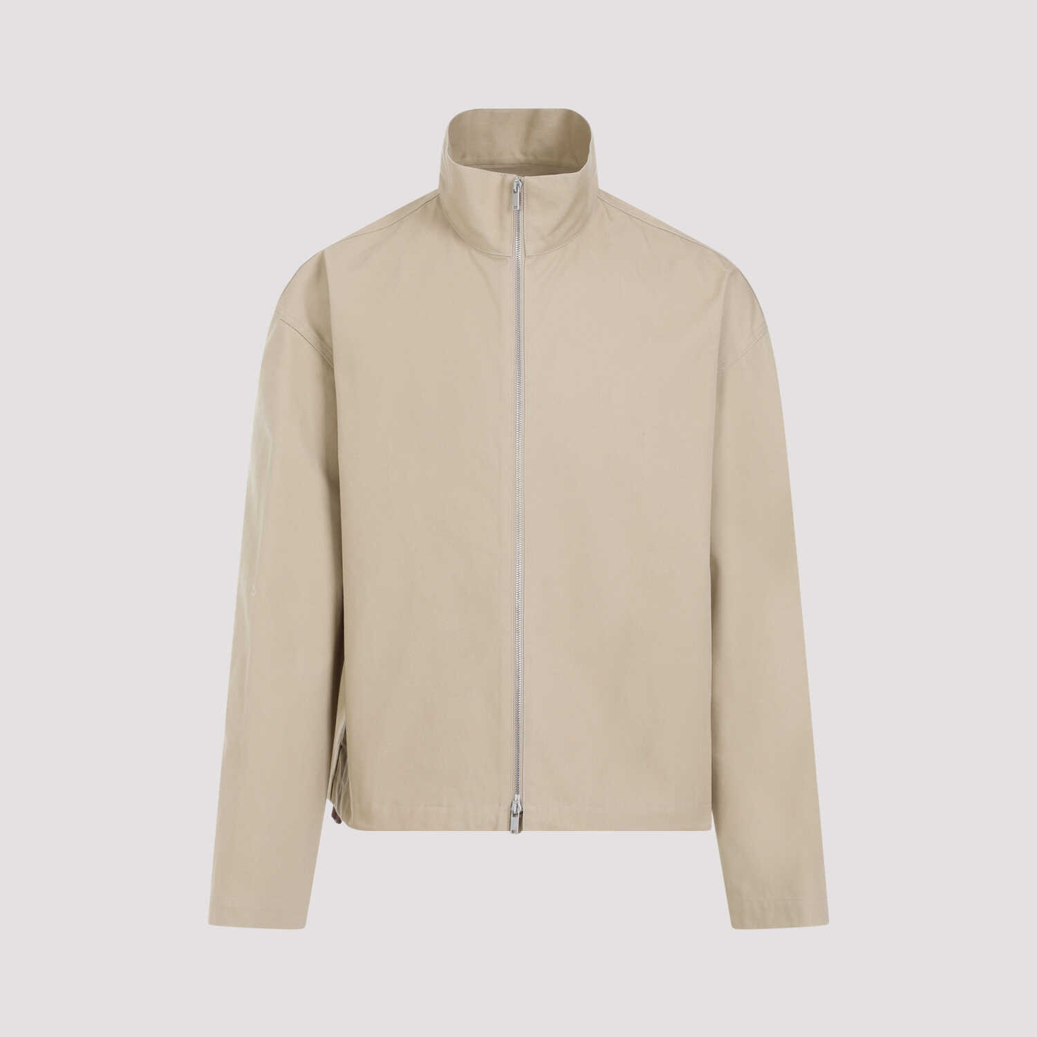 Jil Sander Grey Cotton Jacket. Grey organic cotton canvas, boxy shape, standing collar, two-way zipper closure on the front, dropped shoulders, long sleeves, inseam side pockets, leather label with embossed logo on the back, adjustable hem with drawstrings, straight hem.
