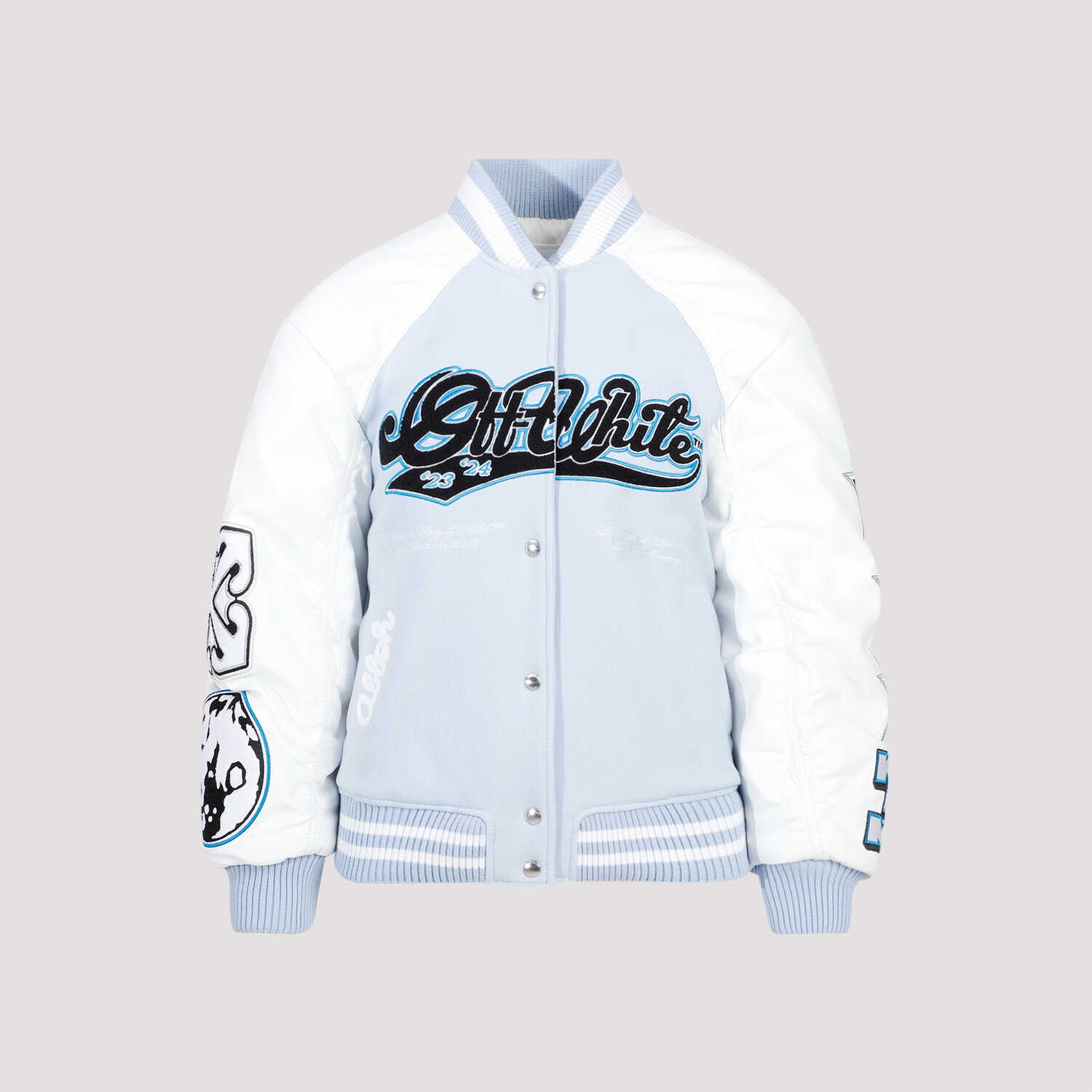 Off White Light Blue Leather Moon Wheel Varsity. Crafted in pure leather on the arms. Crafted in virgin wool and polyester in the rest of the jacket. Ribbed white and light blue stand-up collar, front buttoned fastening, black logo on the front, white embroidered lettering on the front, side pockets, black moon wheel embroidered on the back, white long sleeves with embroidered details on both arms. Ribbed light blue cuffs, ribbed white and light blue hem, straight hem. Fully lined.