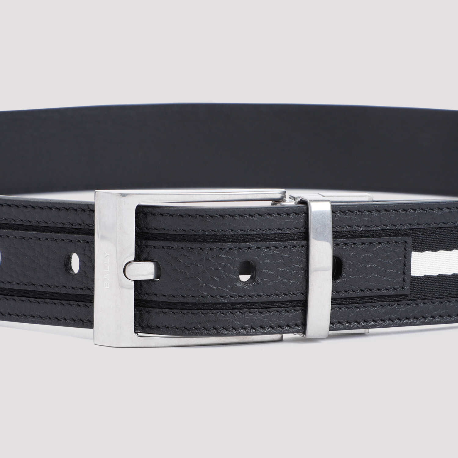 Bally Black Grained Leather Belt. Crafted from black grained leather, webbing black and white striped insert, silver-toned buckle, adjustable fit.