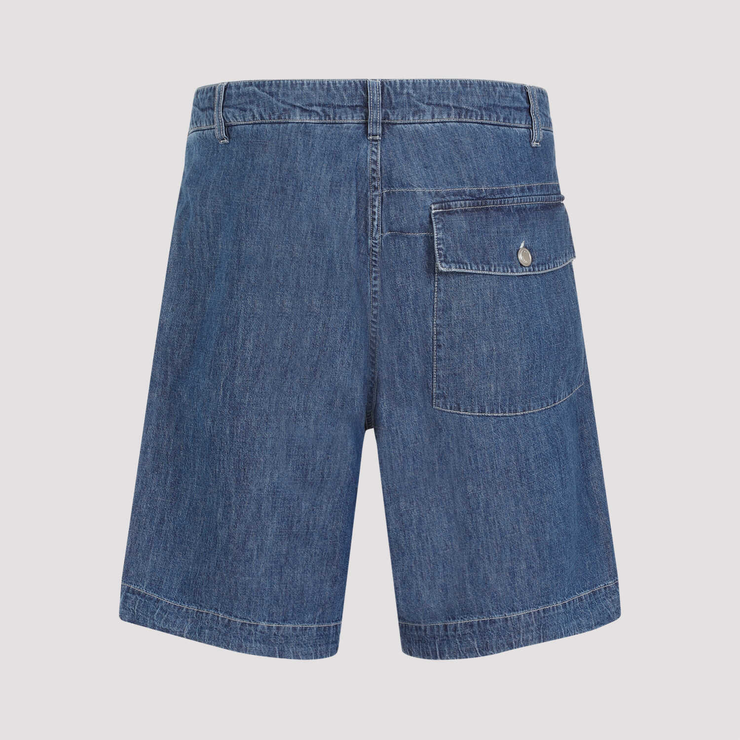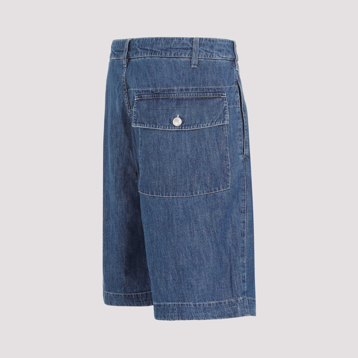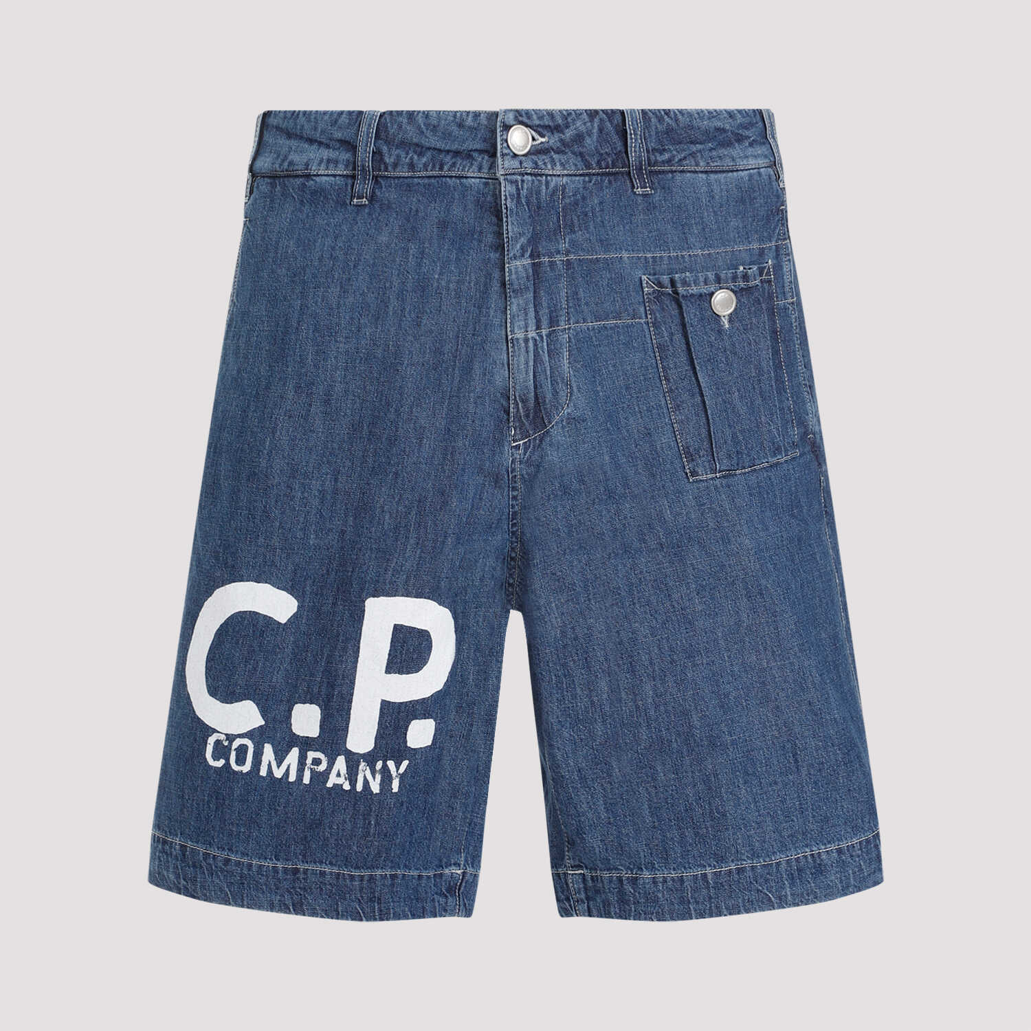 Cp Company Utility Blue Cotton Shorts. Bleached blue cotton denim, belt loops, button and fly-zip fastening on the front, inseam side pockets, expandable mini-pocket with button on the front, printed white logo on the right leg, back flap pocket, straight hem.