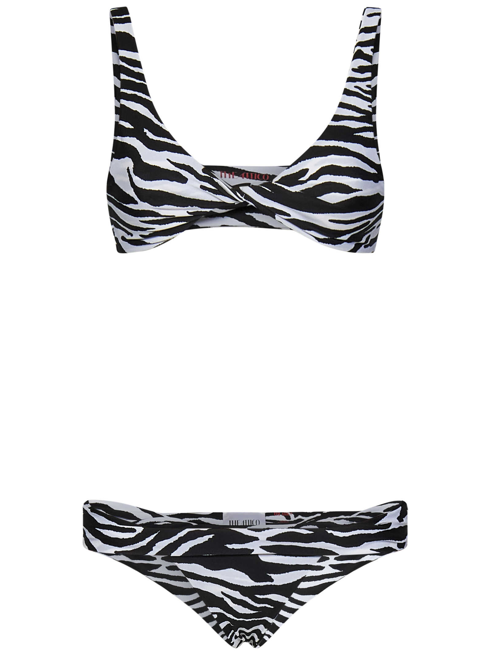 White and black zebra-print lycra bikini with torchon details and logo print.