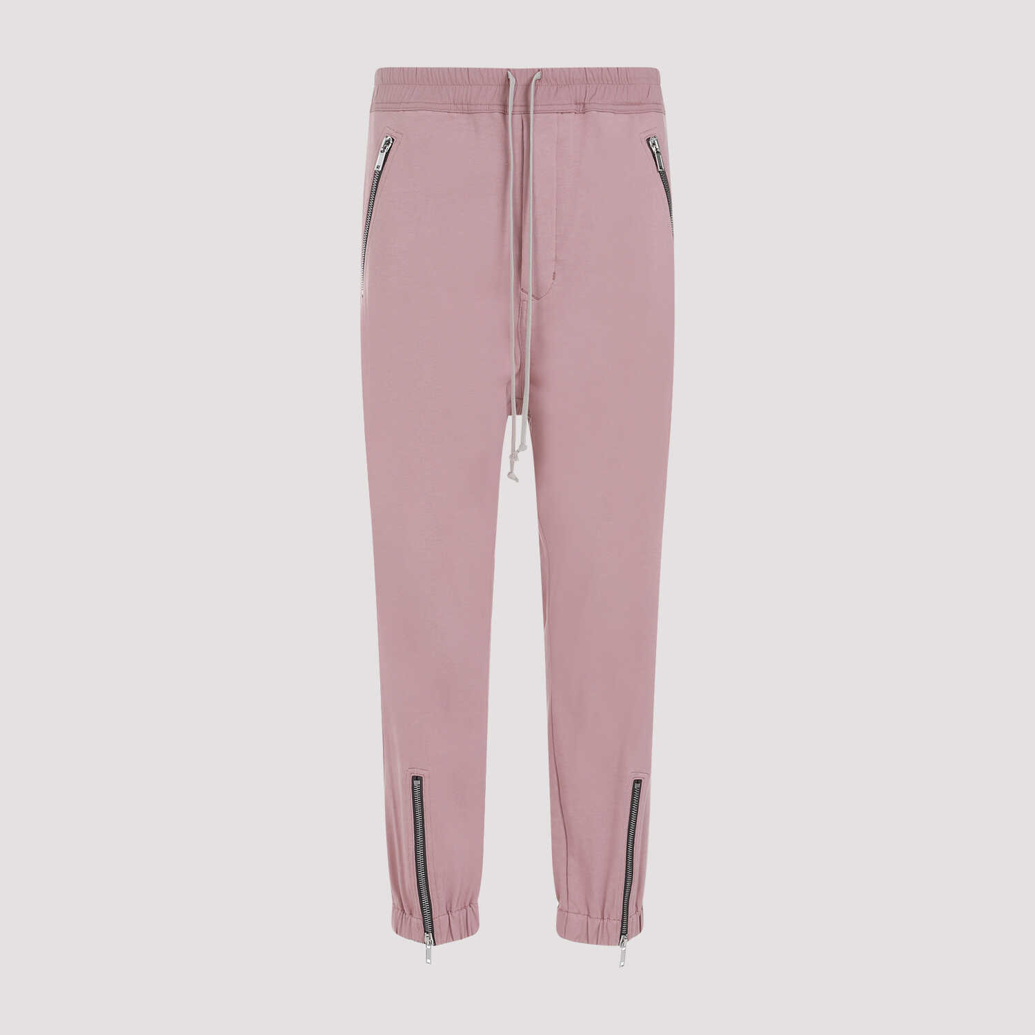 Rick Owens Tectuatl Track Dusty Pink Cotton Pants. Crafted from dusty pink cotton jersey, elastic waistband with tonal drawstring, dropped crotch, diagonal zipper pockets on the sides, buttoned welt pockets on the back, elasticated edges with front zippered slit.