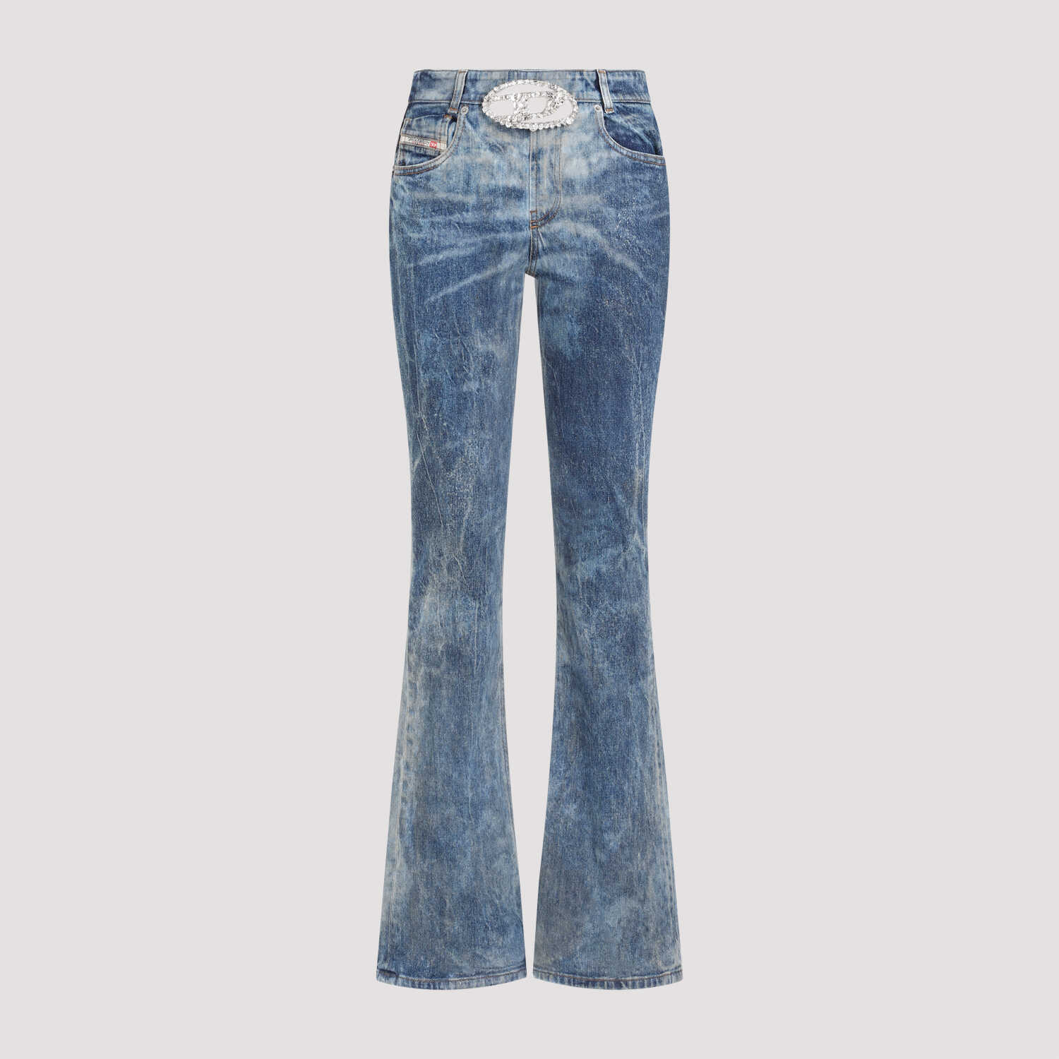 Diesel Blue Denim Cotton Jeans. Crafted in cotton, true hemp and elastane blend. Front signature oval logo with cut-out details and crystals, five pockets design, belt loops, side zipped fastening, flared leg, straight hem. Overwashed effect.