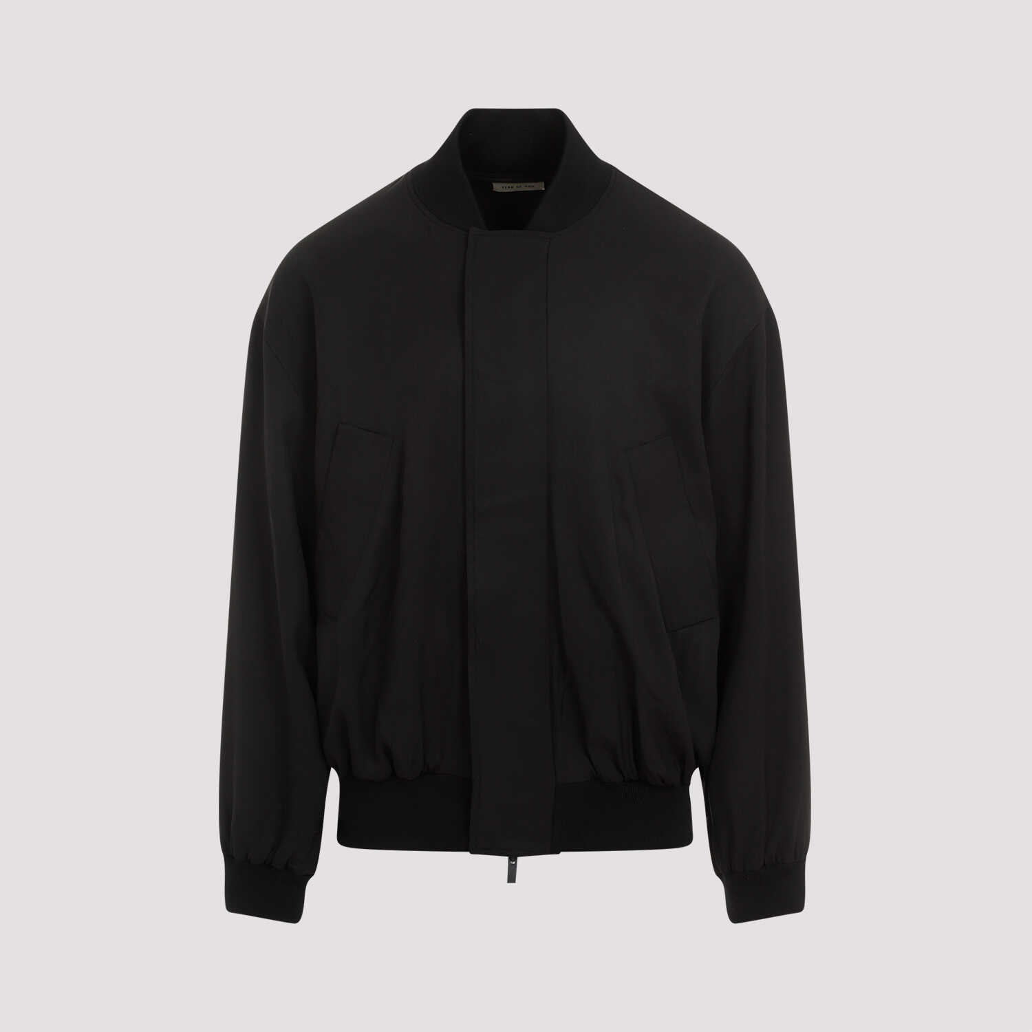 Fear of God Double Layer Black Silk-Wool Bomber Jacket. Crafted from black silk and wool, round collar, front concealed zip fastening, pockets on the front, dropped shoulders, long sleeves, ribbed edges.