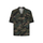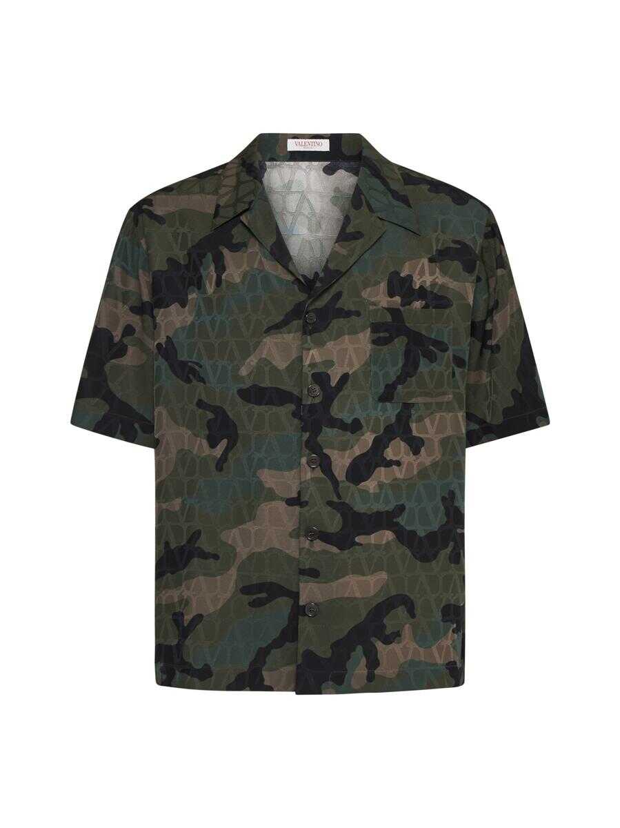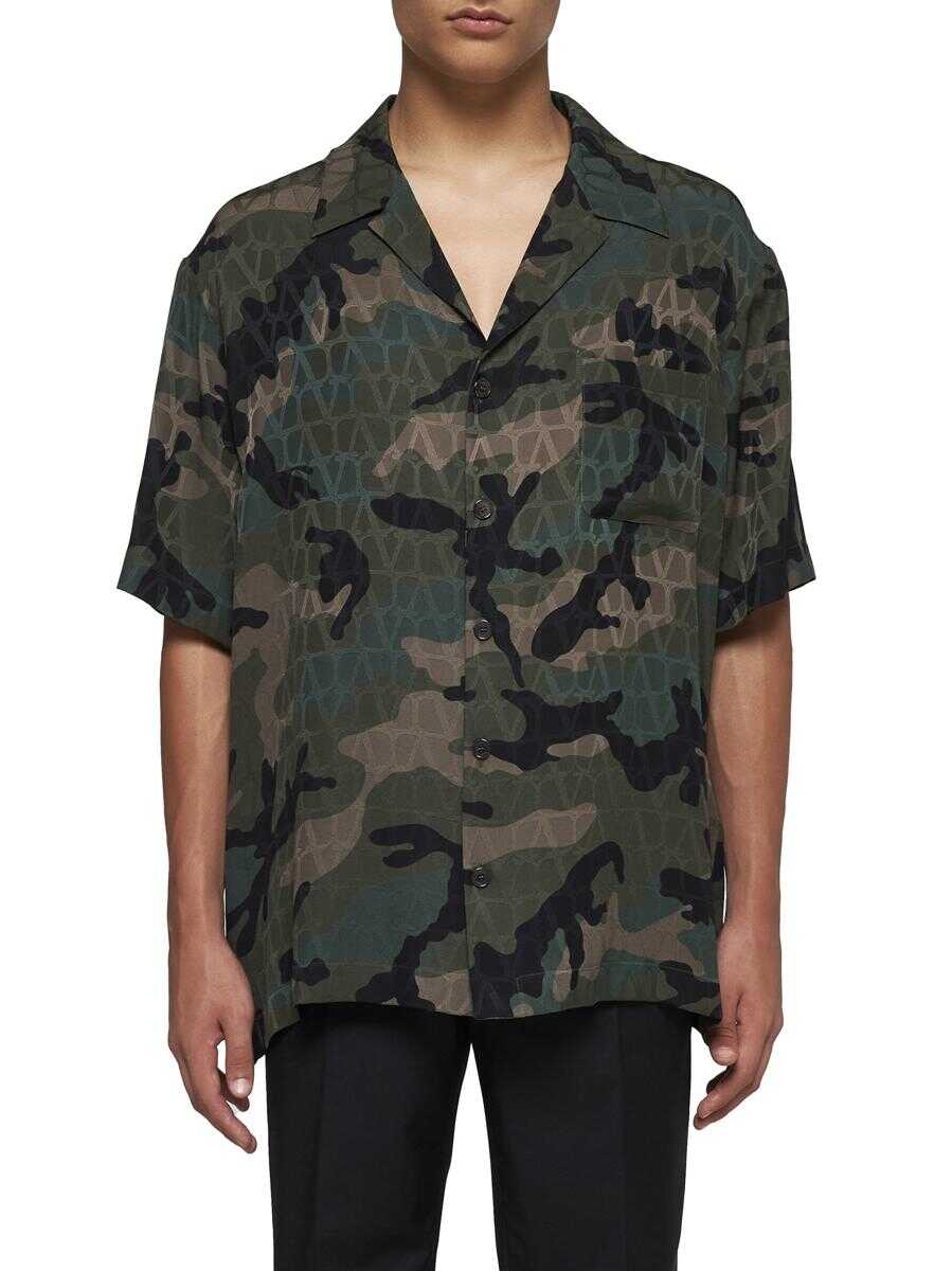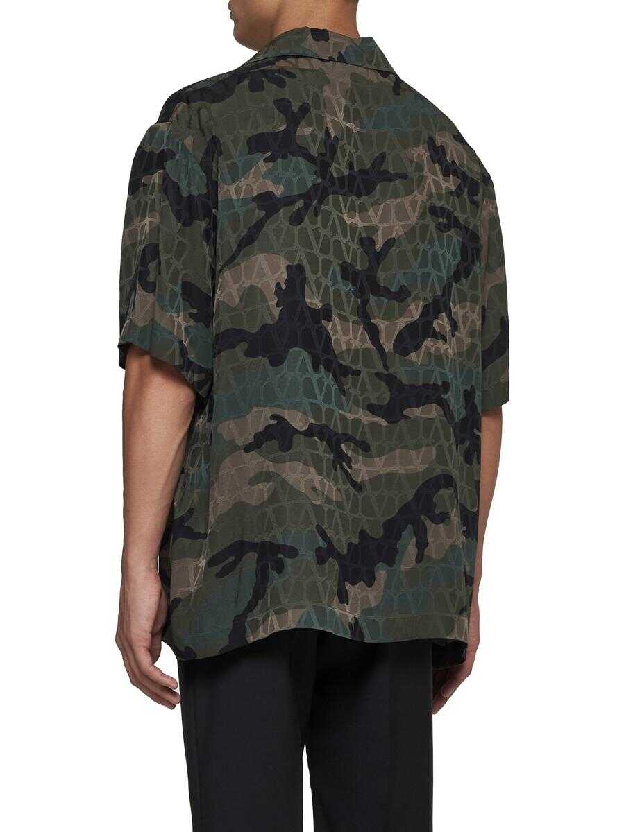 Valentino's Toile Iconographe and camouflage print silk shirt in shades of military green and khaki featuring bowling collar, front buttoning, chest pocket and straight hem. The model is wearing shoes and accessories from Valentino Garavani.