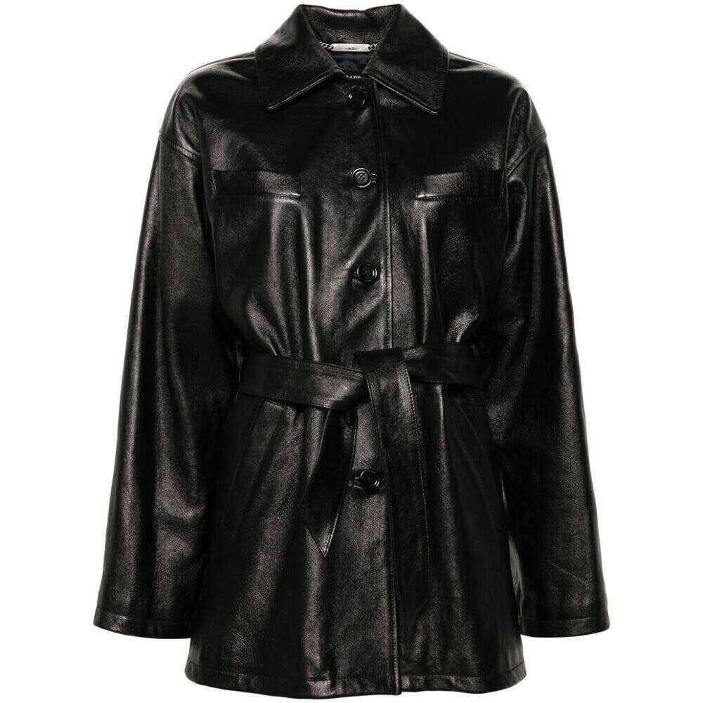 Black lambskin smooth grain front button fastening spread collar drop shoulder long sleeves belt loops detachable waist belt three front welt pockets quilted lining straight hem