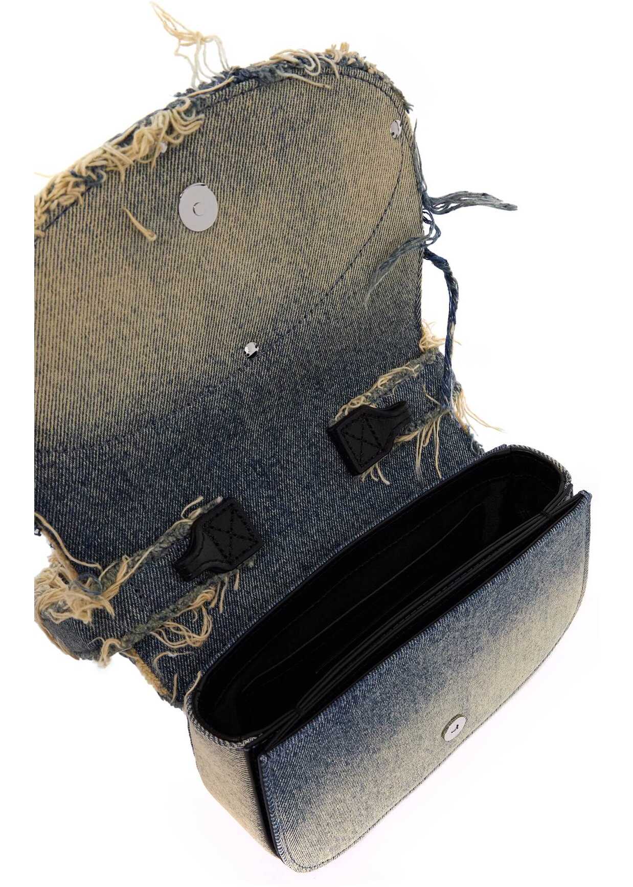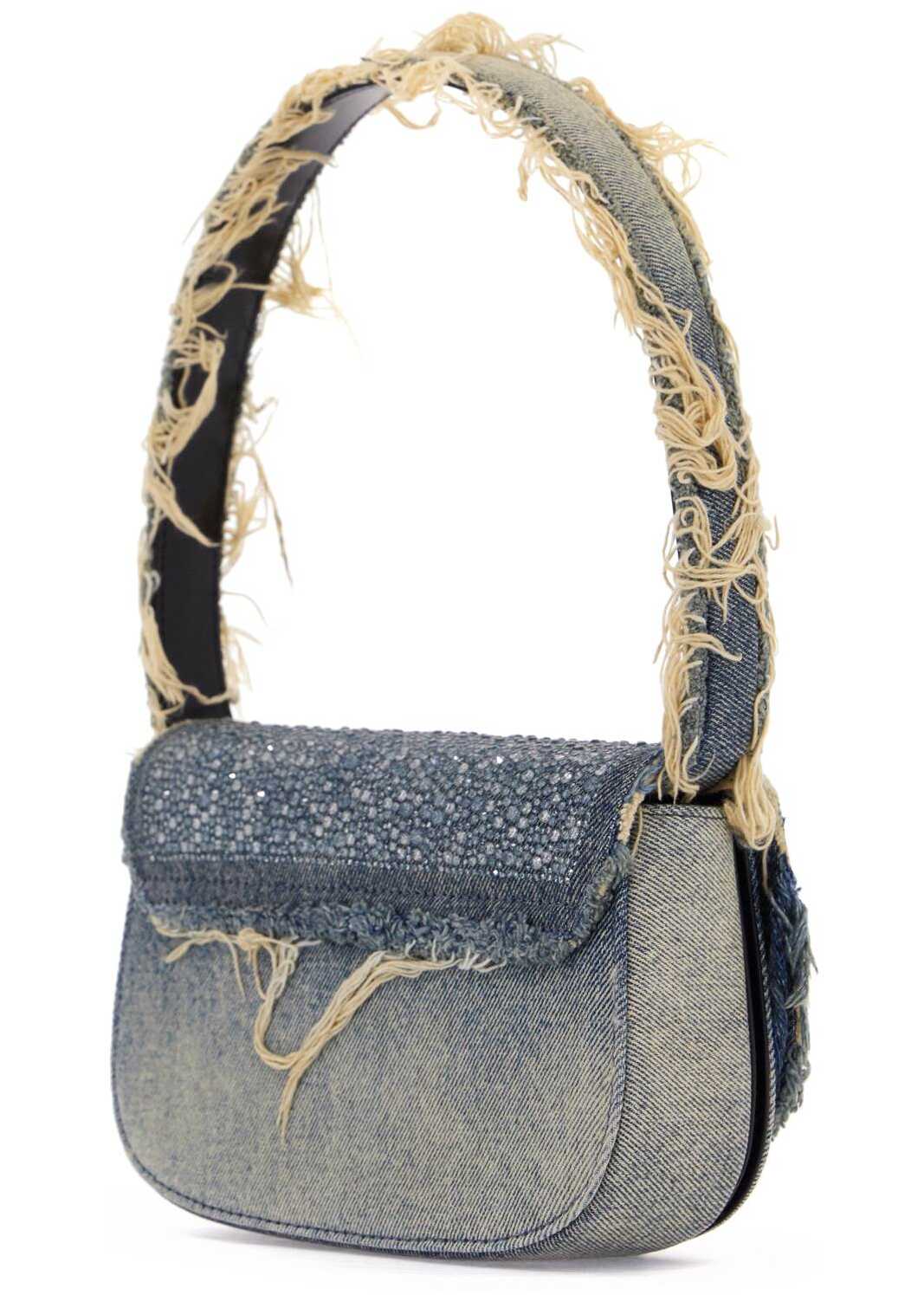 The 1DR shoulder bag is made of sun-dyed pure cotton denim and embellished with transparent crystals on the flap and Oval D plate. The design features a destroyed effect with fringed handle, magnetic closure, fabric interior with main compartment, open flat pocket, gusseted pocket, and pouch pocket. Adjustable and removable leather shoulder strap. Metallic accessories in silver finish.