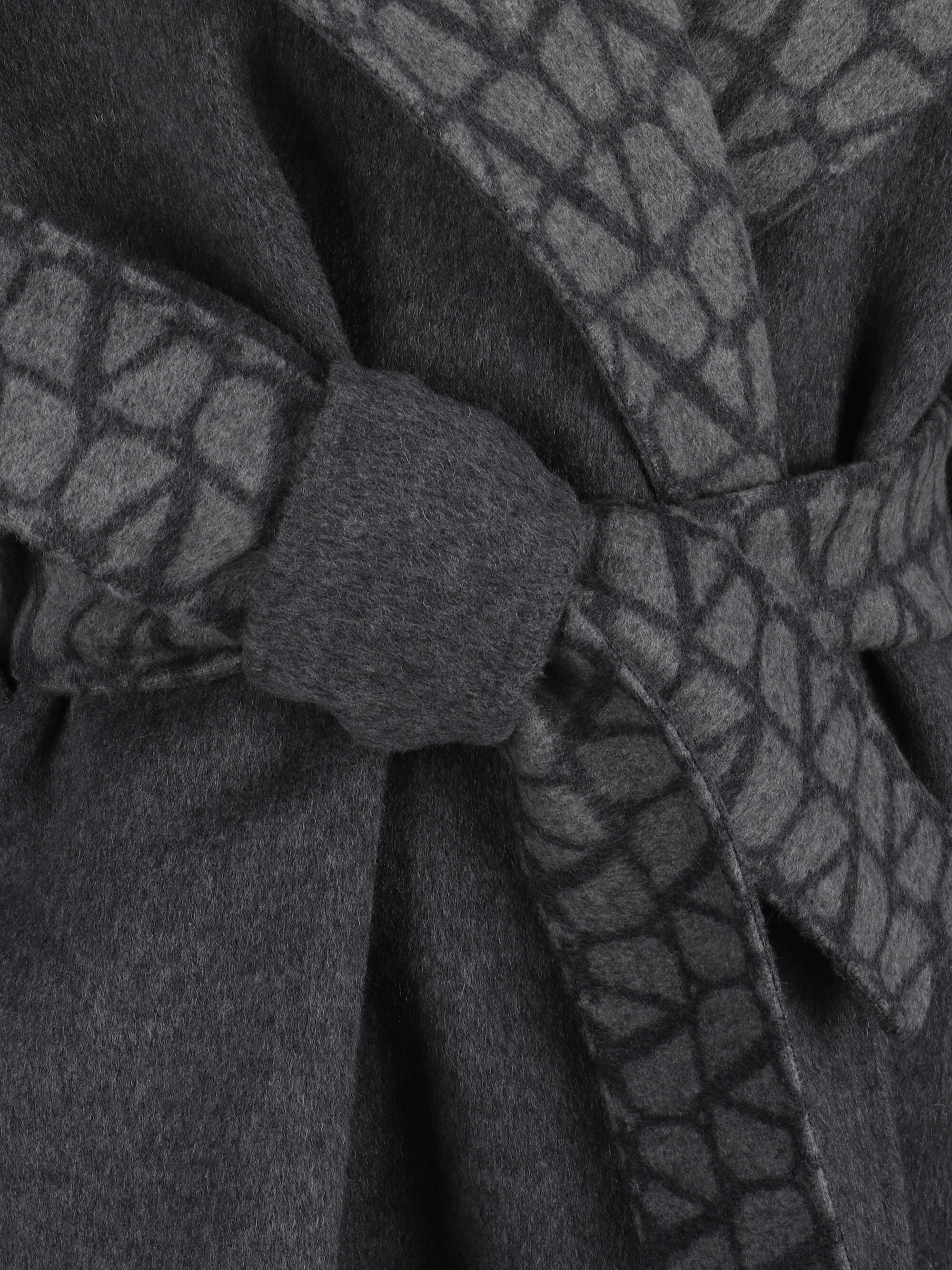 Virgin Wool Iconographe Toile Coat by Valentino, hooded design, shawl lapels, two side welt pockets, a matching removable sash that can be adjusted via a waist knot, the brand's iconic monogram printed all-over on the inside, and a regular fit.